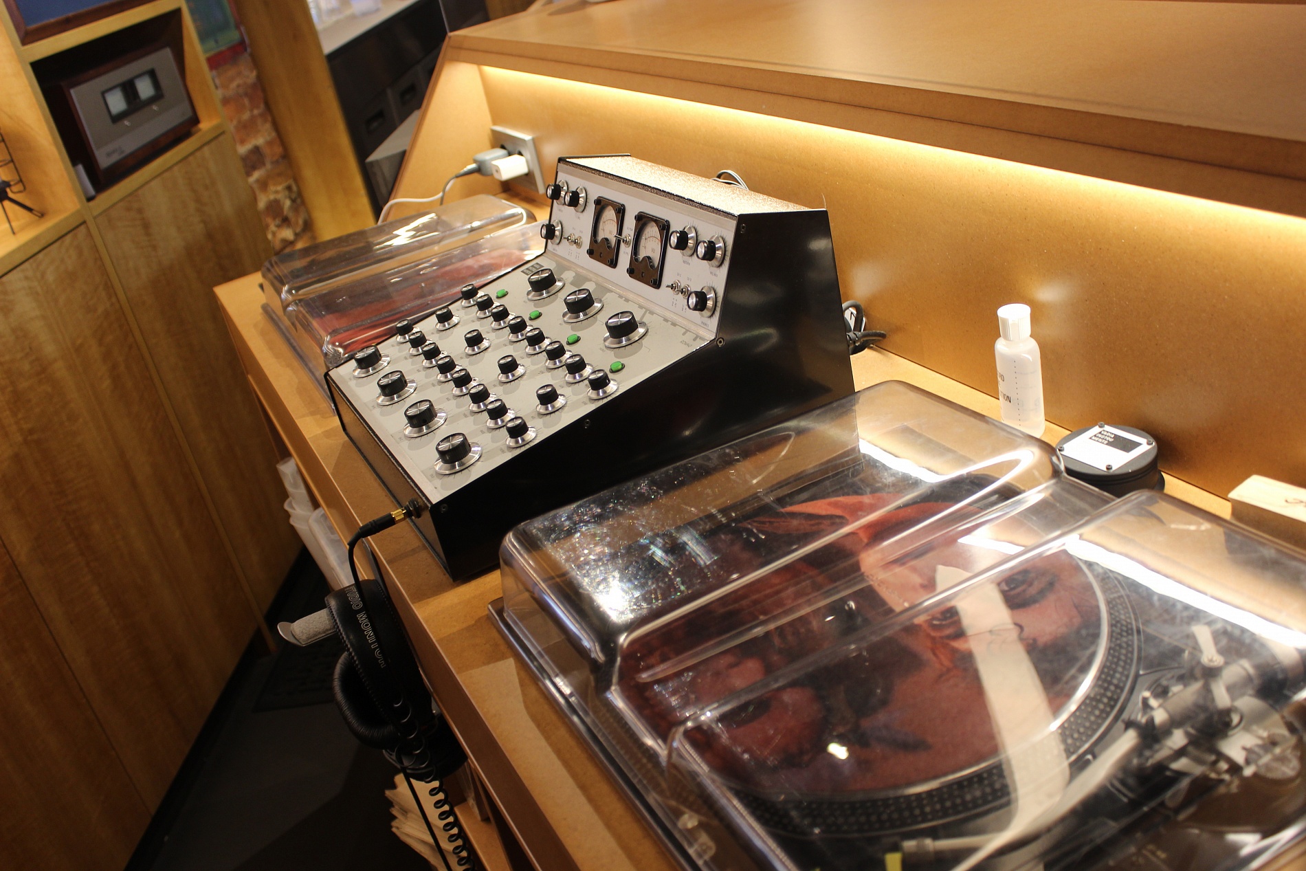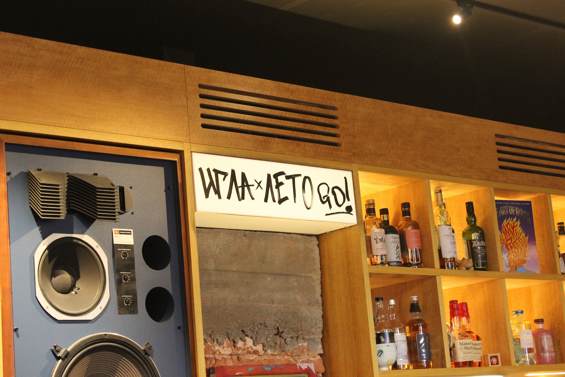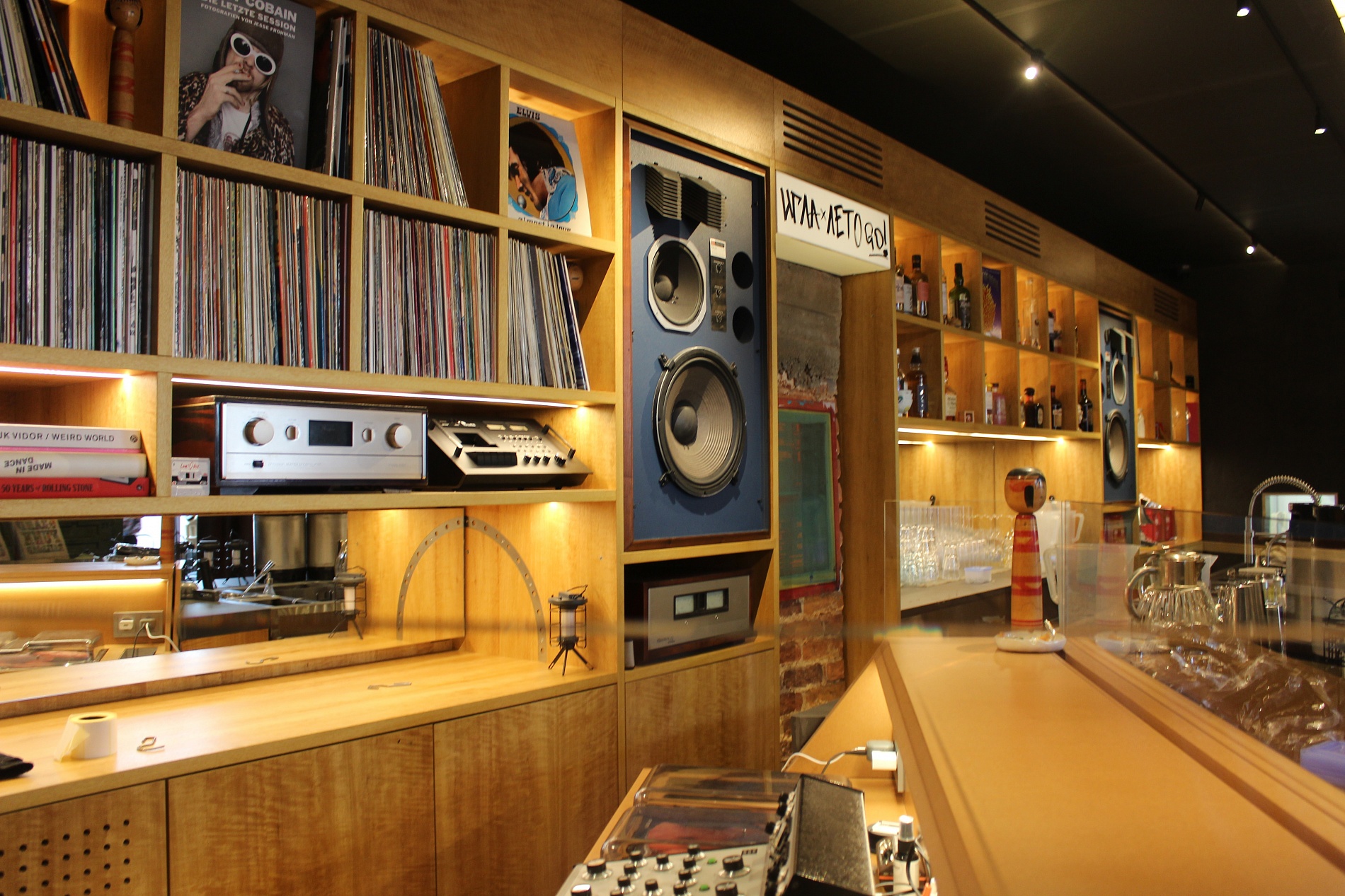 За стильным фасадом скрывается камерный зал на 25 гостей с приглушённым светом, мягкими кожаными диванами и полками с пластинками. Особое внимание — к звуку: винтажные мониторы JBL, усилители McIntosh и швейцарский роторный микшер создают идеальные условия для ценителей винила.
