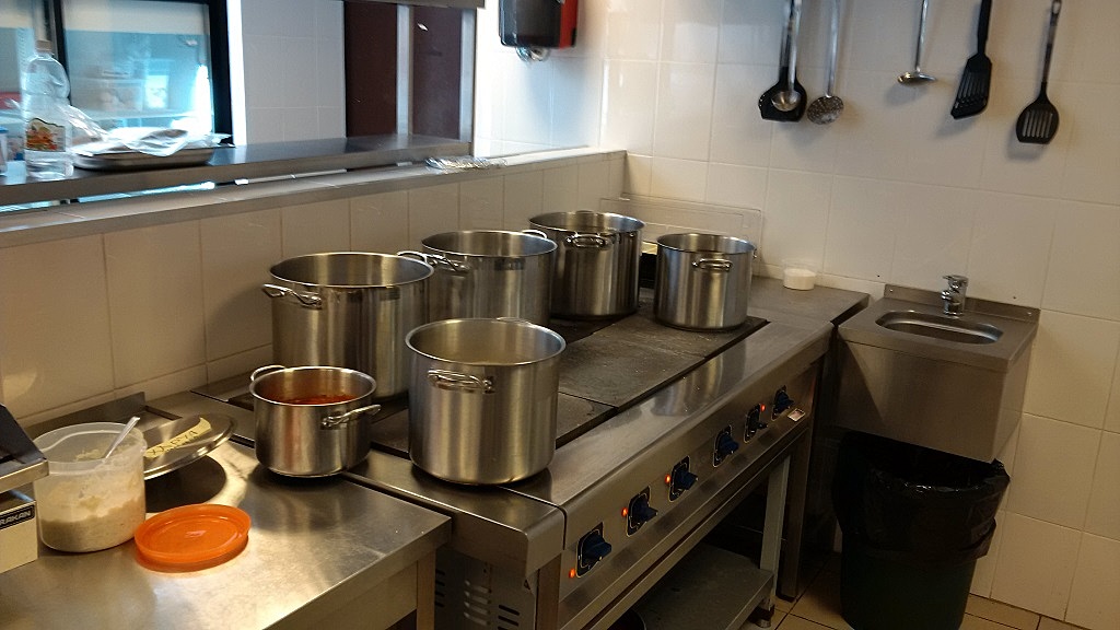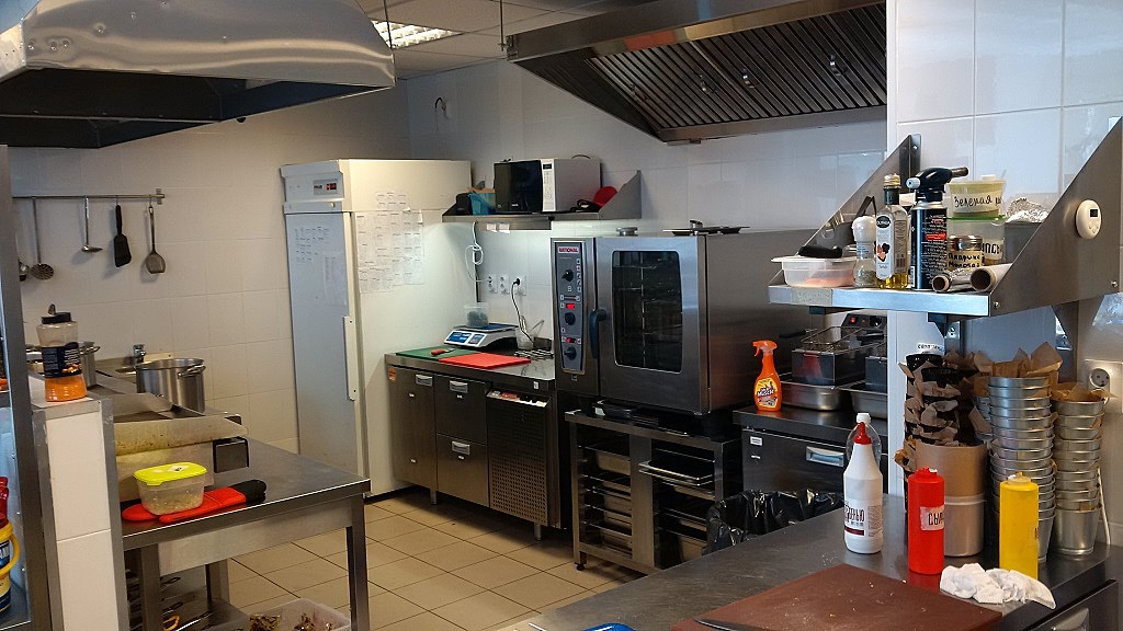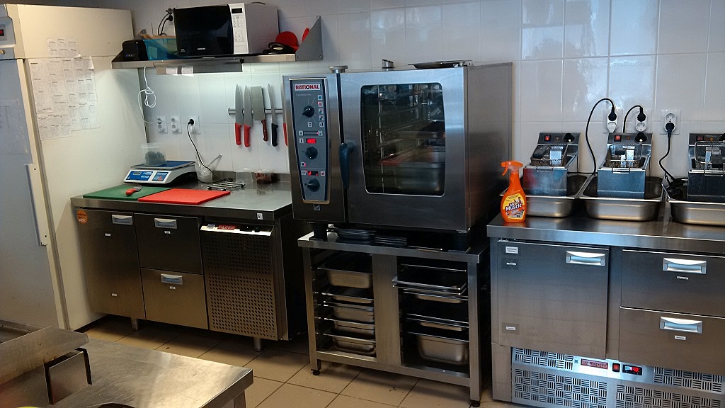 Линия приготовления горячих блюд снащена тепловым, вспомогательным, механическим, холодильным оборудованием. Элементы технологической линии имеют как пристенное, так и островное расположение, установлены в одну и две смежные линии. Тепловое оборудование это: 6-конфорочная электроплита BARTSCHER, пароконвектомат RATIONAL CM 61 PLUS с электромеханическим управлением, фритюрницы электрические GASTRORAG CZG-40, гриль саламандра GASTRORAG EB-EMH-450E.