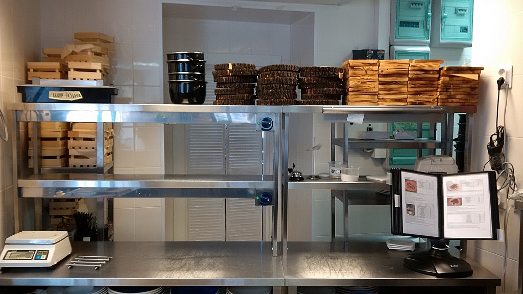 Пул холодильной техники представлен 2-мя популярными брендами: POLAIR и HICOLD. Продукты, поступающие в складское помещение, хранятся на стеллажах в соответствии с санитарными требованиями по товарному соседству, температурно-влажностному режиму, срокам хранения. Для этого предусмотрена большая низкотемпературная камера POLAIR суточного хранения (7,36 м). Часть продуктов загружается непосредственно в доготовочный цех (48,08 м), где предусмотрена среднетемпературная камера POLAIR (5,4 м). Все камеры оснащены разборными стеллажами со сплошными полками, изготовленными из нержавеющей стали.