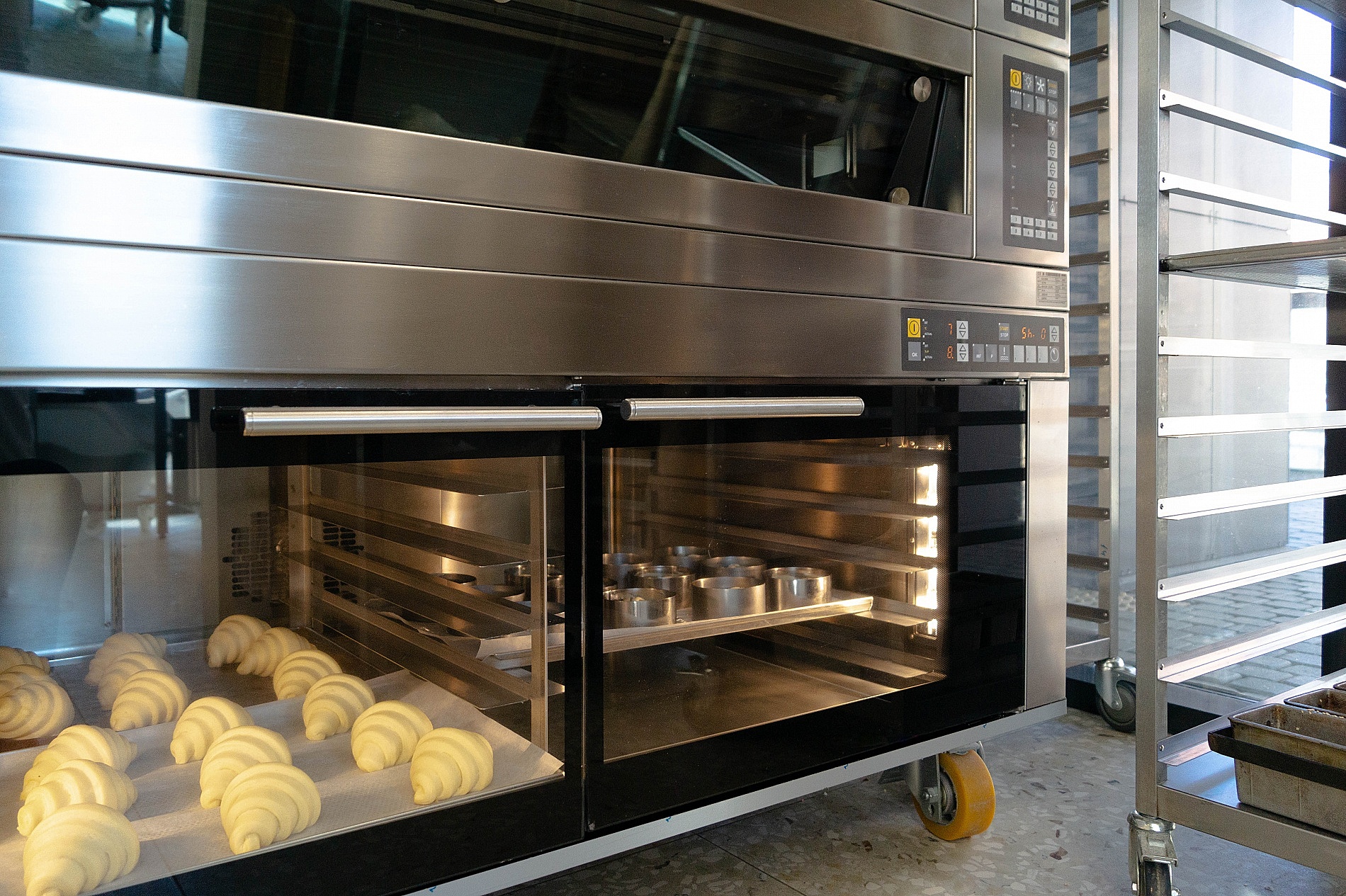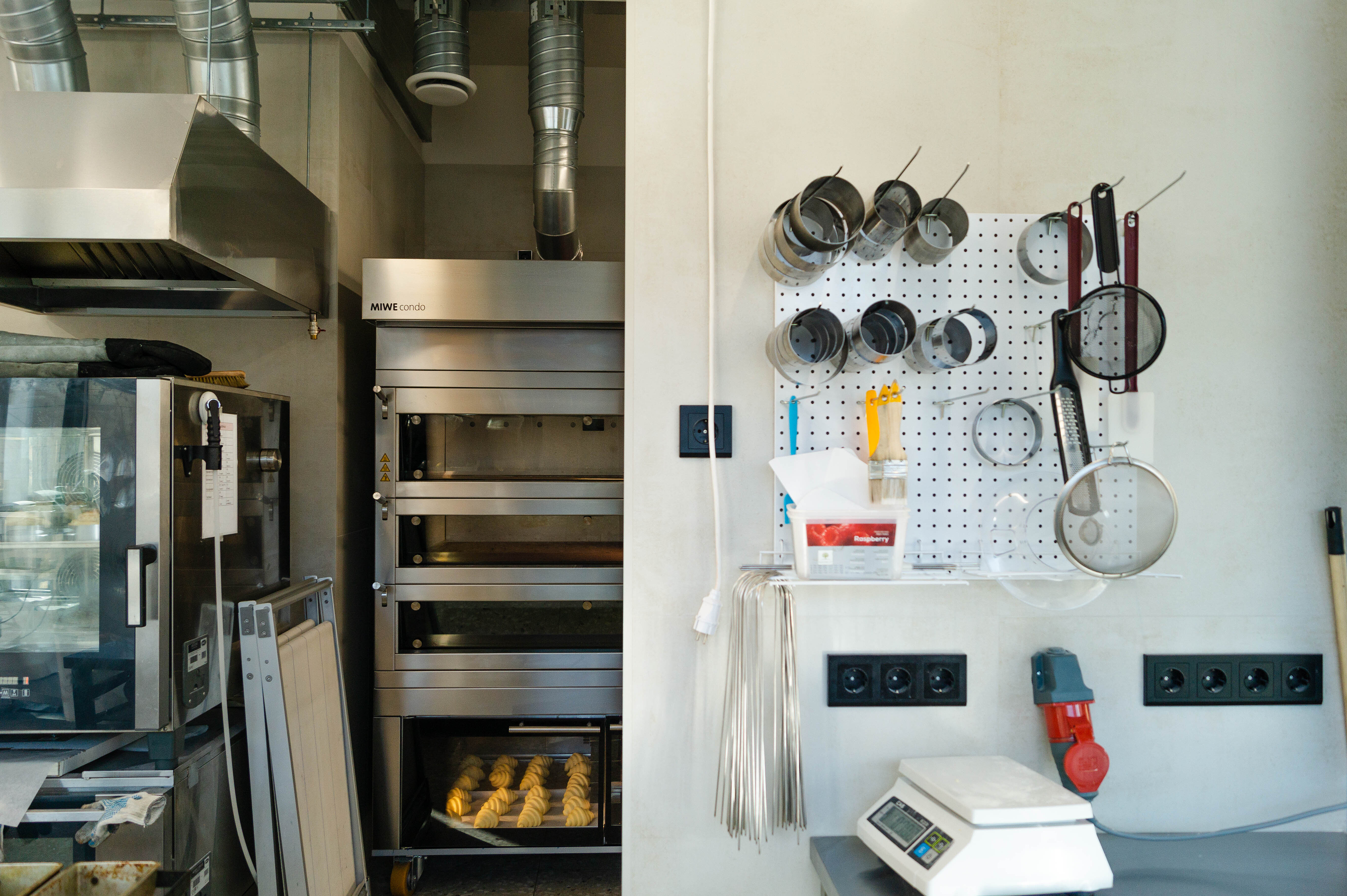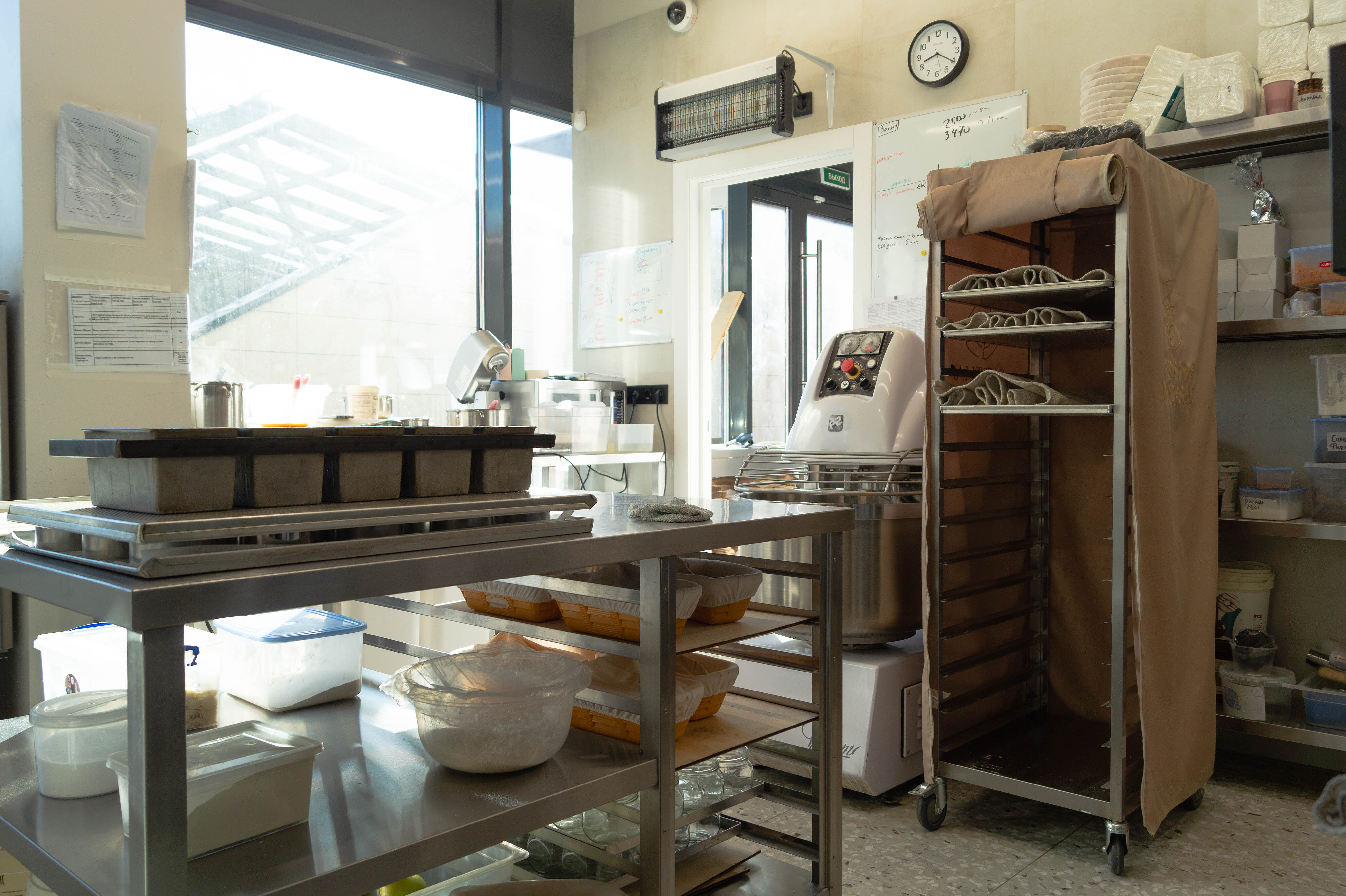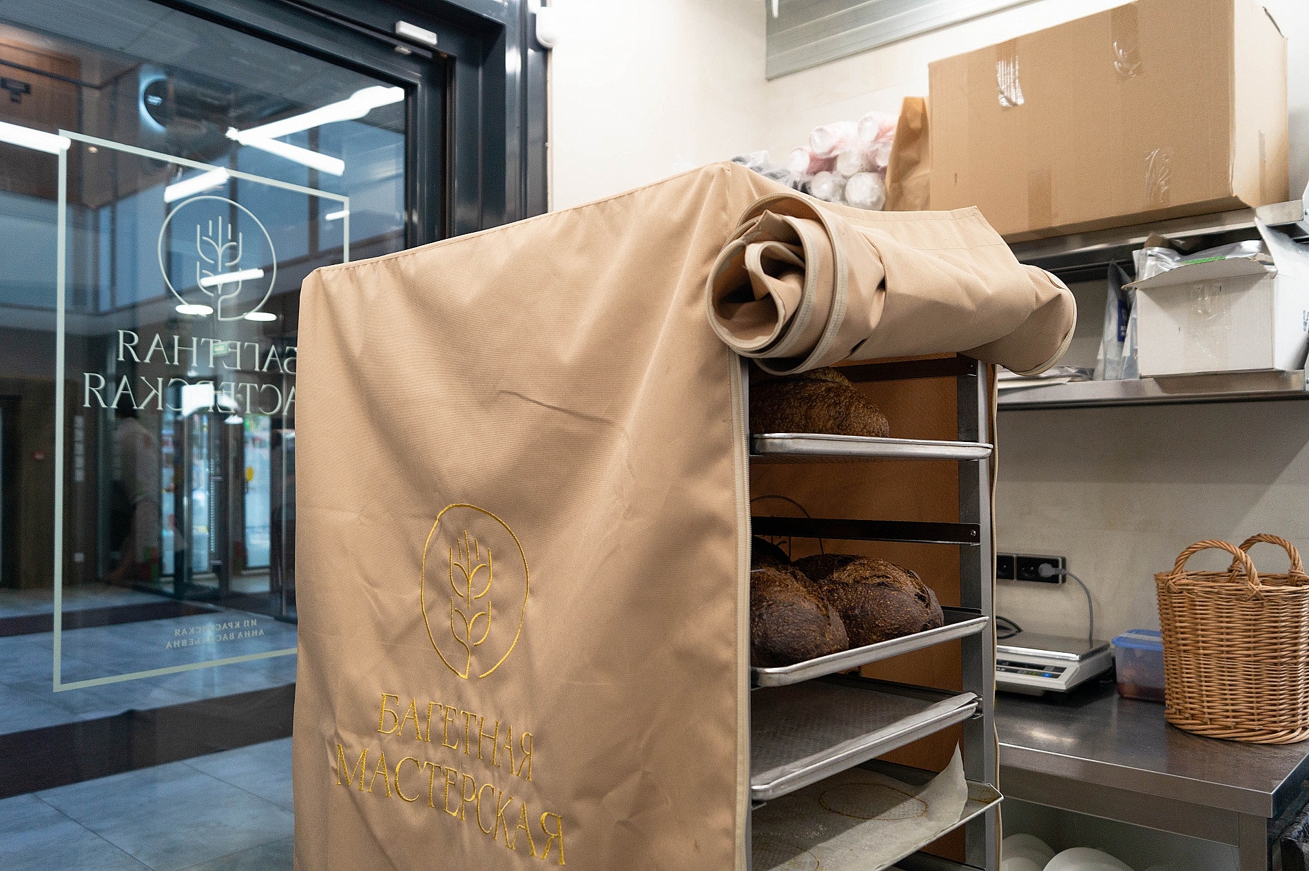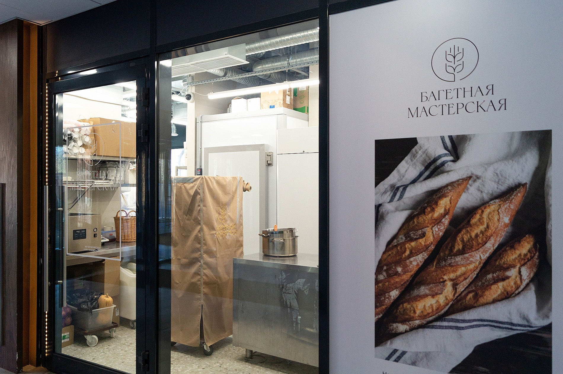 В «Багетной мастерской» расположилась полноценная лаборатория выпечки. Ведущий инженер-технолог «Алтэк» вписал пекарню полного цикла в маленькое помещение с большими окнами. Здесь замешивают тесто, делают закваску, формуют будущую выпечку и, конечно, выпекают.
