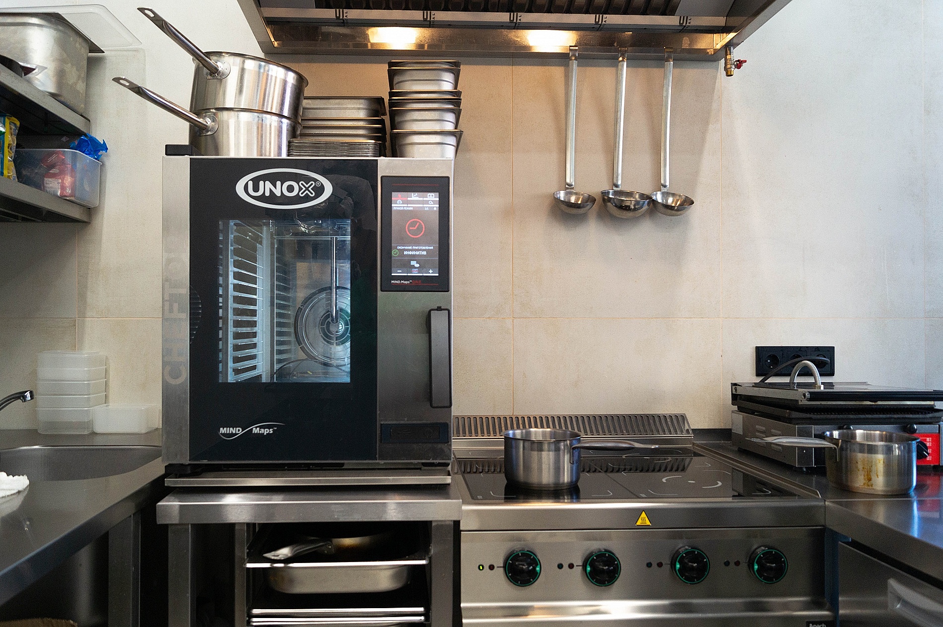 Кухня кафе оснащена качественным и надежным оборудованием.