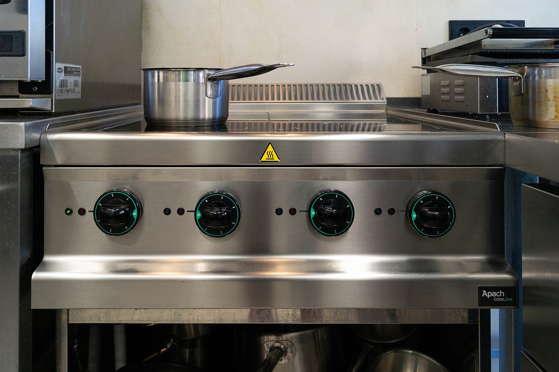 В горячей зоне установлен итальянский пароконвектомат UNOX Cheftop, индукционная плита APACH на 4 конфорки, а также контактный гриль SIRMAN, который идеально подходит для приготовления сэндвичей.