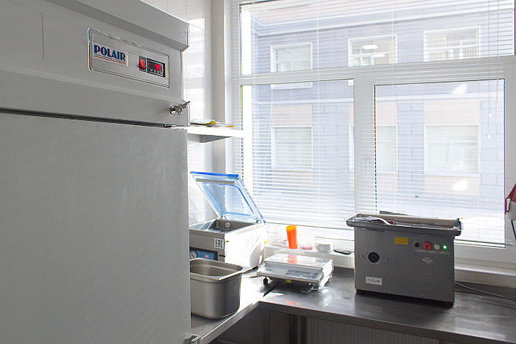 Ключевые позиции в заготовочном цехе – овощерезка ROBOT COUPE CL50 с набором дисков 1960, а также машина вакуумной упаковки JEJU JHVC-260T/1A NEW, благодаря которой значительно увеличиваются сроки хранения свежих и свеженарезанных фруктов и овощей. Вакуумная упаковка – это одна из наиболее перспективных технологий, применяемых на современной профессиональной кухне. Продукты не требуют консервации, заморозки или термообработки, сохраняя при этом витамины и полезные свойства. Нужно отметить, что подобное оснащение заготовочного цеха позволило практически снизить себестоимость готовых блюд в столовой.