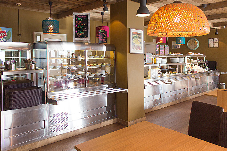 Линия раздачи оборудована закрытой холодильной витриной RADA ЗПВ-11/7Н, используемой для демонстрации, временного хранения и раздачи холодных блюд. Кроме того, на раздаче установлен холодильный шкаф БИРЮСА 152-Е, который имеет стеклянную дверь, благодаря чему в определенной степени выполняет функцию витрины – посетители всегда могут самостоятельно выбрать напитки. Шкаф вмещает до 18 бутылок.