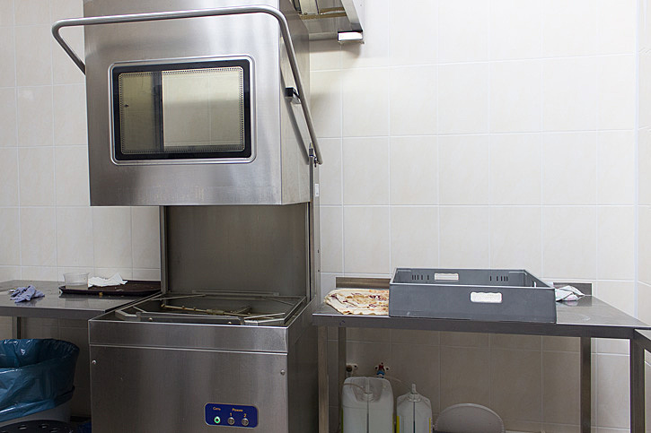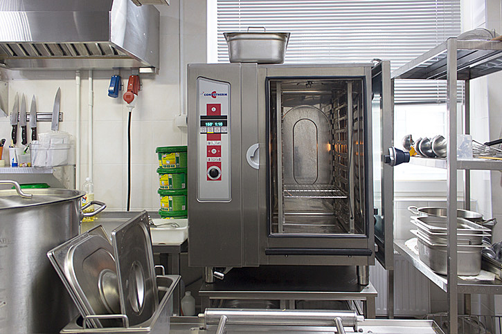 Производство столовой включает горячий, холодный, заготовочный цех, а также моечную столовой посуды. Их оснащение было доверено специалистам группы компаний «Алтэк». Основу горячего цеха составляет тепловое оборудование отечественного производства – плита и сковорода бренда ABAT. Кроме того, на кухне установлен электрический пароконвектомат CONVOTHERM OES 10.10 Standard + CONVO Clean инжекторного типа. Он вмещает 11 гастроемкостей GN 1/1 или 7 пекарских листов 600*400 мм. Аппарат оснащен вентилятором с автореверсом и ручным душем.