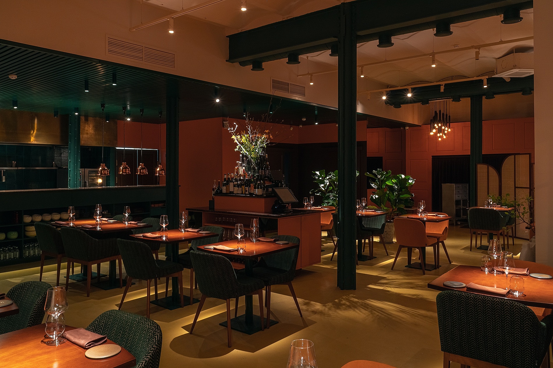 Из зала хорошо просматривается зона, где установлен пароконвектомат RATIONAL – главный помощник на профессиональной кухне любого заведения. За барной стойкой смонтирован по сути весь тепловой остров – плиты TECNOINOX, ATA, холодильные столы HICOLD, которые выполняют функции рабочих поверхностей и модулей для хранения заготовок, а также ряд настольных электромеханических аппаратов и кухонный инвентарь.
