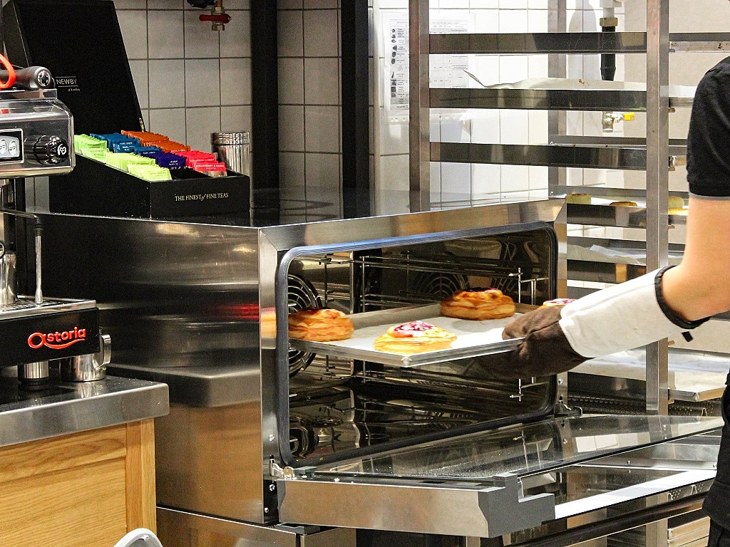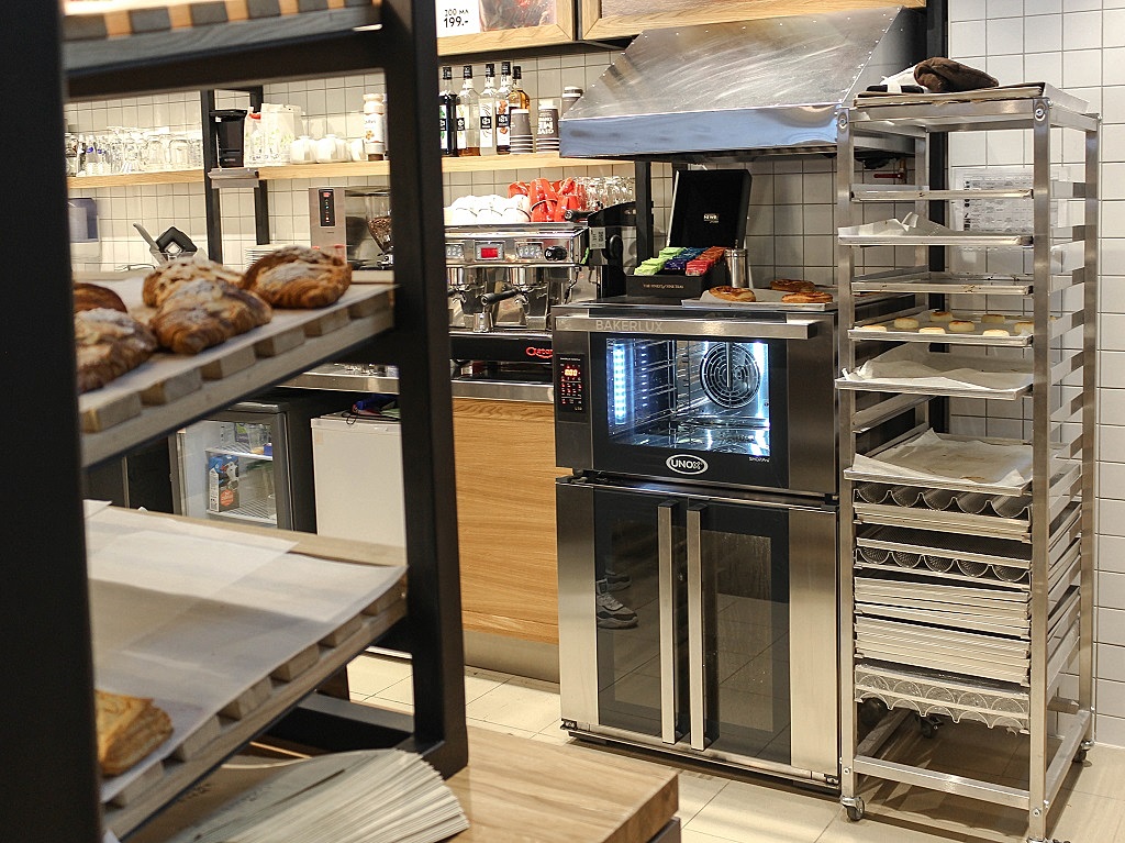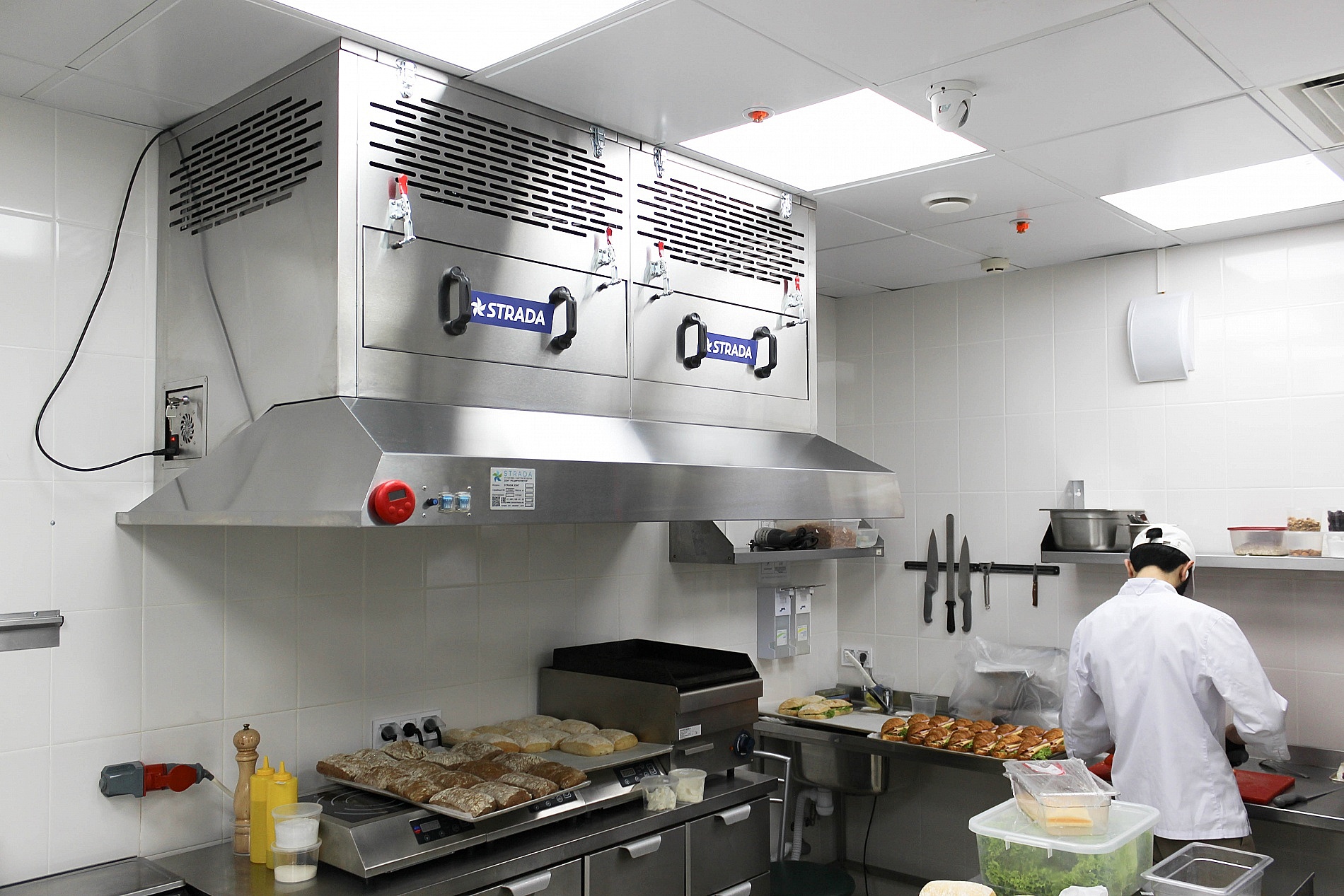 Замороженные заготовки выпекаются прямо на бэк-кухне, расположенной возле корнера. Мощный вентиляционный зонт STRADA 2000 фильтрует воздух на кухне, эффективно очищая его от запаха, жира и сажи.