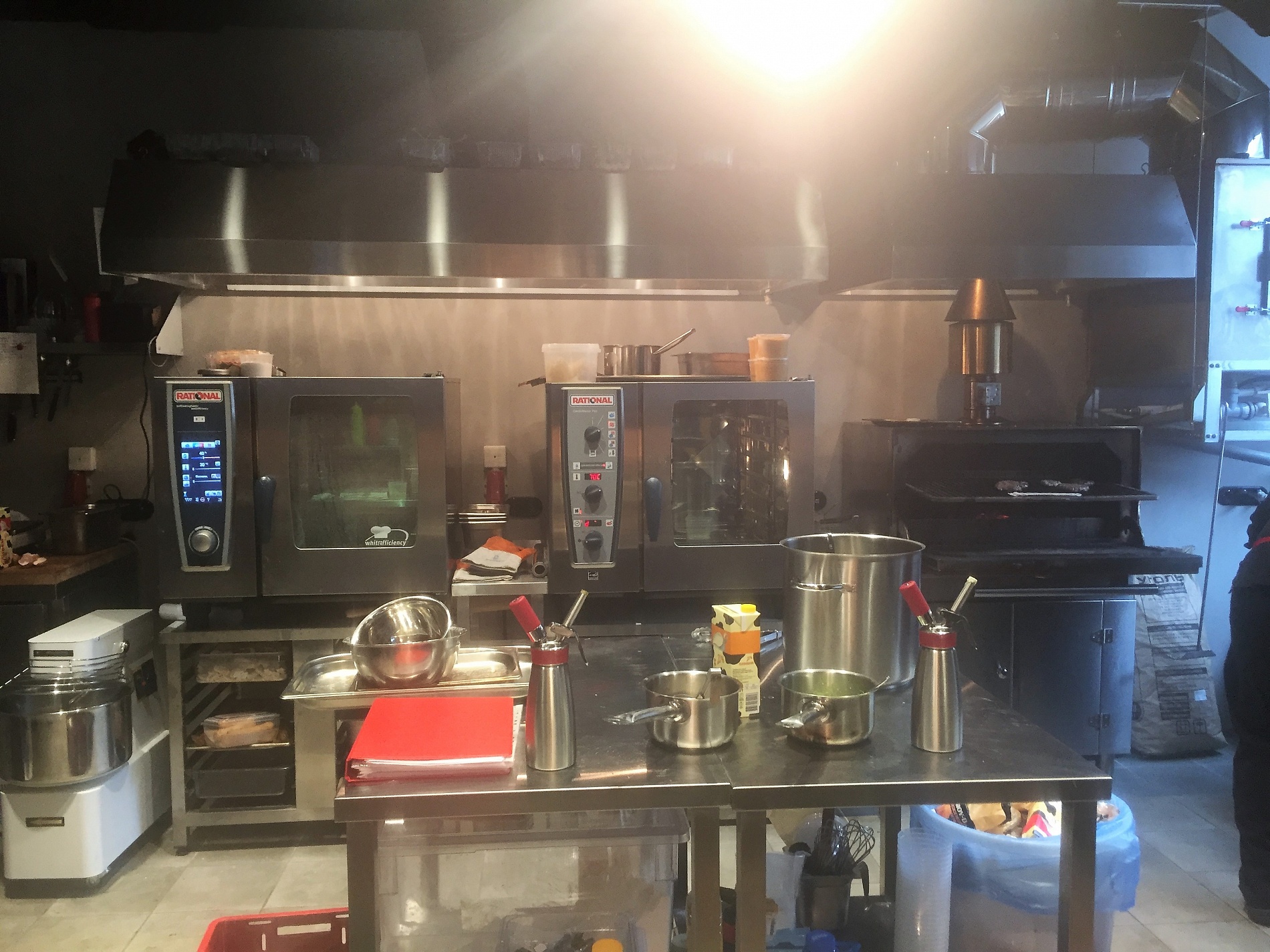 На пространстве первого этажа установлены два 6-ти уровневых аппарата RATIONAL – из линейки SelfCookingCenter® и CombiMaster® PLUS. Зачем это нужно? Пока один пароконвектомат выпекает, к примеру, булочки для бургеров при определенной температуре и влажности, во втором можно жарить мясо, запекать морепродукты или варить пасту и равиоли.
