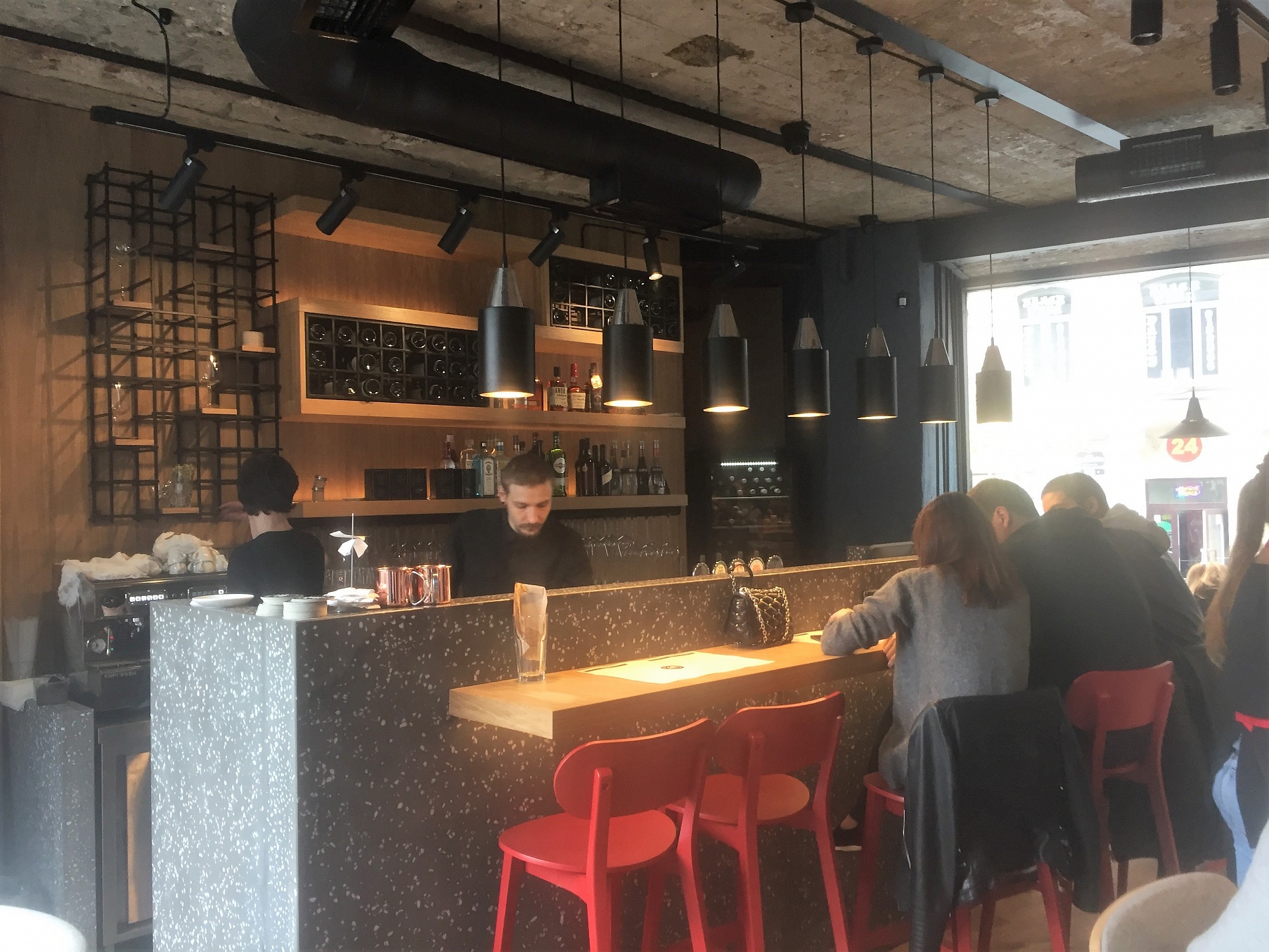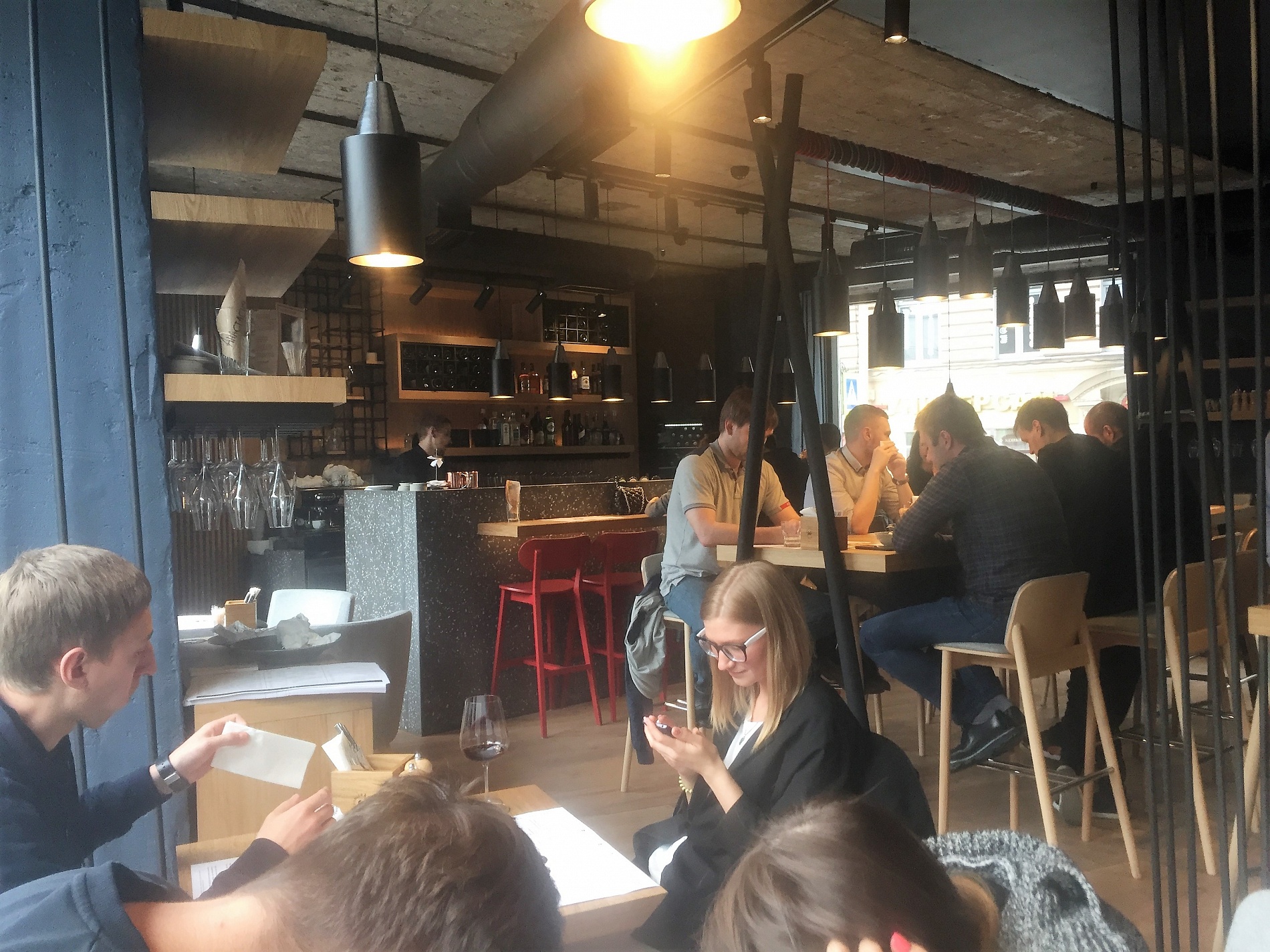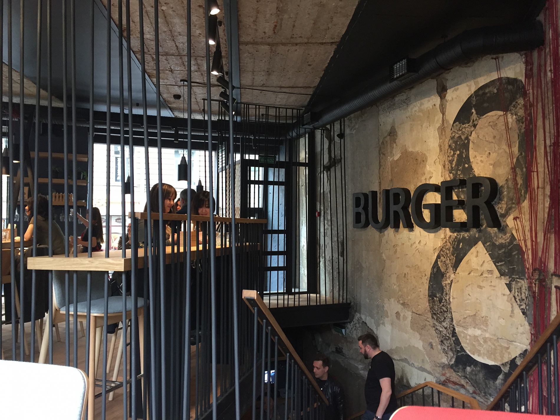 Ресторан занимает 2 этажа. Его дизайн выполнен в духе современного времени: нарочито неприкрытые металлические системы вентиляции, выставленные напоказ конструкции, фиксирующие элементы освещения, неоштукатуренные стены, дощатый пол и вместе с тем, добротная мебель из древесины, качественная барная стойка, изготовленная по индивидуальному проекту. Очевидно, что разработчики дизайн-проекта ресторана – студия DA Architects – вдохновлялись темой лофт-пространства, где торжествует синергия света, металла и бетона.