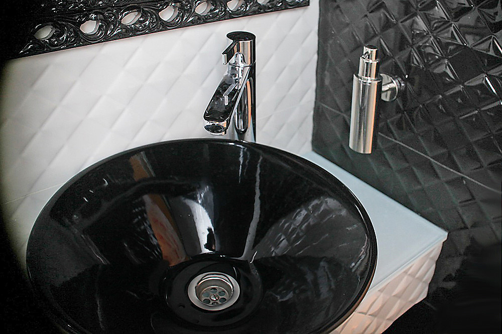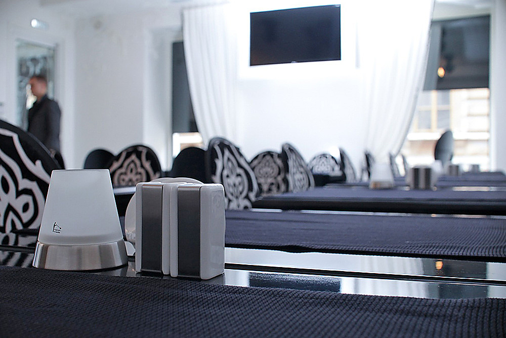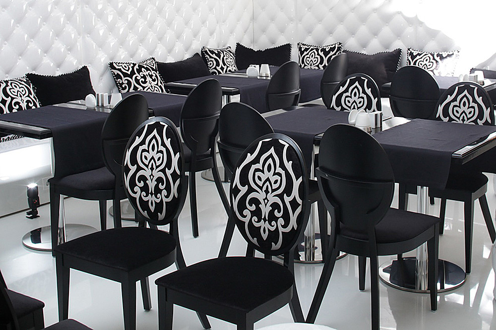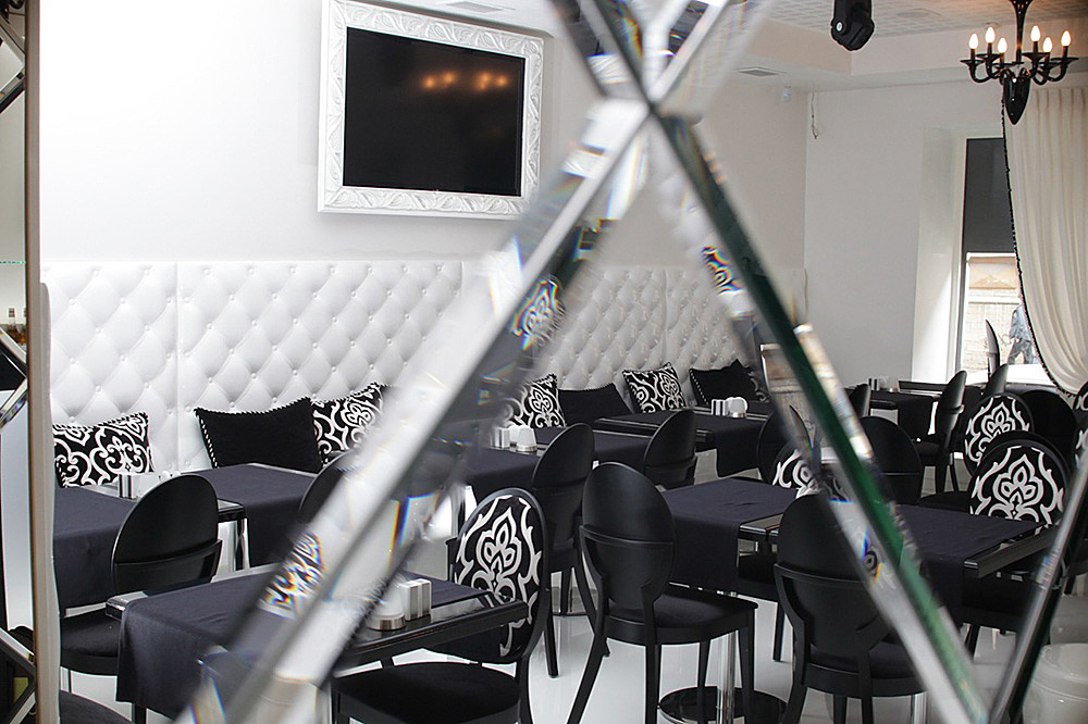 Кафе Luxury сделано по всем правилам модного кафе: черно-белая гамма с модерновыми орнаментами-завитками, глянцевые диваны и люстры, плазменные панели, на которых транслируются модные показы.