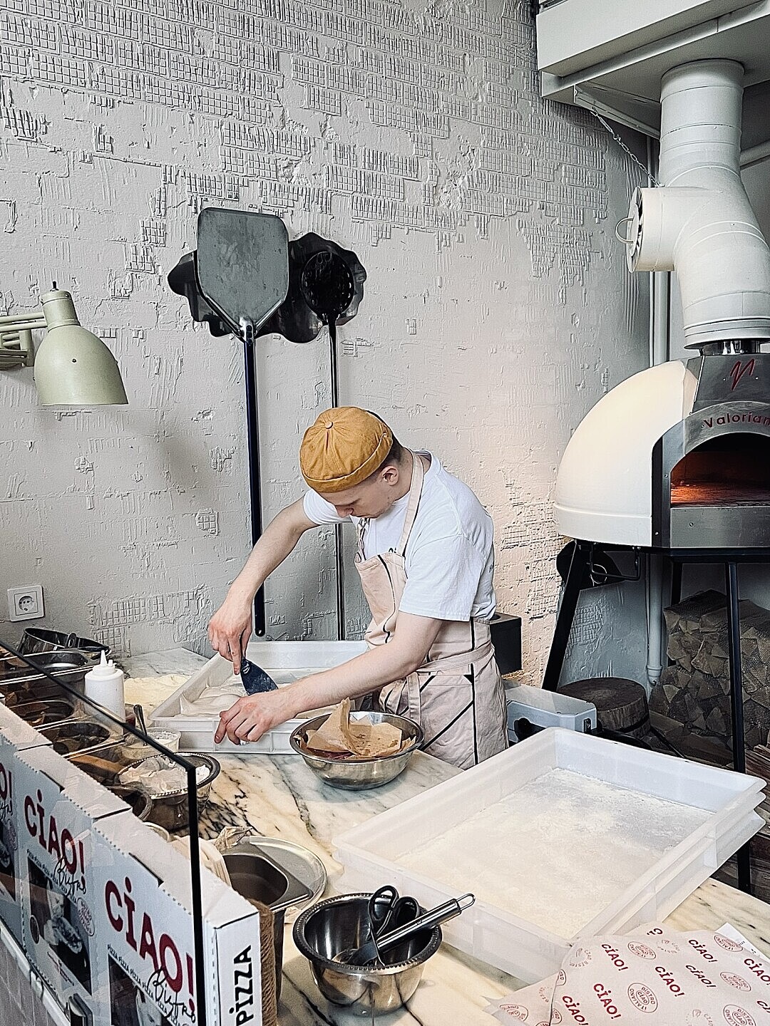 Главное достояние заведения это конечно, настоящая дровяная печь VALORIANI BABY, которая гарантирует аутентичный вкус пиццы. Благодаря мобильности она подходит для профессионального и домашнего использования. Одновременно в ней готовят 2-3 пиццы. Помимо этого с её помощью можно делать хлеб, блюда гриль, запекать мясо. Также она подойдет для блюд традиционной русской кухни, где требуется томление и длительная выдержка при медленном понижении температуры. Может работать на дровах, древесном угле и газе.