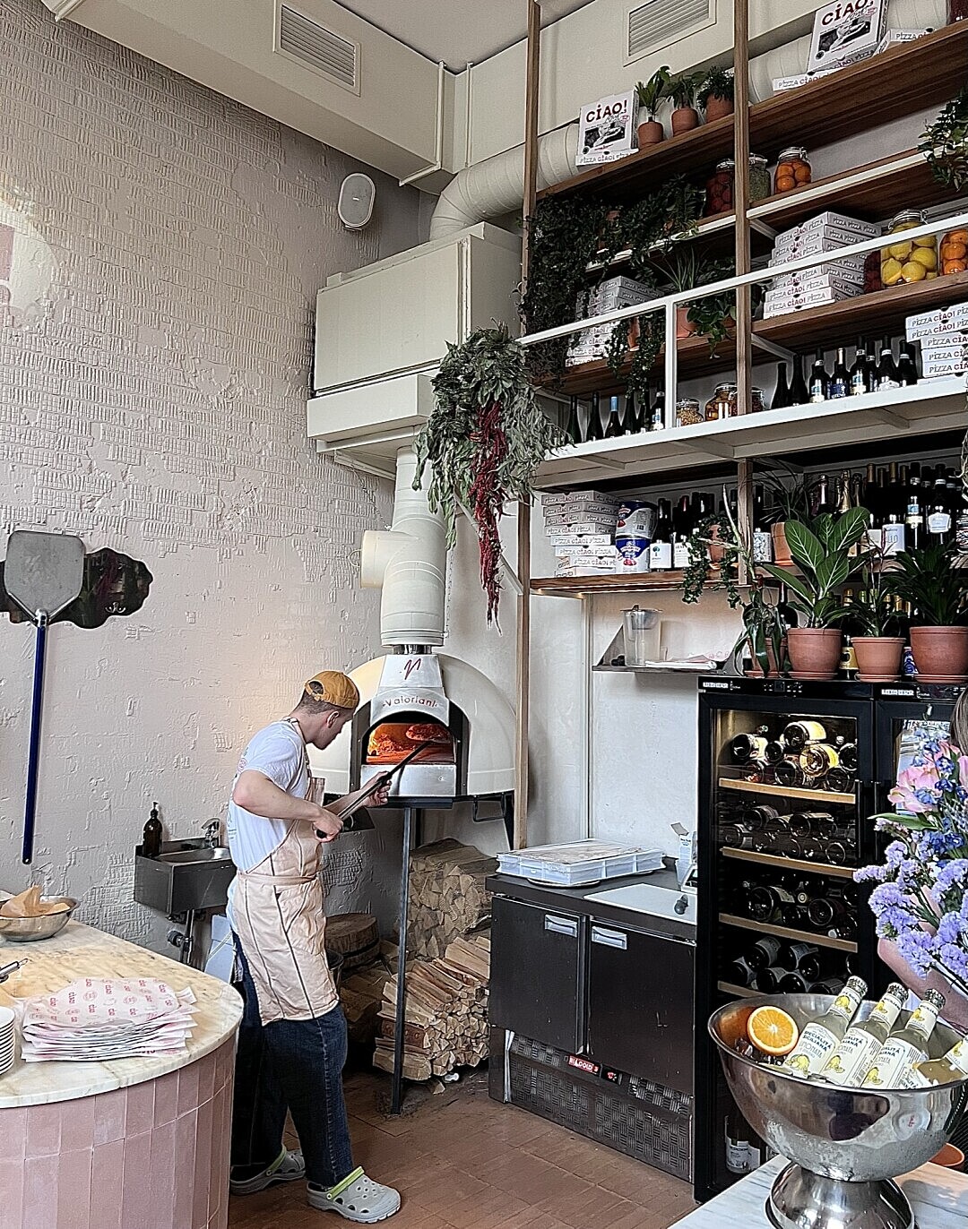 Особое настроение задает традиционная дровяная печь Valoriani. Ее огонь виден практически отовсюду. Готовят в ней правильную неаполитанскую пиццу с опаленными бортиками, тонкой и очень хрустящей корочкой. Выпекают ее по всем канонам при температуре 500 градусов за 50 секунд, а само тесто выдерживается минимум 72 часа.