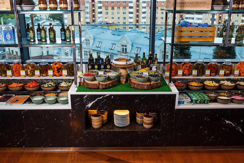 Традиционную белорусскую кухню и европейские блюда можно попробовать в ресторане Ember, которым руководит шеф-повар Геральд Рейхштайн и су-шеф Дмитрий Захаров. Особую атмосферу здесь создает открытая кухня и установленная печь для пиццы MORELLO FORNI с крутящимся подом. Помимо пиццы, можно угоститься борщом и драниками.