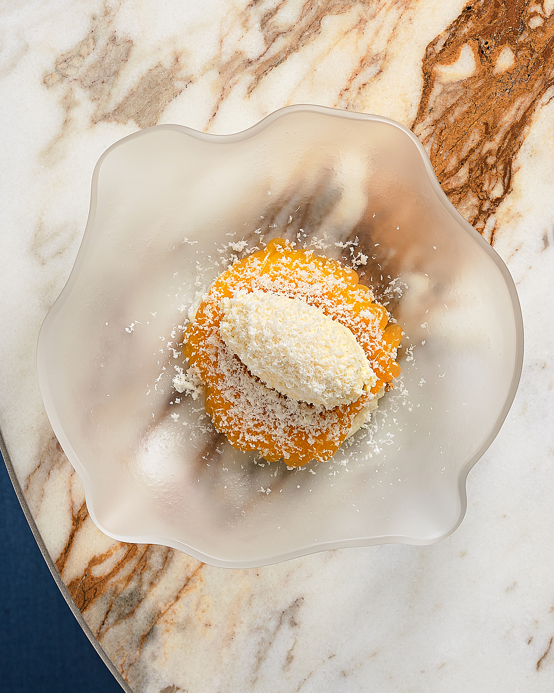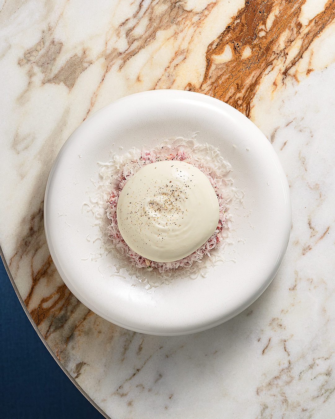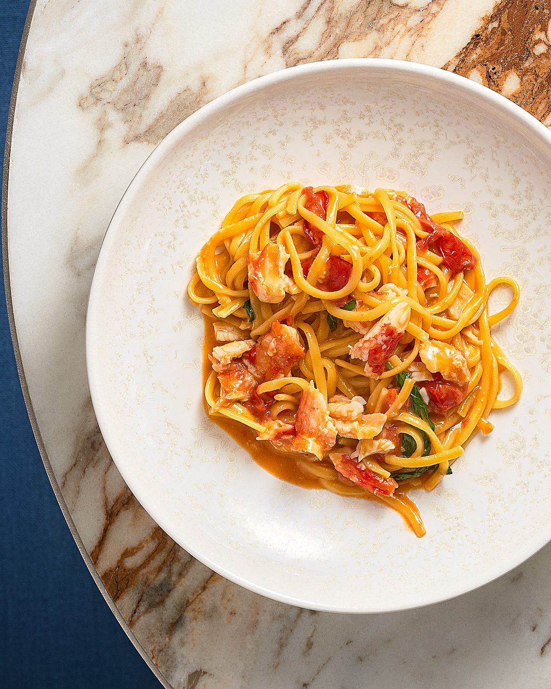 пате из брокколи с кедровыми орехами, спагетти с камчатским крабом, севиче из тунца с огурцом и кинзой, желтохвост с черным трюфелем и хреном, пирог с бычьими хвостами и сыром таледжио, осьминог с соусом Ромеско, молодая капуста с черным трюфелем.