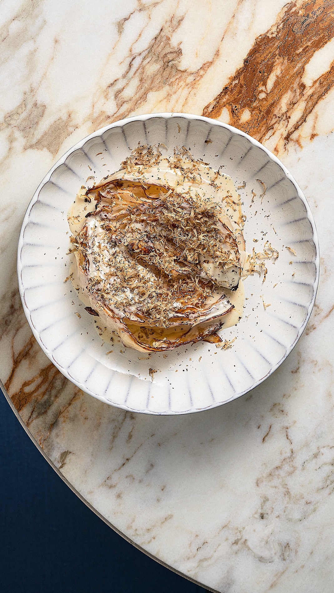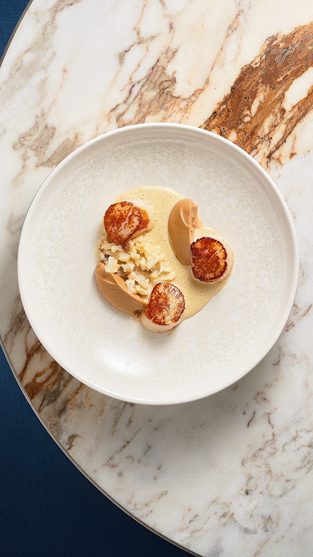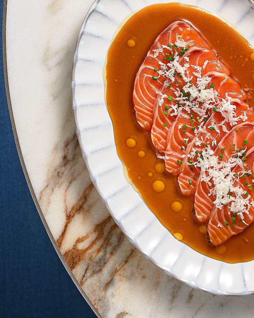 пате из брокколи с кедровыми орехами, спагетти с камчатским крабом, севиче из тунца с огурцом и кинзой, желтохвост с черным трюфелем и хреном, пирог с бычьими хвостами и сыром таледжио, осьминог с соусом Ромеско, молодая капуста с черным трюфелем.
