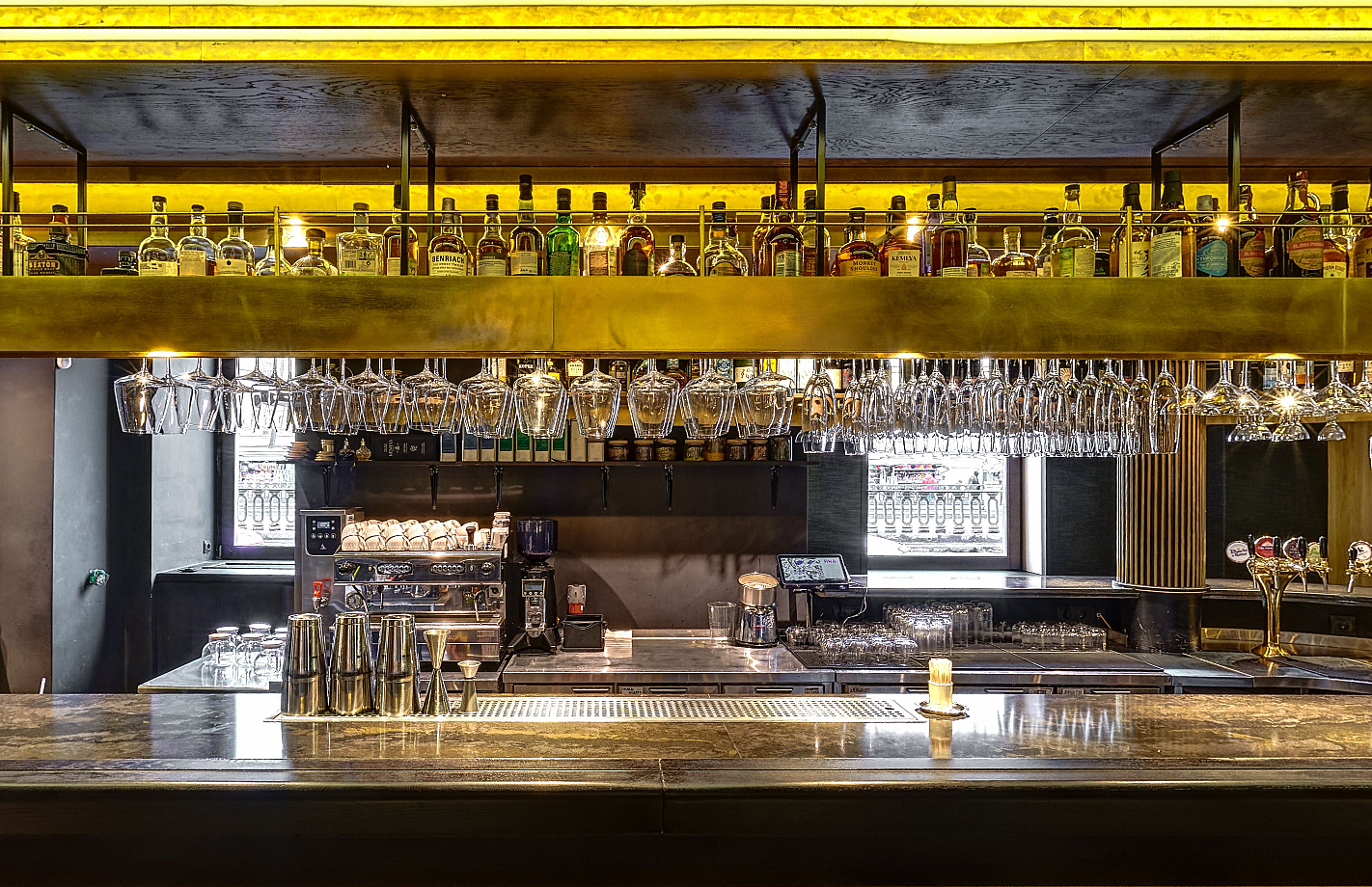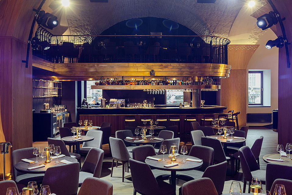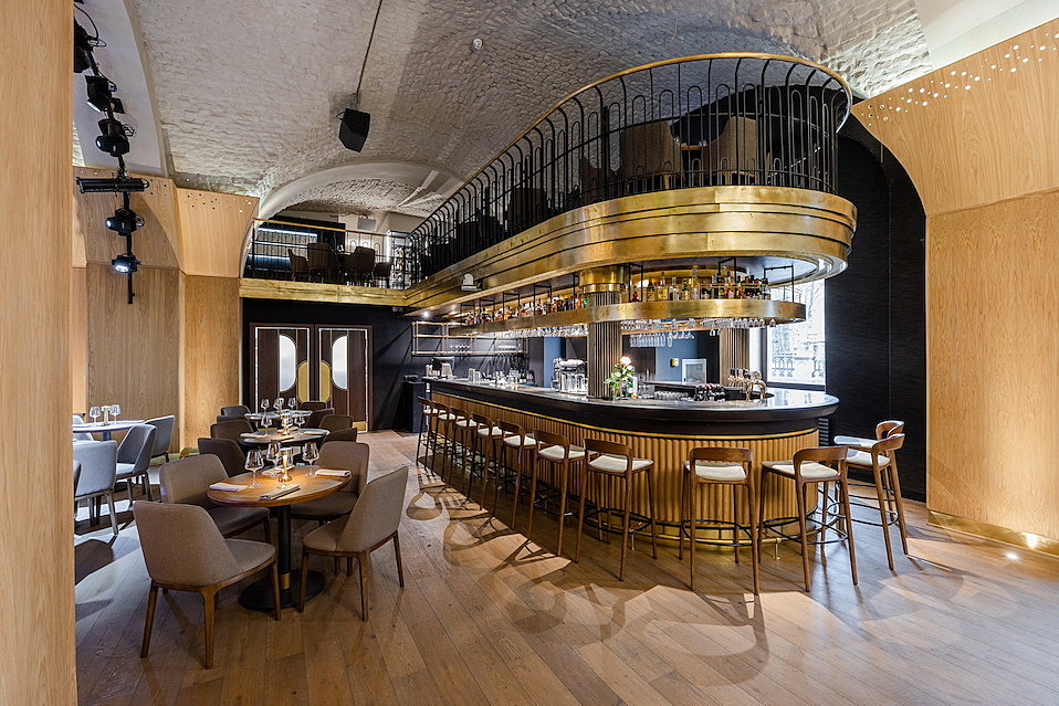 Помещение клуба занимает два этажа в историческом здании второй половины XVIII века. Высокие сводчатые потолки, золотистая барная стойка, переплетение латуни и дерева делают интерьер утонченным и элегантным.