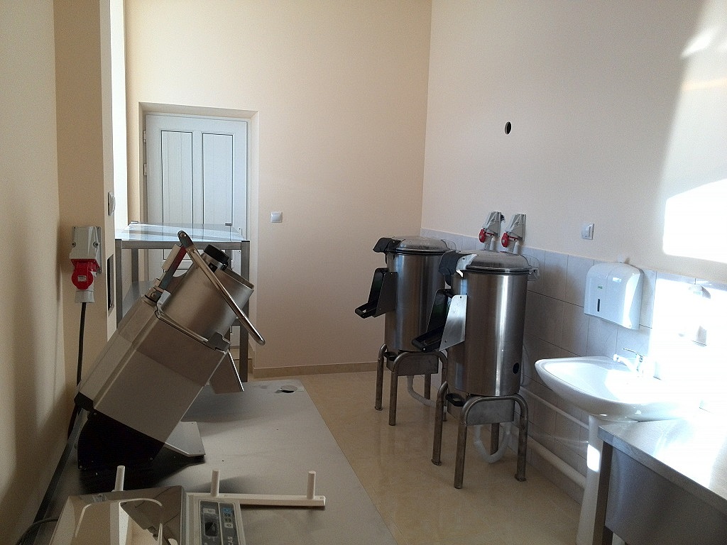 В овощном цехе установлены машины для очистки и переработки корнеплодов: картофелечистка, овощерезка, куттер – все от ведущих брендов в этой сфере пищевого оборудования. Машины рассчитаны на интенсивную, каждодневную эксплуатацию, поэтому изготовлены из крепкой нержавеющей стали. Все рабочие механизмы – ножи и насадки также выполнены из нержавейки, которая не сломается и не заржавеет. Все элементы легко достаются для проведения очистки.