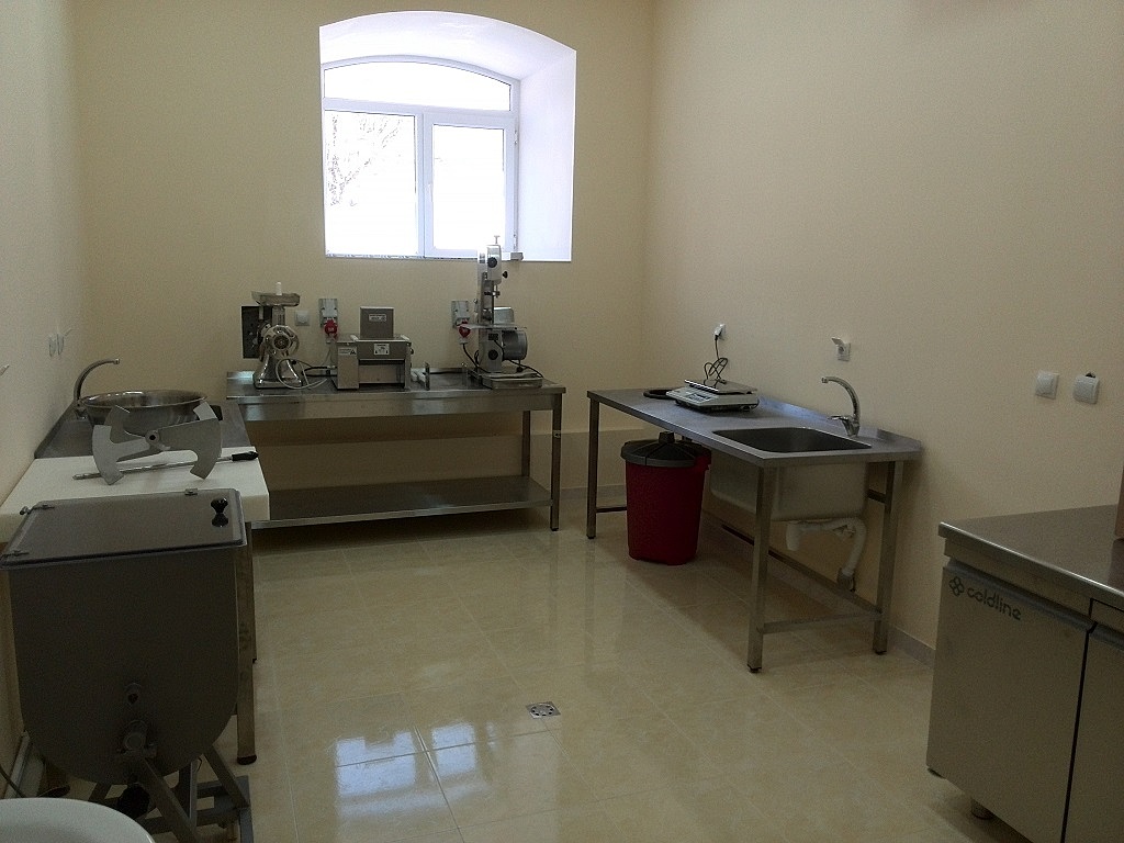 В мясном цехе предусмотрены аппараты для разделки туш и переработки мяса: колода FORCAR из нержавеющей стали с рабочей поверхностью из полипропила, фаршемес, тендрайзер. Последний нужен для размягчения всех видов мяса, что в последствии влияет на вкус и текстуру блюд. Свиные и куриные шницеля, бифштексы, обработанные мясорыхлителем KT, становятся более нежными, сочными, быстрее готовятся.