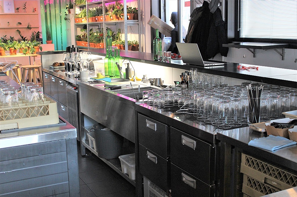 Моечный цех и хранение продуктов — вынесены на бэк-кухню. Там установлены посудомоечная машина для бокалов, ванна с душем CANCAN и в отдельном помещении — несколько холодильных шкафов POLAIR.
