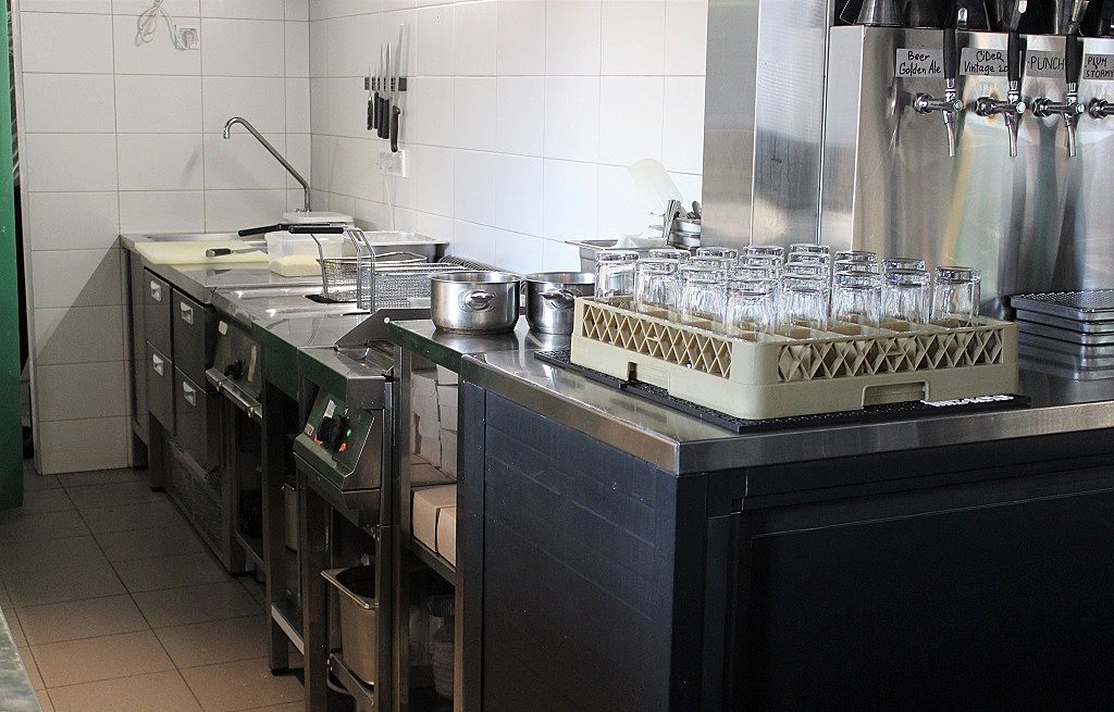 Для этого проекта мы изготовили комплект нейтрального оборудования бренда АЛТЭК из нержавеющей стали: металлические столы, вытяжной зонт, подставки под технику, рукомойники и моечные ванны, полки, тележку-шпильку. Благодаря точно воспроизведенным размерам все элементы четко вписались в расстановку по габаритам и хорошо смотрятся с визуальной точки зрения.
