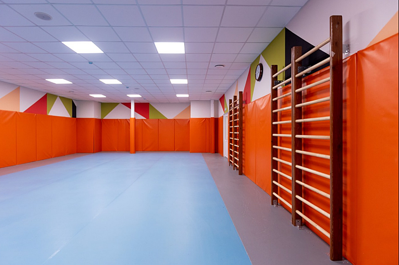 Школа разделена на два функциональных блока – учебный и учебно-оздоровительный с двумя бассейнами, спортивными залами, оборудованной площадкой для игровых видов спорта, а также шестью спортивными залами.