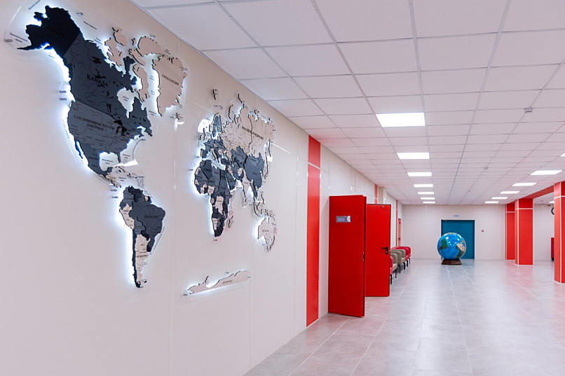 Новый корпус школы № 93 уникален не только большими размерами и суперсовременной "начинкой", но и концепцией обучения, которая называется "Время России". Каждый кабинет имеет собственное географическое название. А информация о нем доступно и эстетично размещена прямо на стенах кабинета и в зоне рекреации.