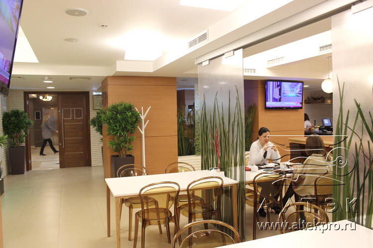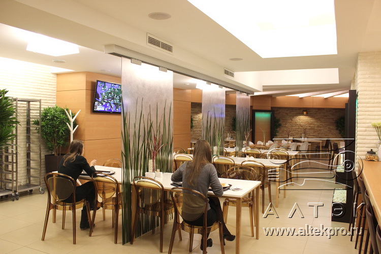 В столовой спроектирована отдельная ресторанная зона, в которой приятно отдохнуть и пообедать в течение рабочего дня. Подобный новый формат столовой делает ее привлекательной даже для самых взыскательных посетителей.