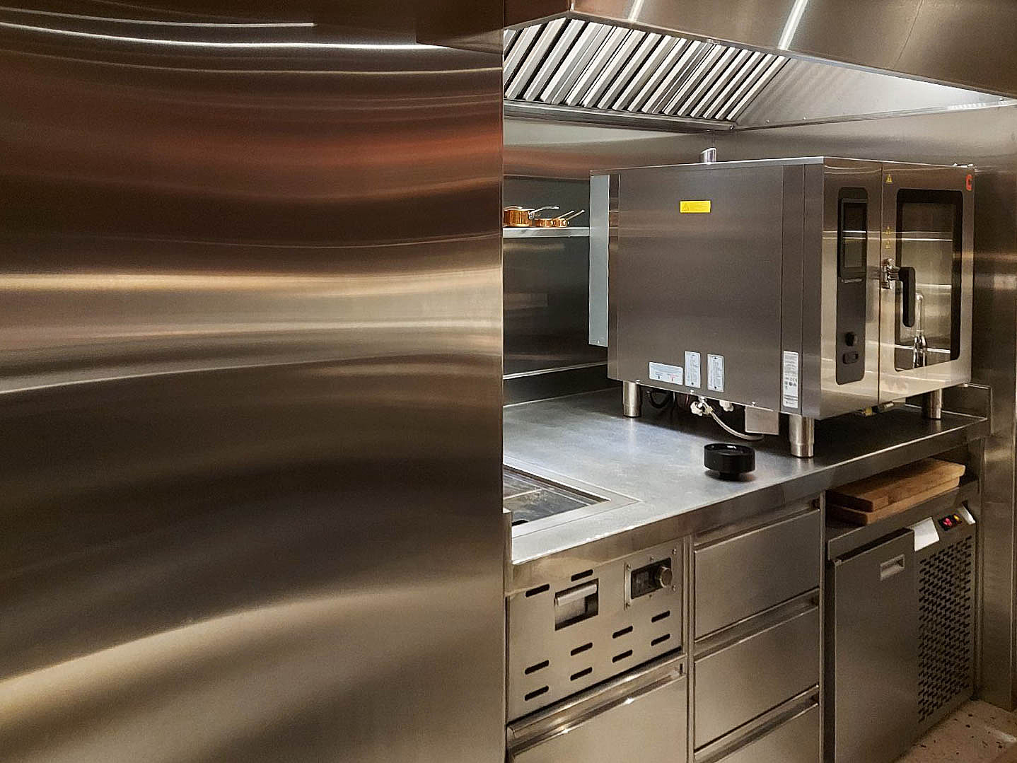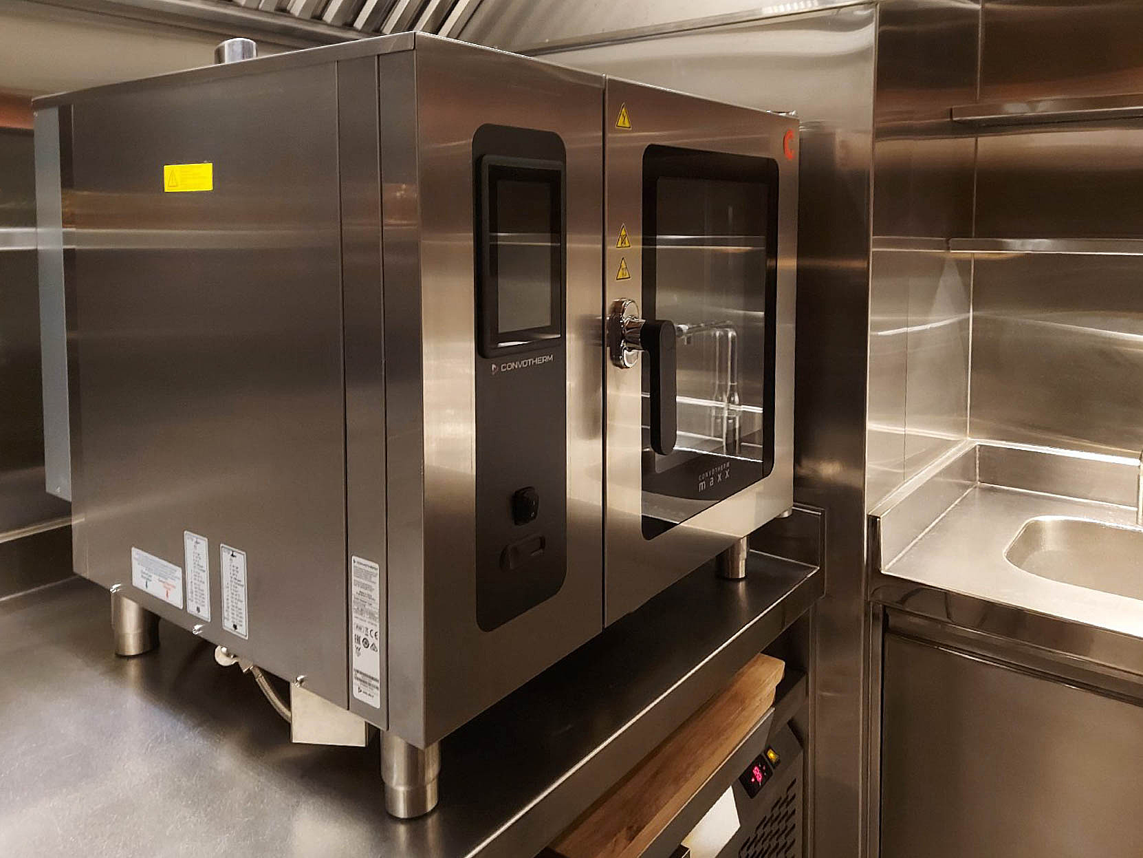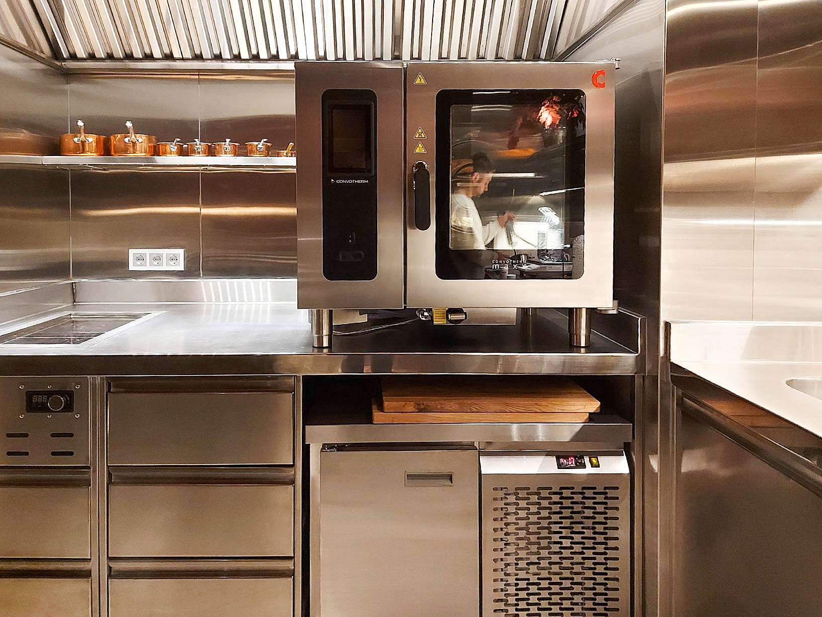 Главным помощником на кухне стал пароконвектомат CONVOTHERM на 6 уровней. С его помощью можно одновременно готовить разные блюда, благодаря функции комбинированного пара. Аппарат оснащен самыми современными технологиями: многоточечным термощупом, цифровым дисплеем, возможностью управления через wi-fi, 399 автоматических программ приготовления, полностью автоматическая система очистки камеры.