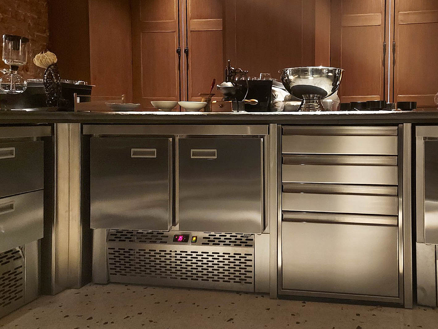 В качестве рабочей поверхности на открытой кухне используют холодильные и морозильные столы POLAIR и ТЕХНО-ТТ.