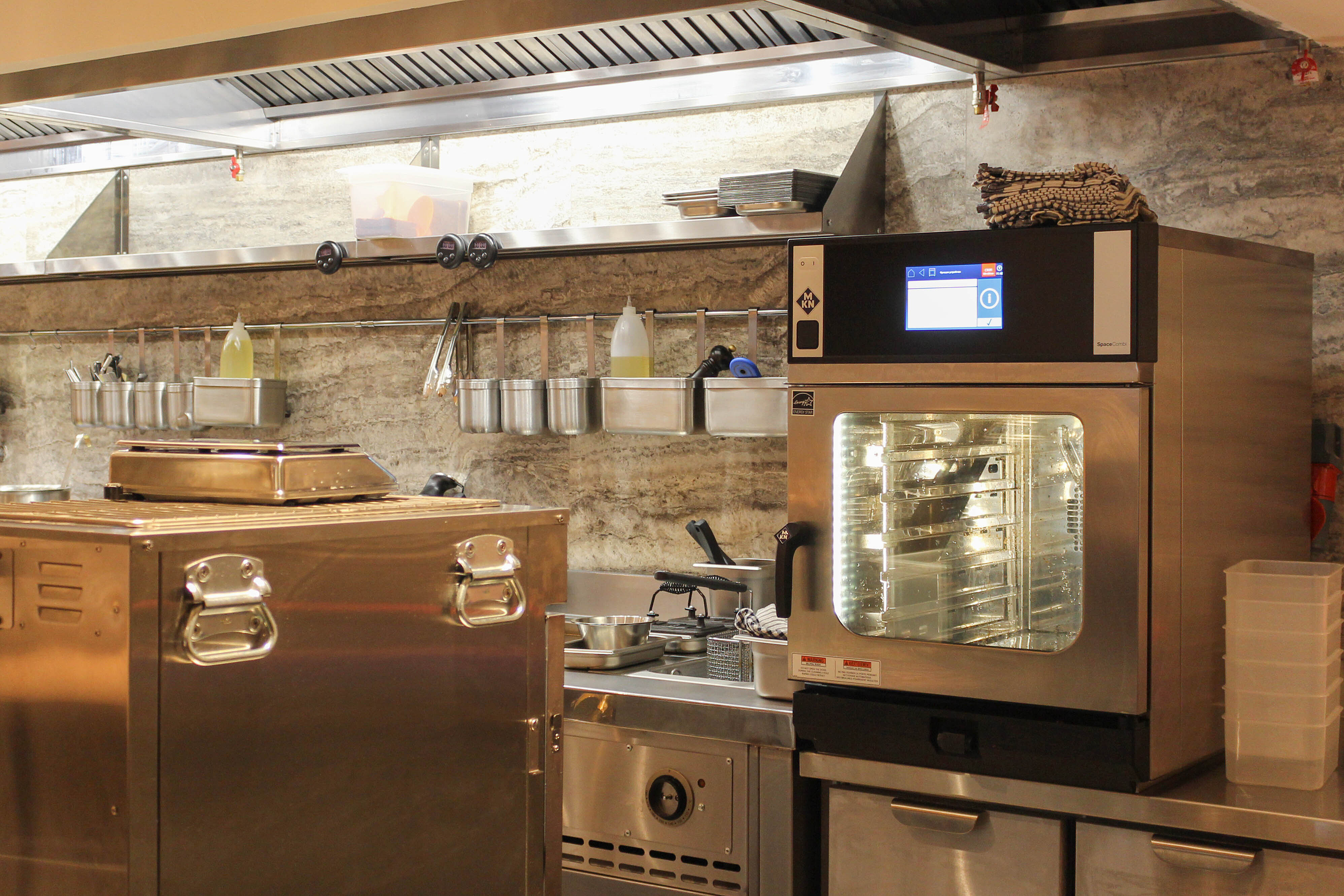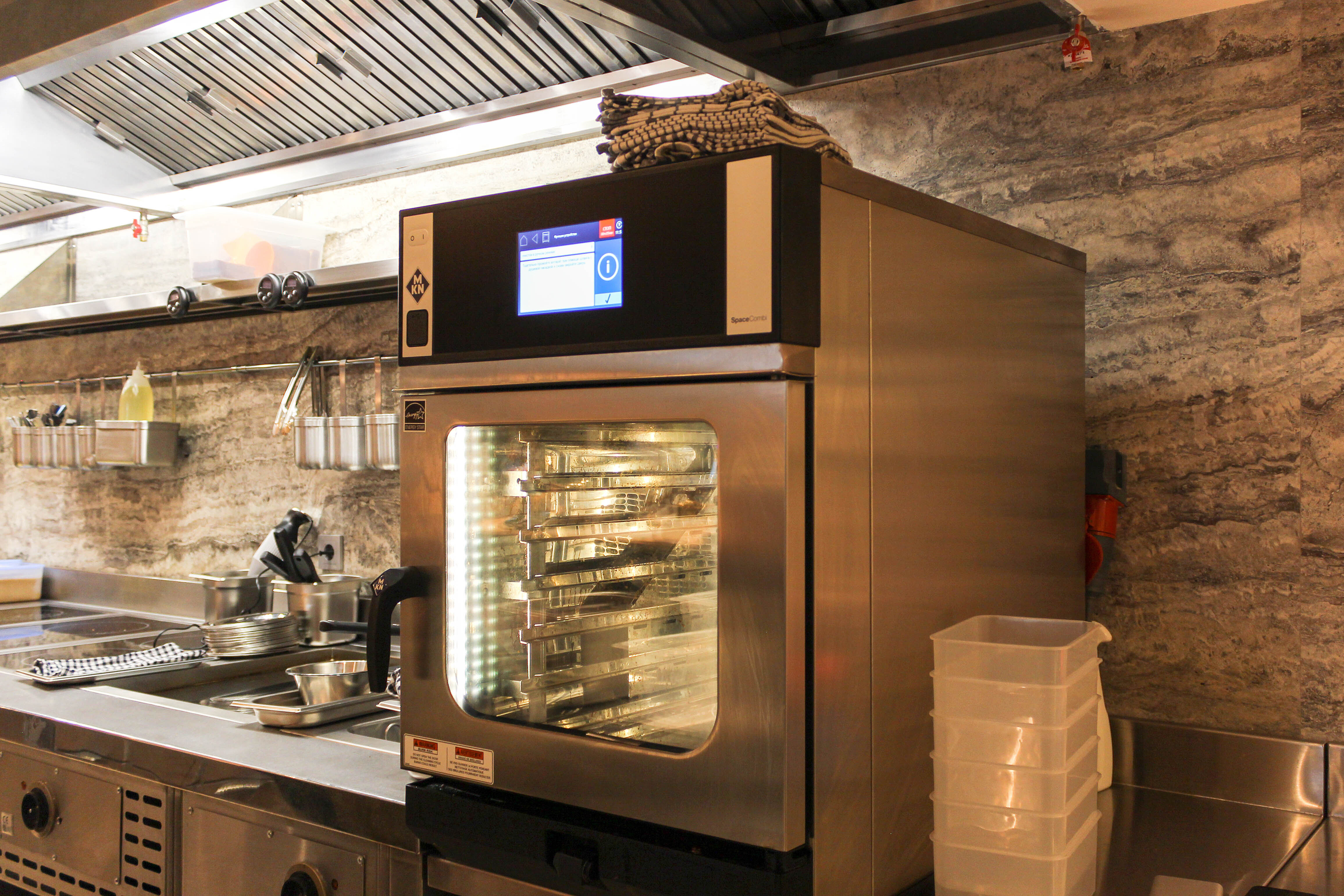 В горячий цех был установлен пароконвектомат MKN SpaceCombi MagicPilot. Он предназначен для различных видов приготовления пищи, таких как обжаривание, приготовление на пару, бланширование и запекание. Он с легкостью заменяет несколько устройств на кухне.