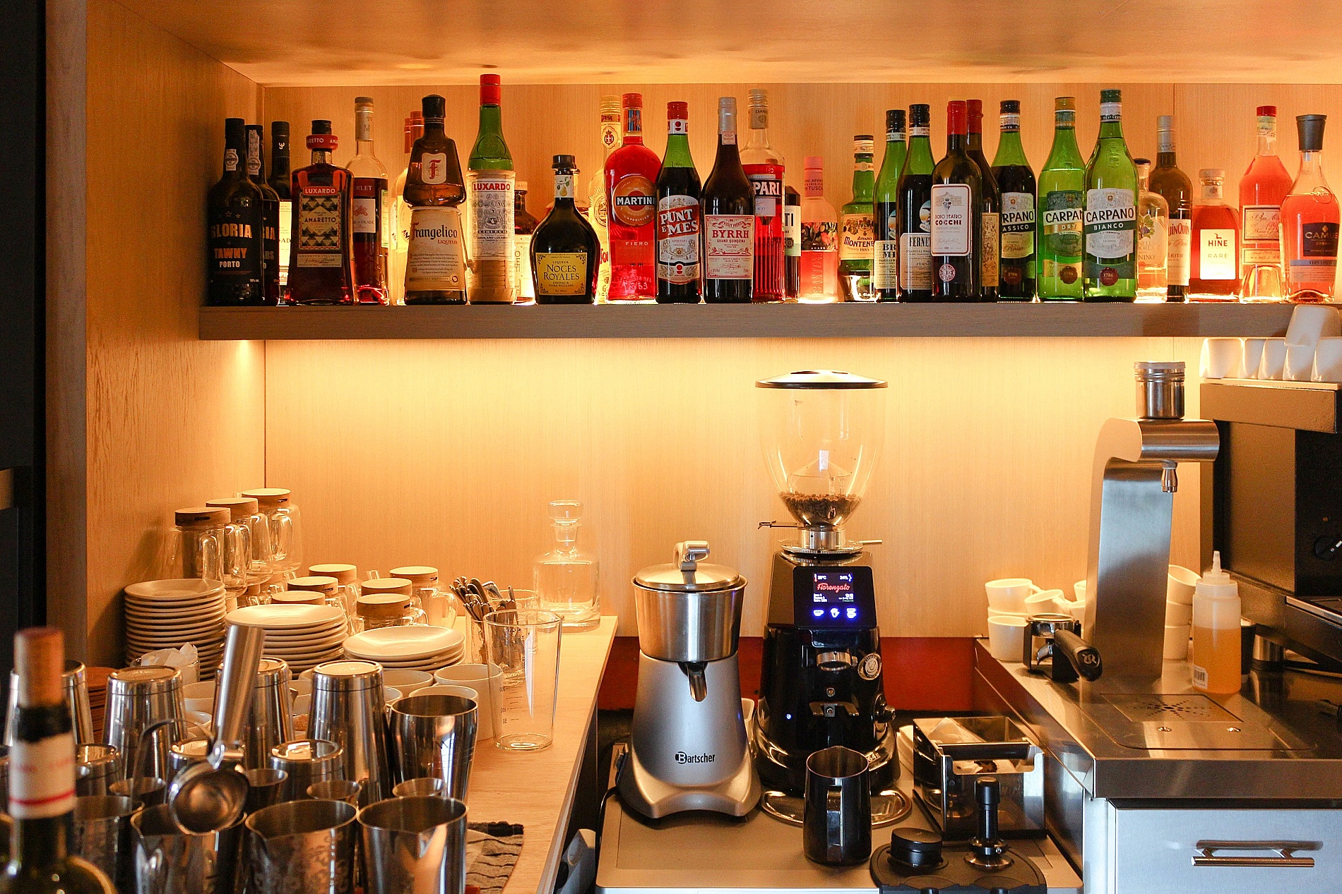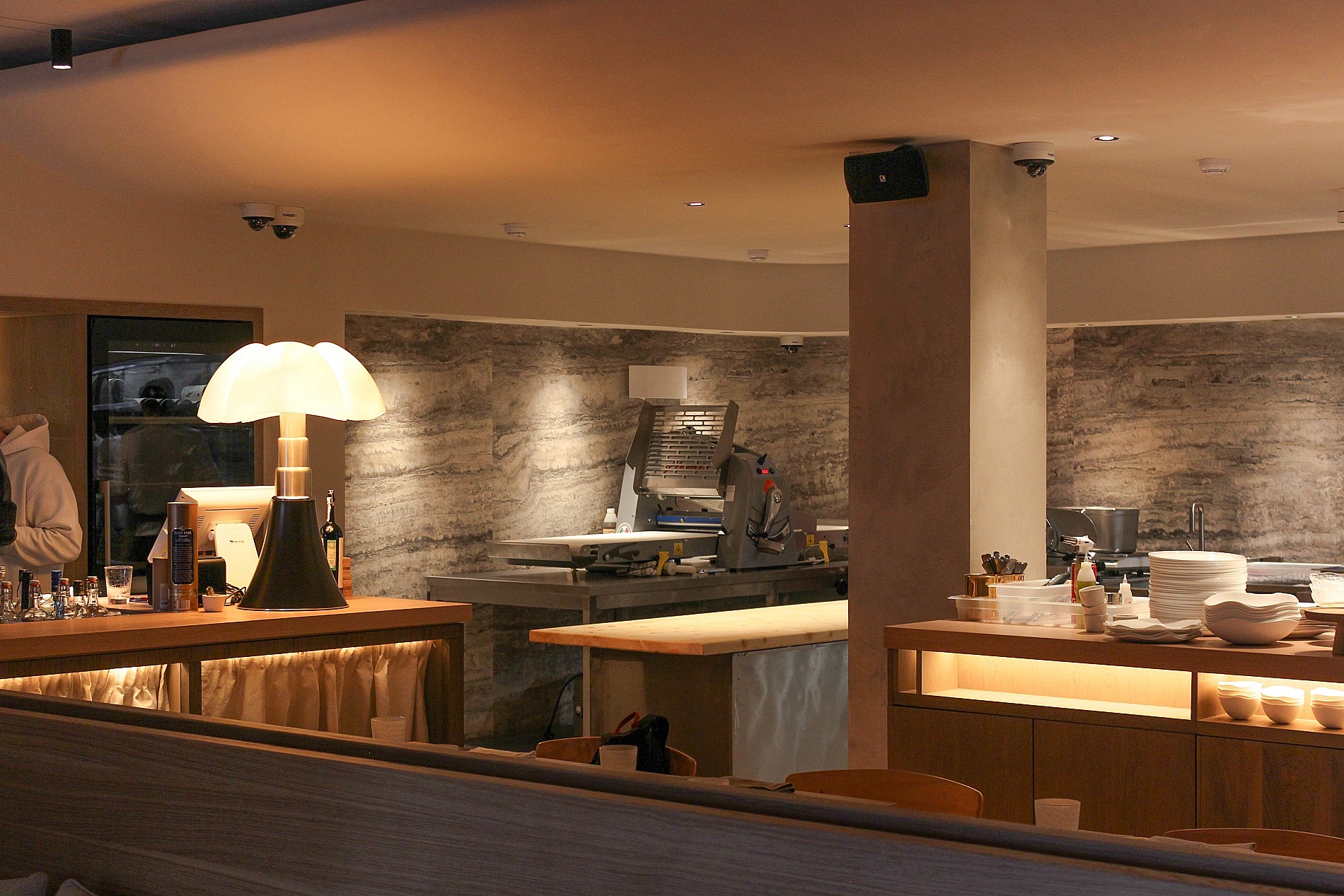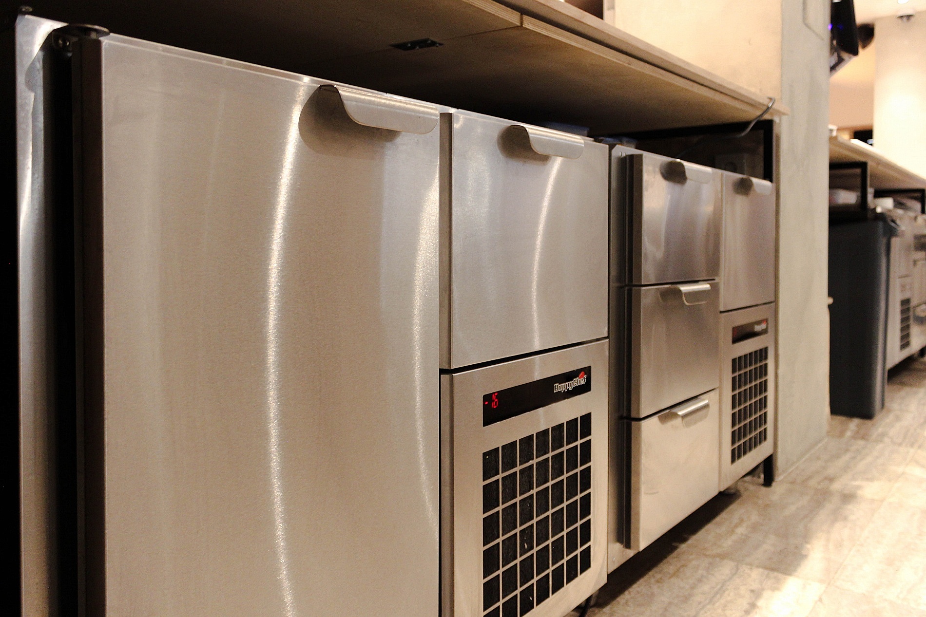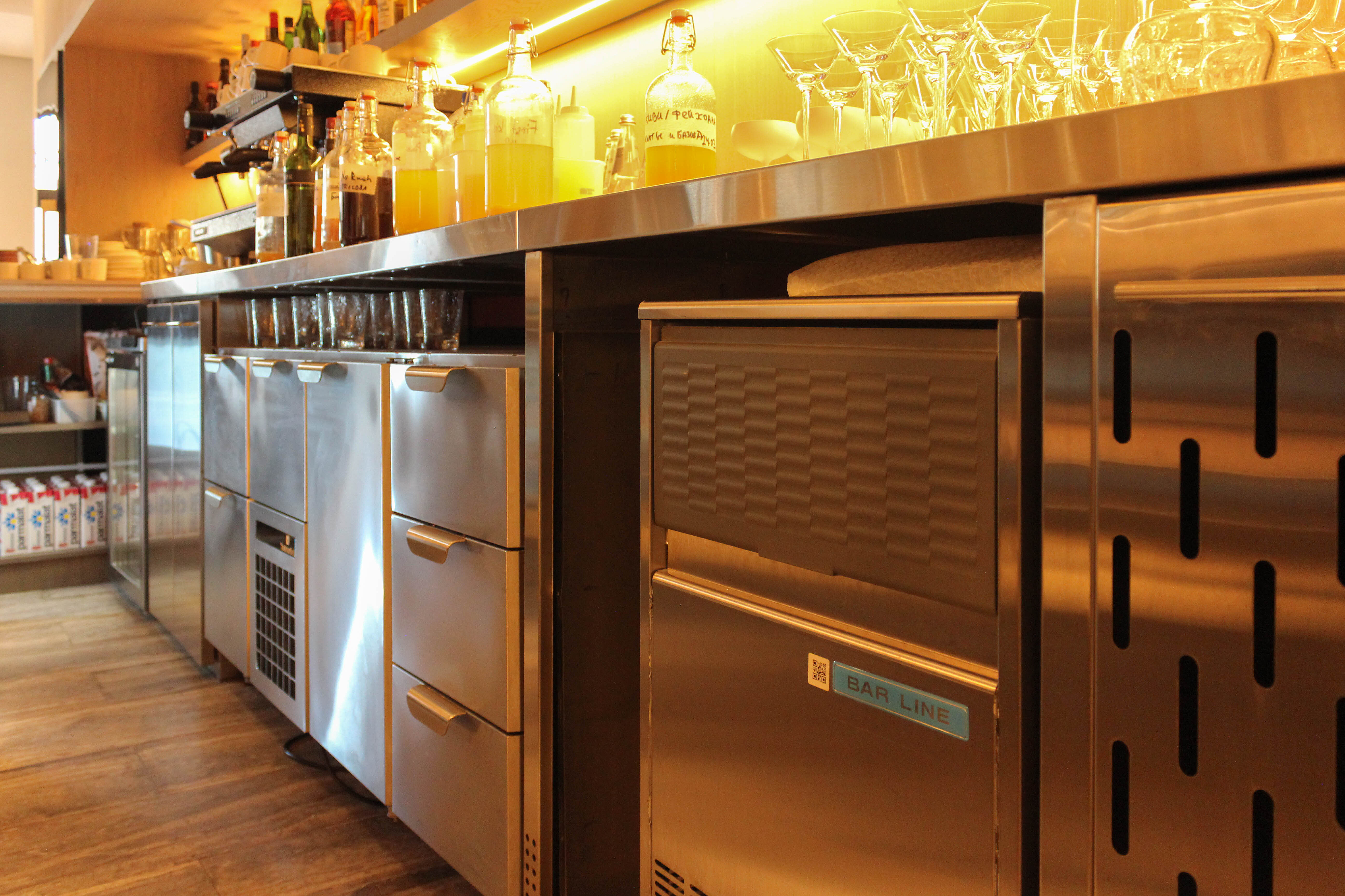 В зоне бара расположились холодильные столы со стеклянными дверьми HICOLD и льдогенератор SCOTSMAN для производства конусного льда.