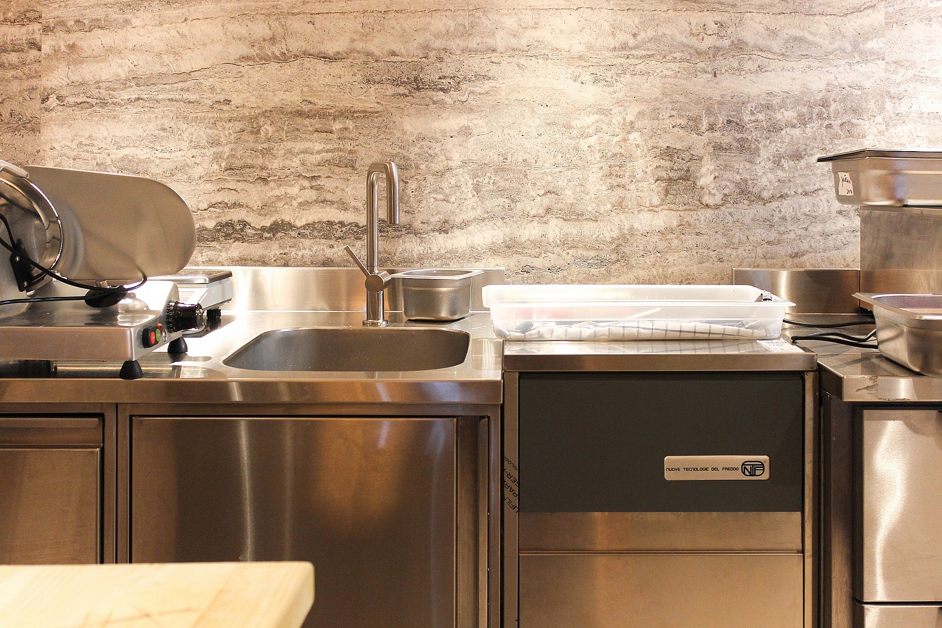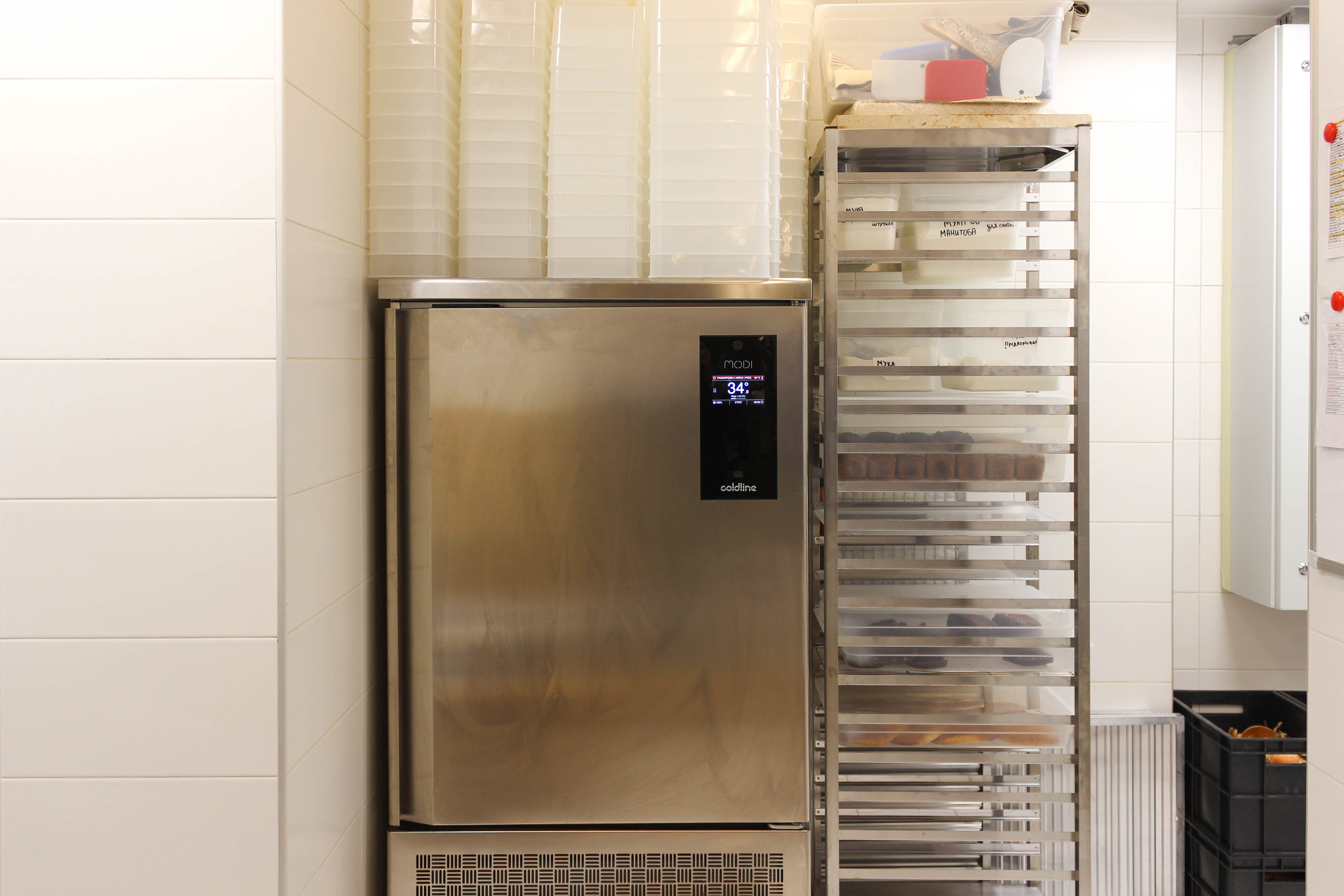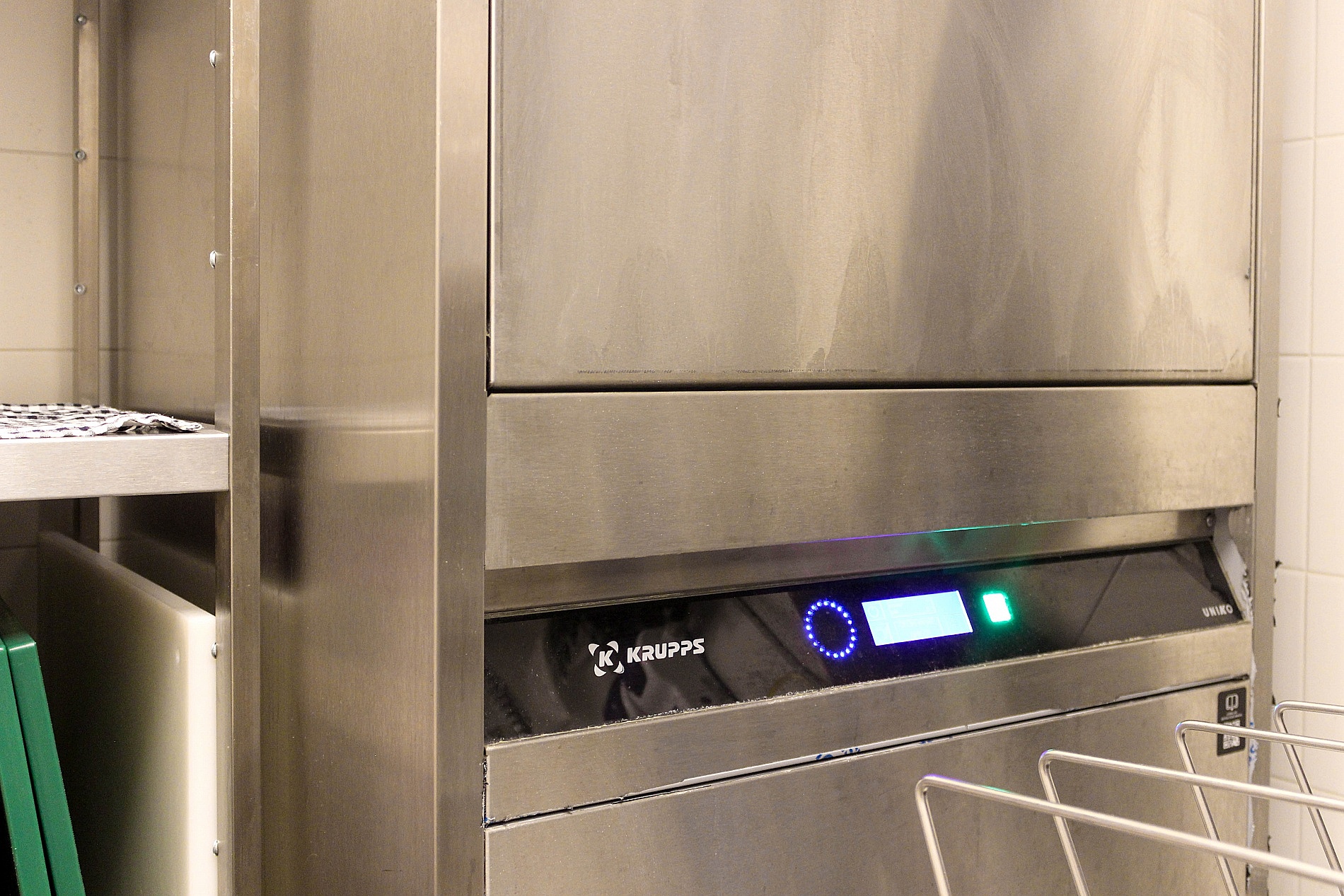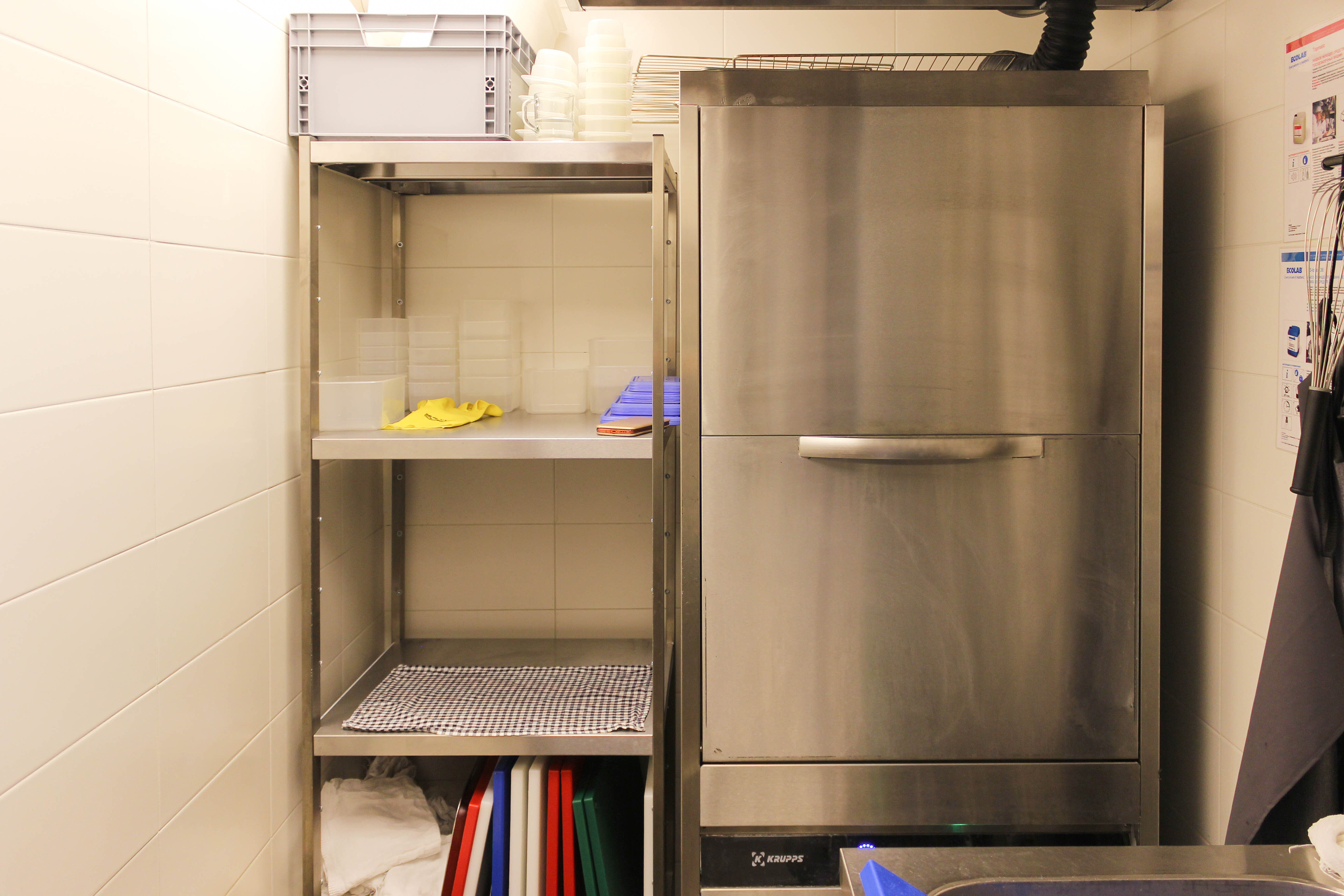Зона мойка оснащена в том числе котломоечной машиной KRUPPS KORAL line. Это удобное оборудование идеально подходит для мытья гастроемкостей, кастрюль, планетарных миксеров, приборов и тарелок. Она способна помыть до 780 тарелок за один час. Загрузка посуды не требует лишних энергозатрат благодаря удобной высоте и противовесной двери.