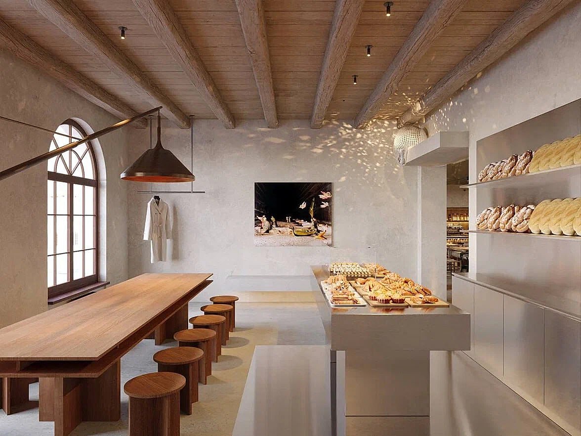 Через отдельный вход можно попасть в датскую пекарню Inner Bakery, чтобы отведать там идеальный тартин, краффины или датские булочки. Большая часть ассортимента эстетично представлена во встроенной в столешницу кондитерской витрине Finist Glassier.