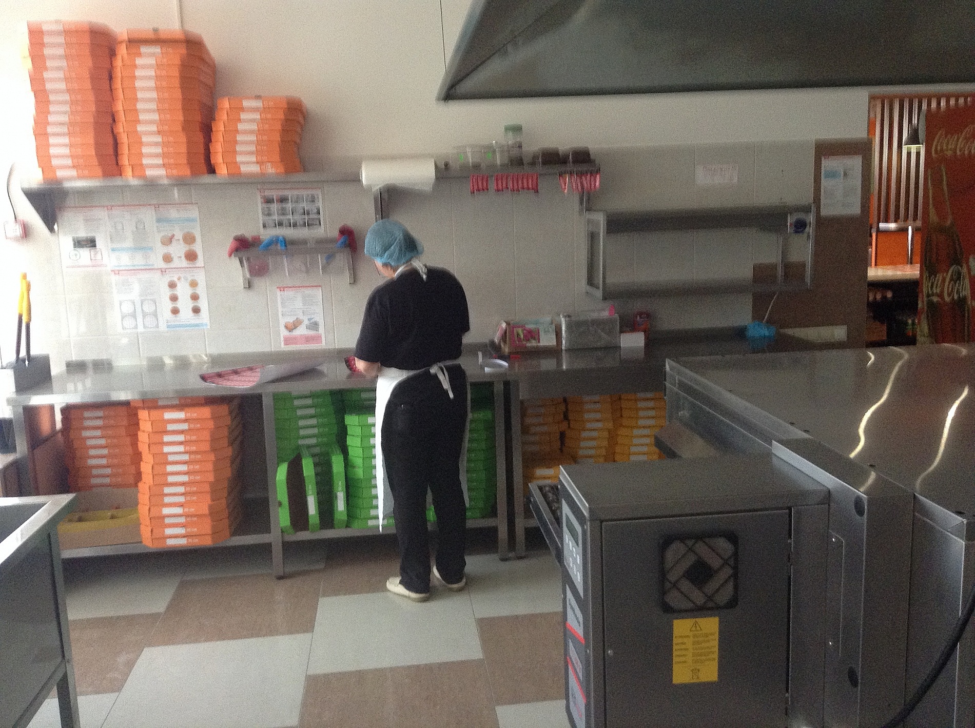 Далее на пицца-краст выкладывается начинка – ветчина, колбаски, овощи, сыр. Все ингредиенты нарезаются с помощью профессионального электромеханического оборудования: овощерезки NEMCO, сырорезки и прочее. За этим следует главный этап приготовления пиццы – выпекание. За годы работы в сфере оснащения пиццерий и в том числе с компанией «Додо Пицца», мы выявили, что для пиццерий подобного формата лучше всего подходит конвейерная печь ZANOLLI SYNTHESIS 11/65 V GAS. На данном объекте была установлена газовая версия такой печи.
