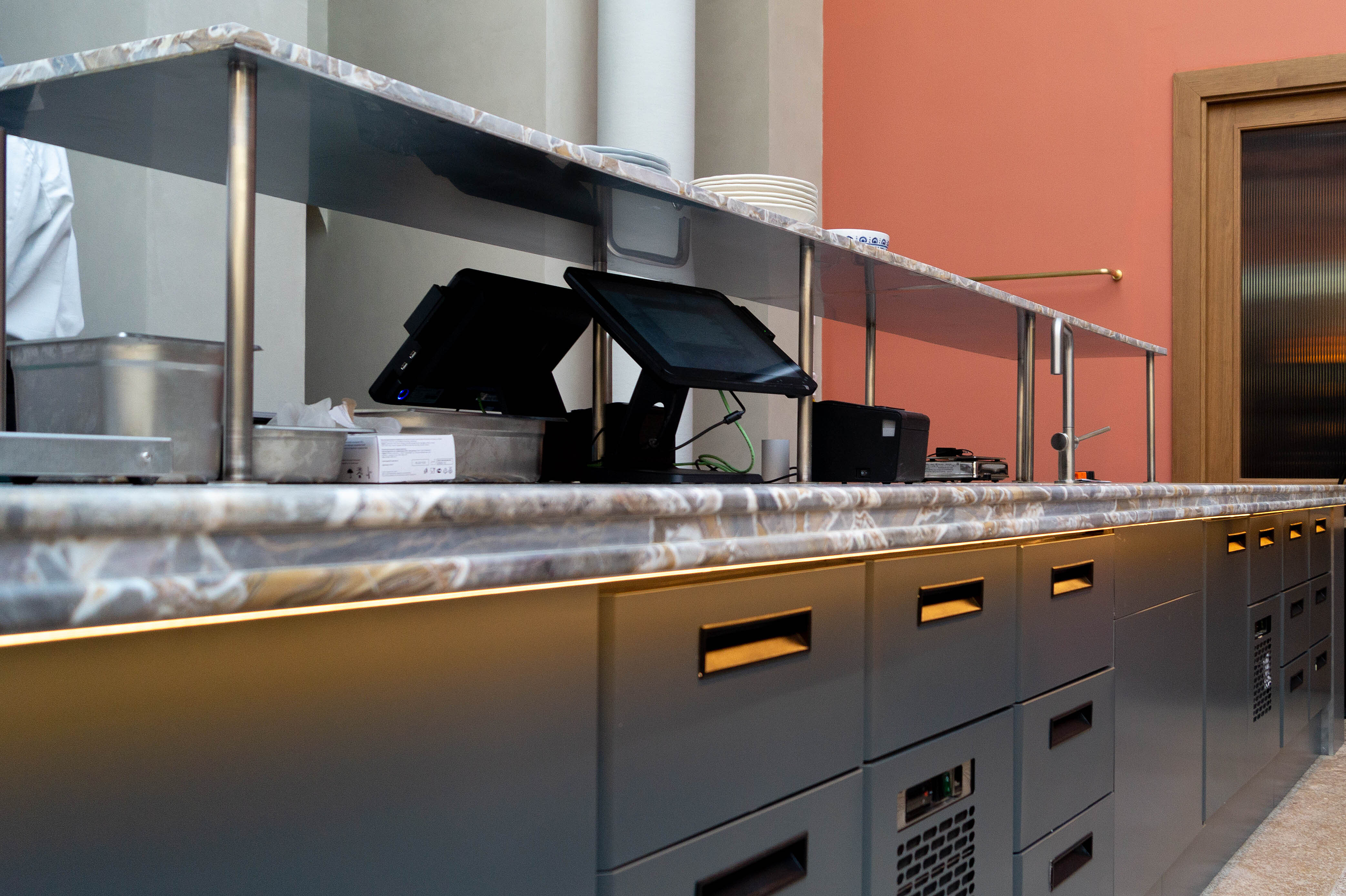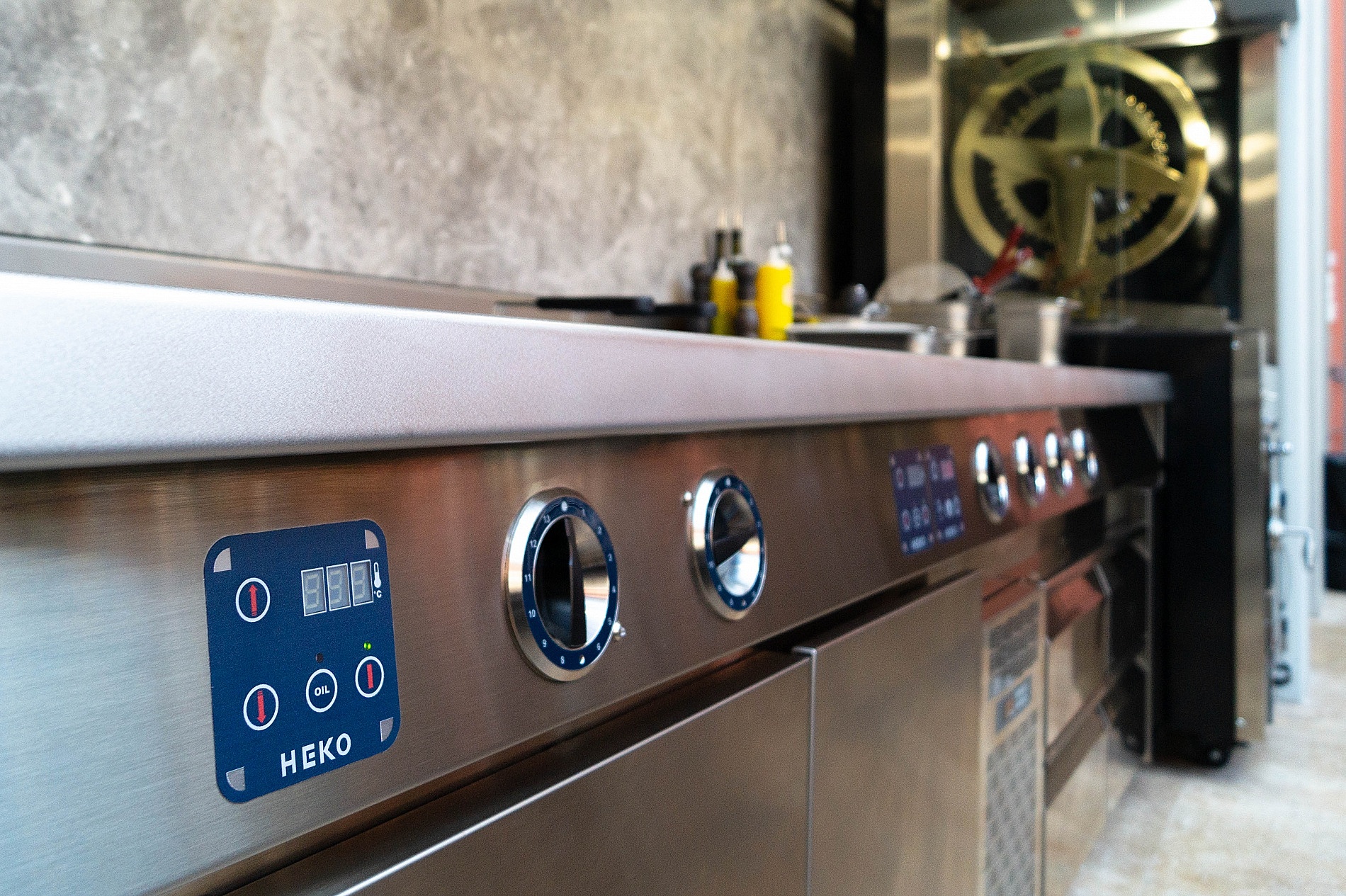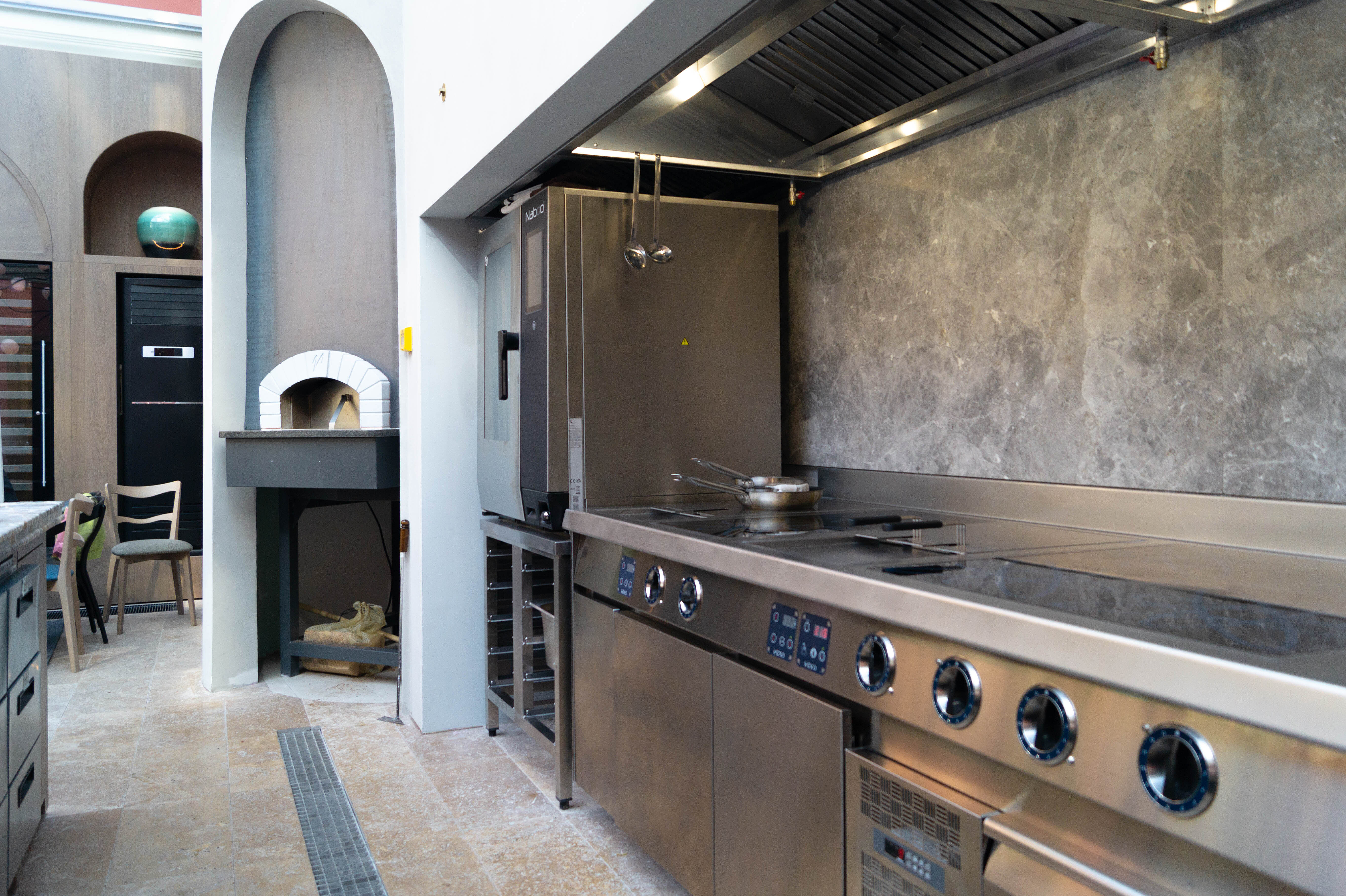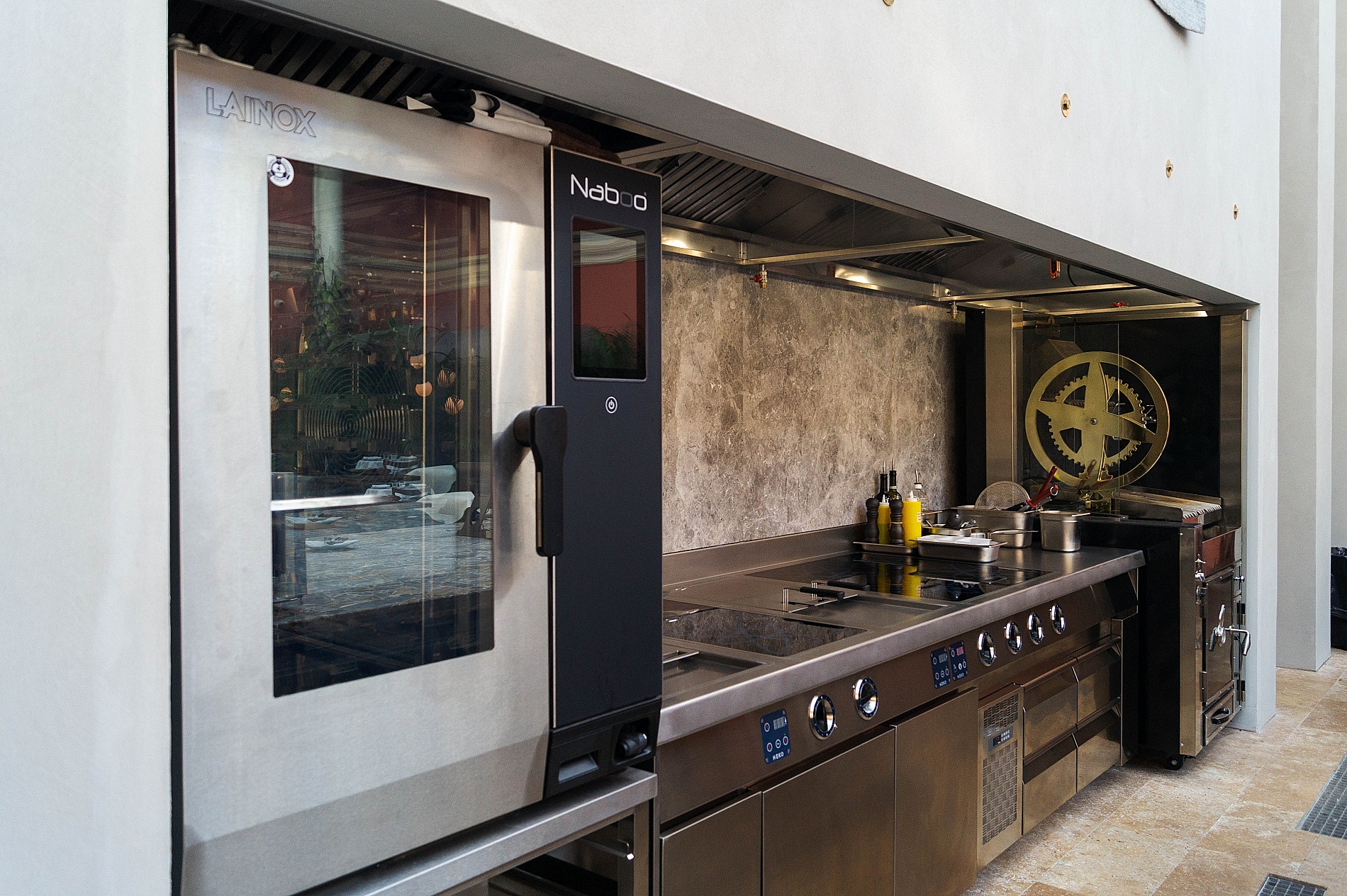 Компания «Алтэк» занималась проектированием и комплексным оснащением ресторана. На просторной открытой кухне ресторана мы установили тепловой модуль HEKO, состоящий из 2-х и 4-х секционных индукционных плит, макароноварки и фритюра. Пароконвектомат LAINOX NABOO BOOSTED бойлерного типа на 10 уровней — незаменимый помощник в приготовлении различных типов блюд.