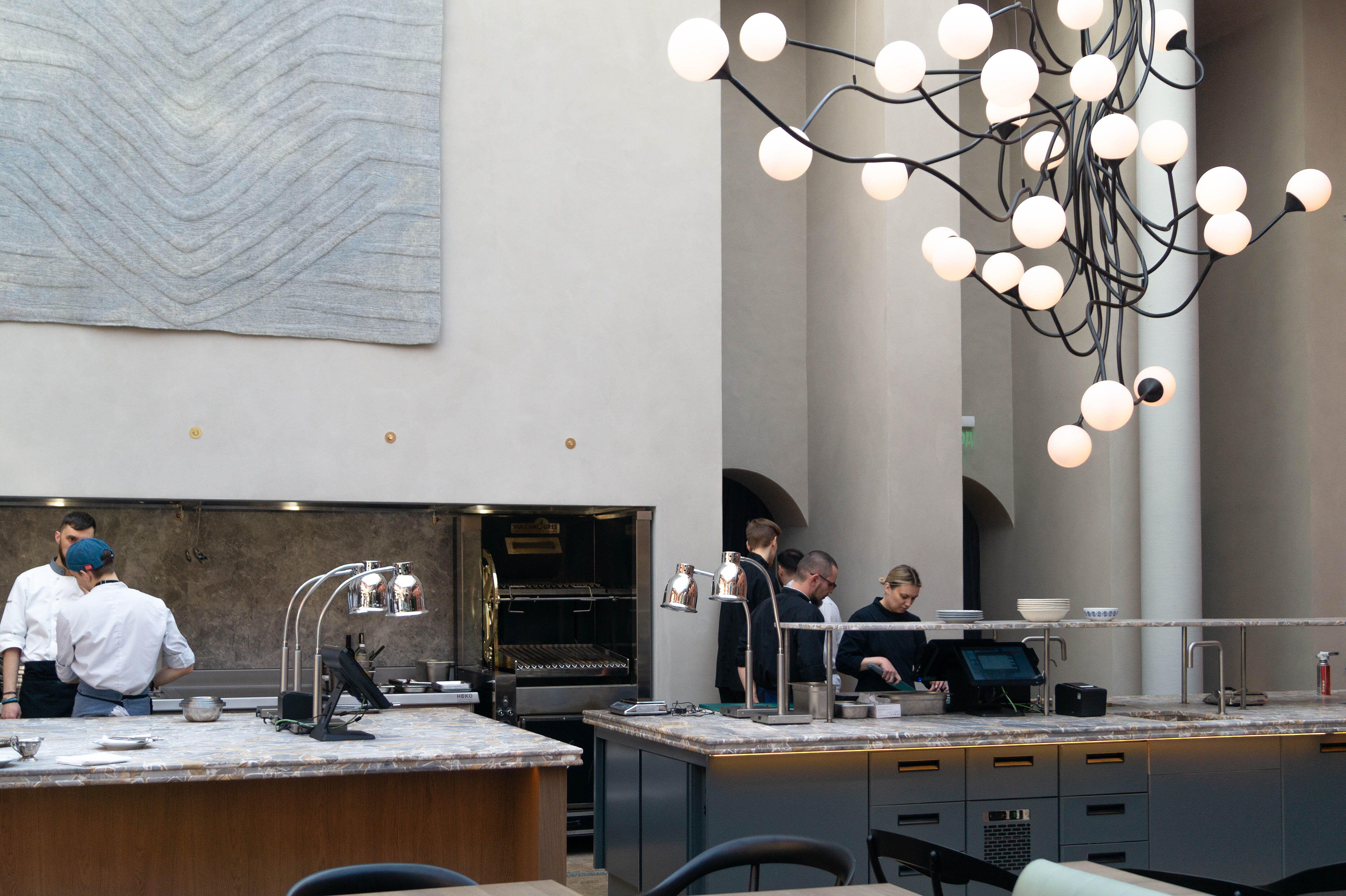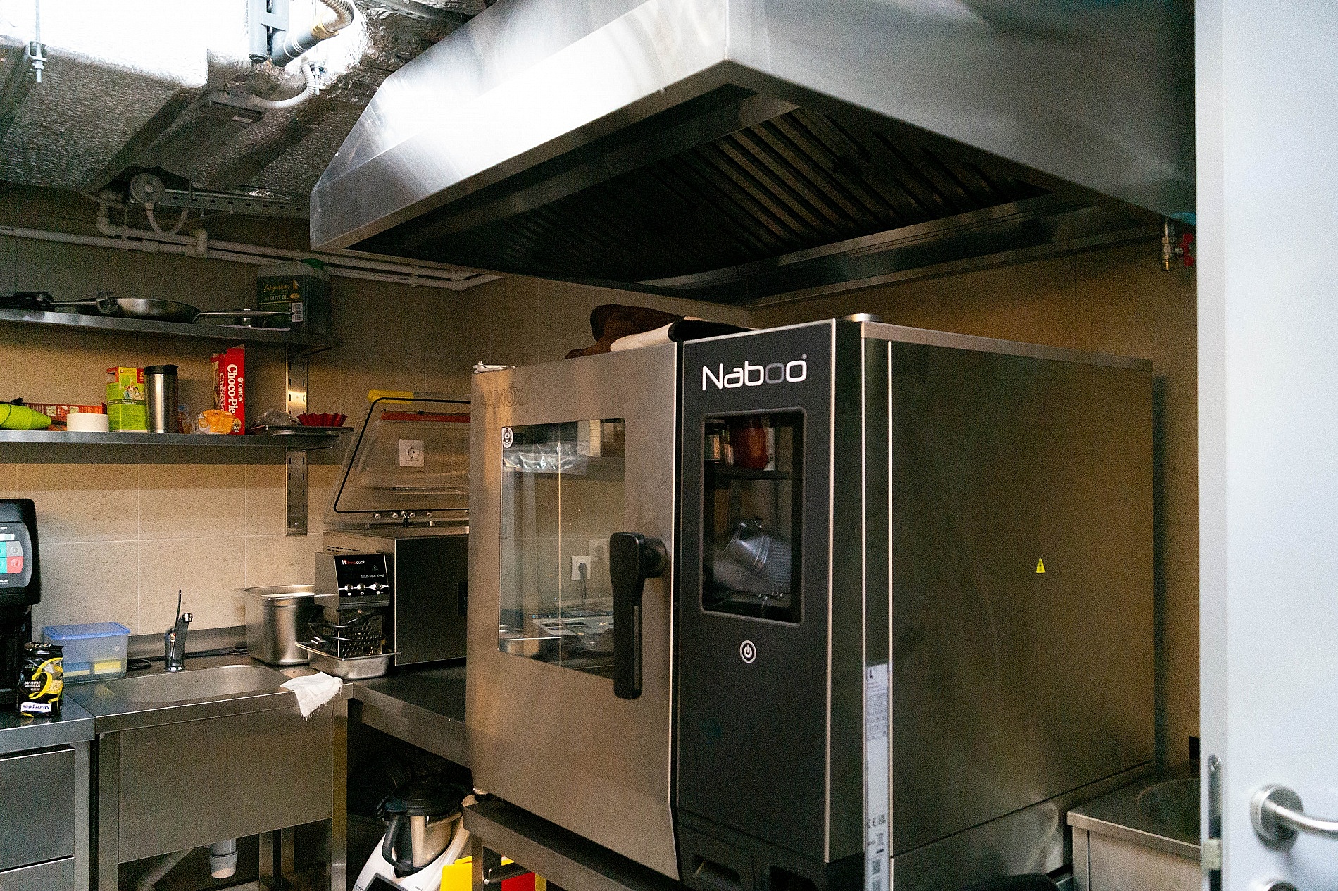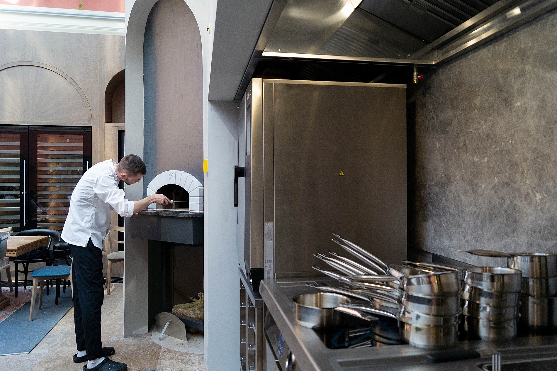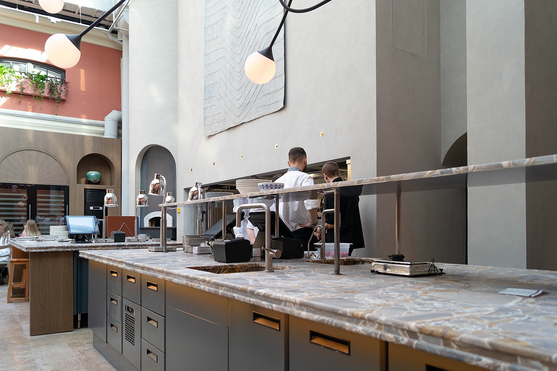 Компания «Алтэк» занималась проектированием и комплексным оснащением ресторана. На просторной открытой кухне ресторана мы установили тепловой модуль HEKO, состоящий из 2-х и 4-х секционных индукционных плит, макароноварки и фритюра. Пароконвектомат LAINOX NABOO BOOSTED бойлерного типа на 10 уровней — незаменимый помощник в приготовлении различных типов блюд.