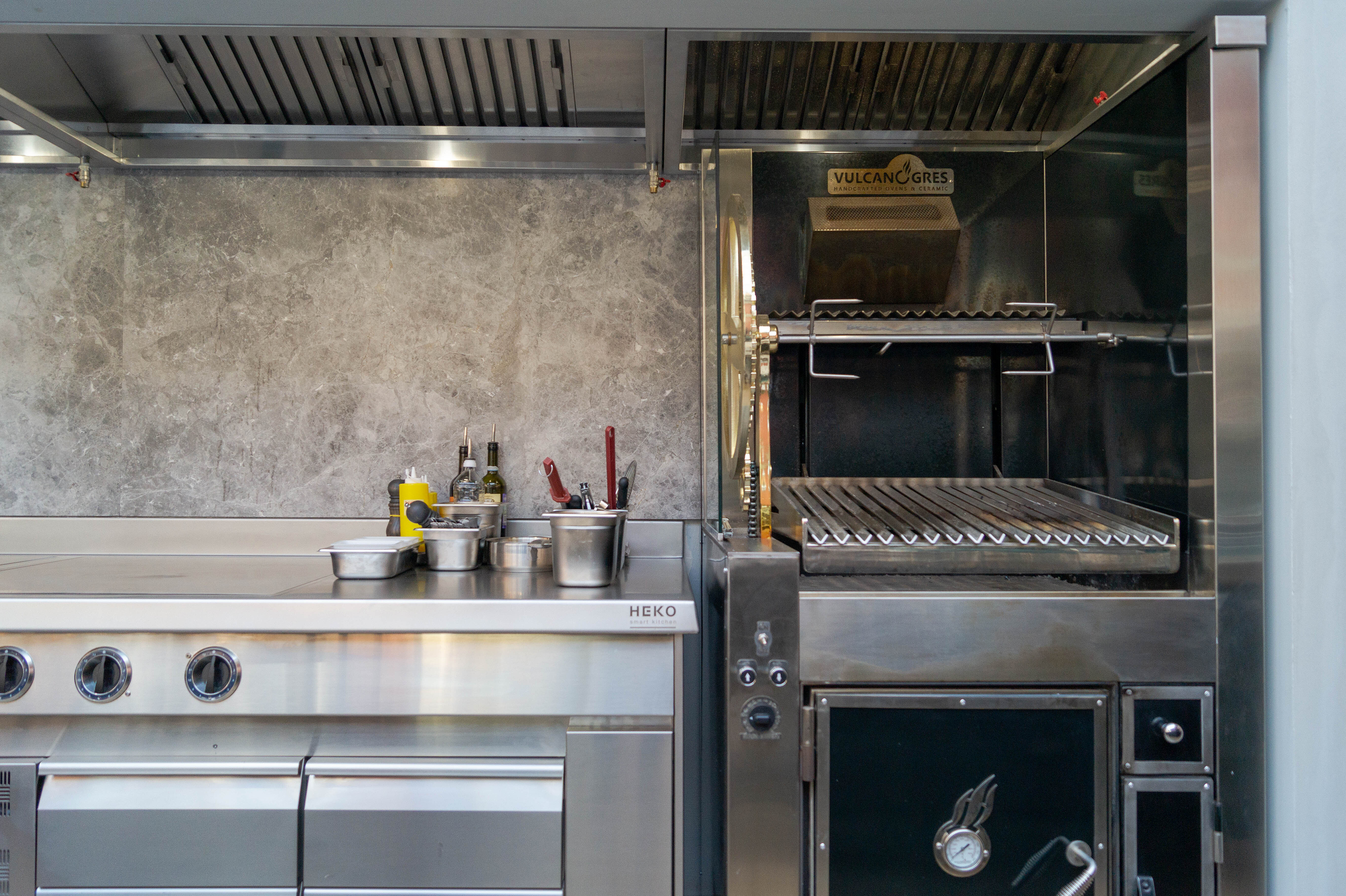 В одну линию горячей зоны вмонтирован профессиональный гриль VULCANO GRES для жарки и копчения. Испанский завод на заказ с учетом пожеланий заказчика изготовил уникальную модель, отвечающую всем требованиям и пожеланиям от внутренней комплектации до внешнего исполнения модели.
