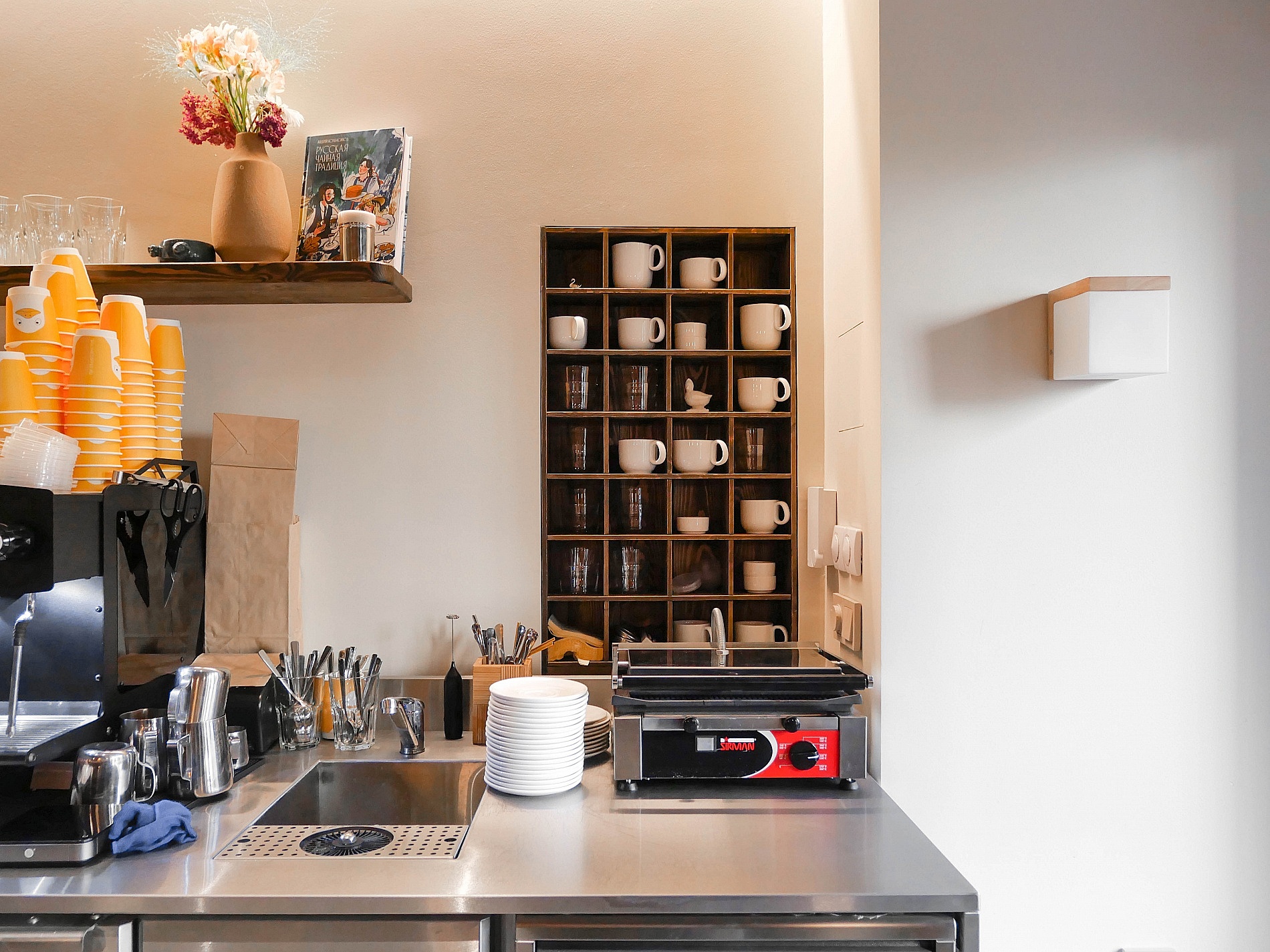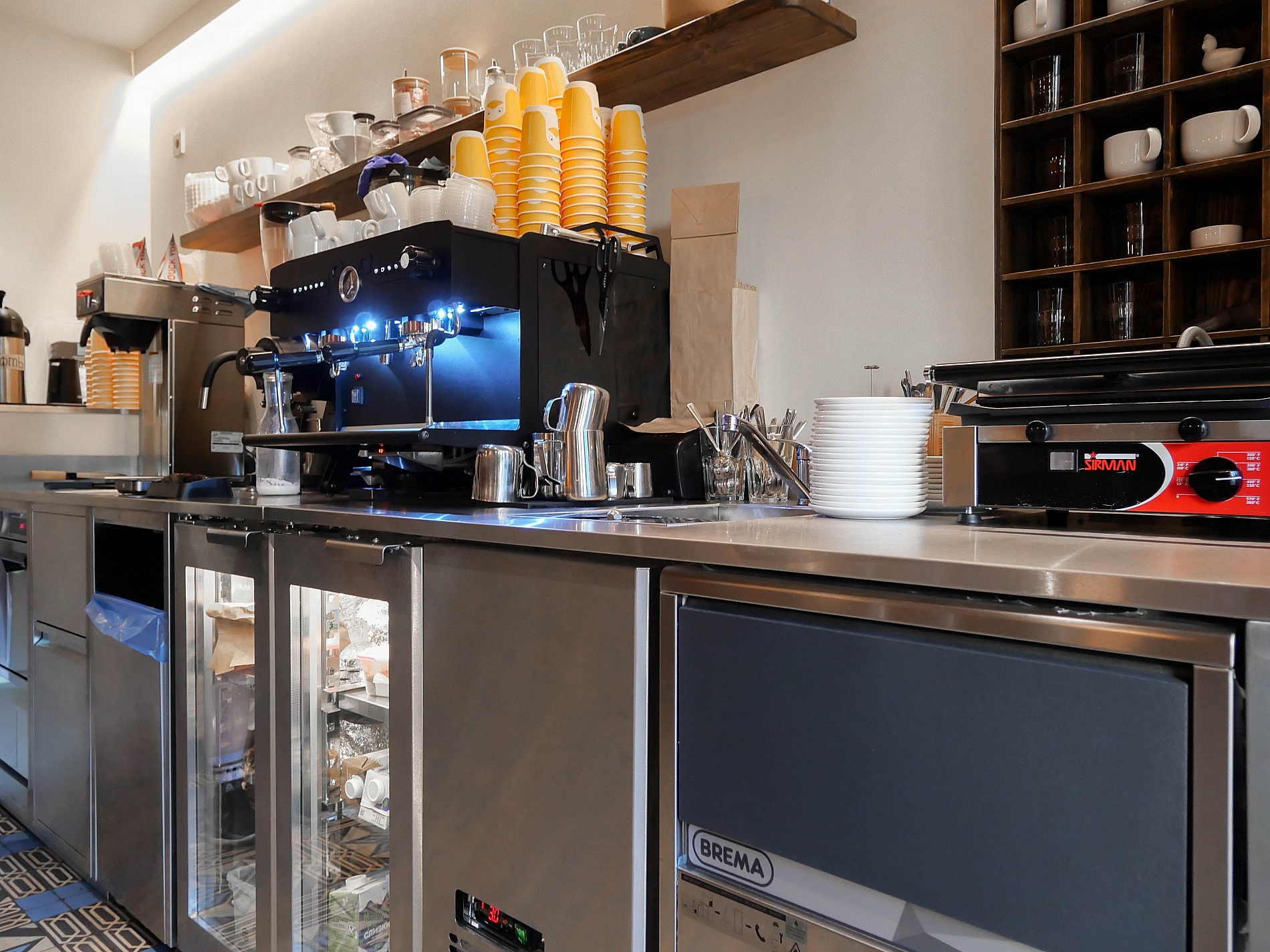 Компания «Алтэк» оснастила кофейню профессиональным оборудованием. Это тот случай, когда при небольших вложениях на минимальной площади можно организовать удобное открытое рабочее пространство, которое не перегружает интерьер.