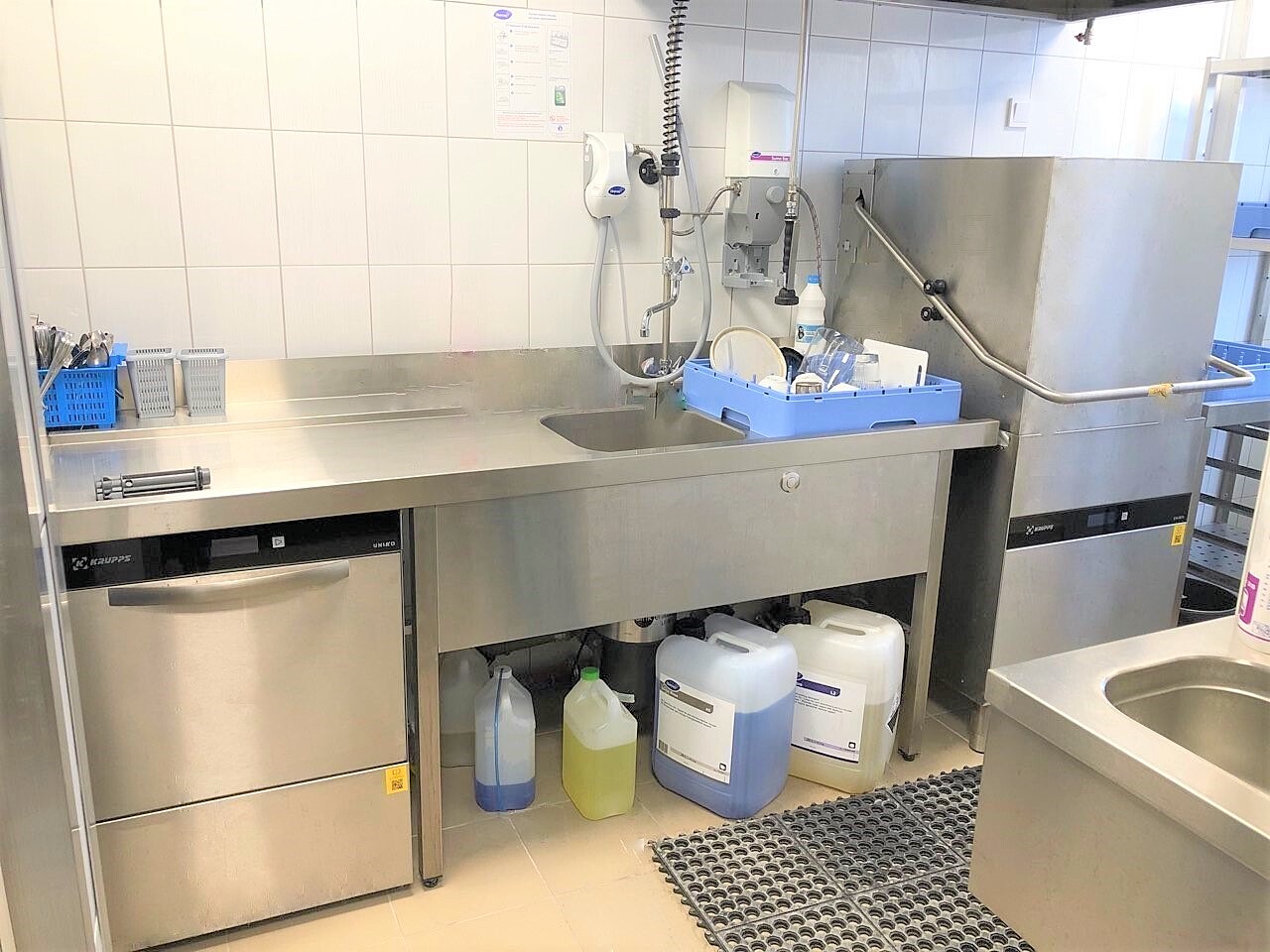 В посудомоечном цехе смонтированы фронтальная и купольная посудомоечные машины KRUPPS. Под раковиной — измельчитель пищевых отходов INSINKERATOR. Весь уборочный инвентарь и полимерные мусорные баки — от бренда RUBBERMAID. Нейтральное оборудование из нержавеющей стали — собственного производства АЛТЭК.