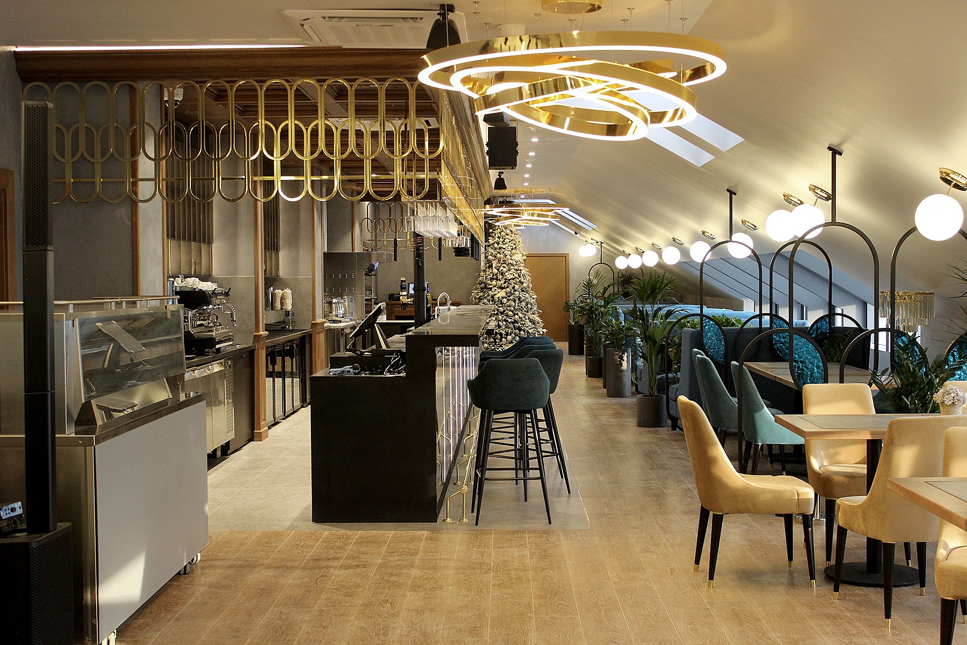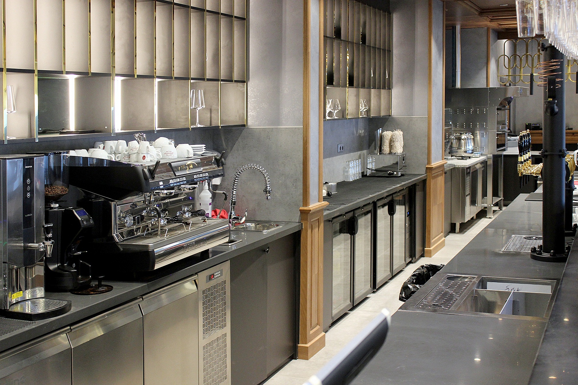 Завтраки в отеле сервируют в формате «шведский стол». Для этого в зале ресторана оборудована элегантная барная линия. Она укомплектована холодильными шкафами COLDLINE и TEFCOLD для напитков, кофейными машинами Nuevo Simonelli и MARCO, настольными электромеханическими аппаратами SIRMAN — блендеры, миксеры для коктейлей, соковыжималка. В стойку встроены льдогенераторы гранулированного и конусного льда SCOTSMAN, а также барная станция HICOLD.