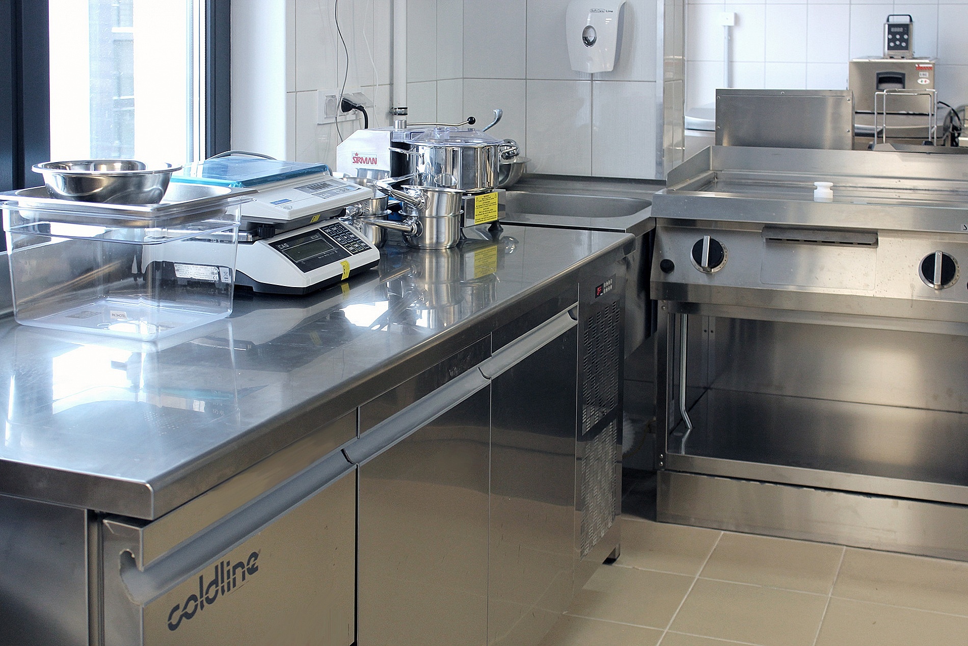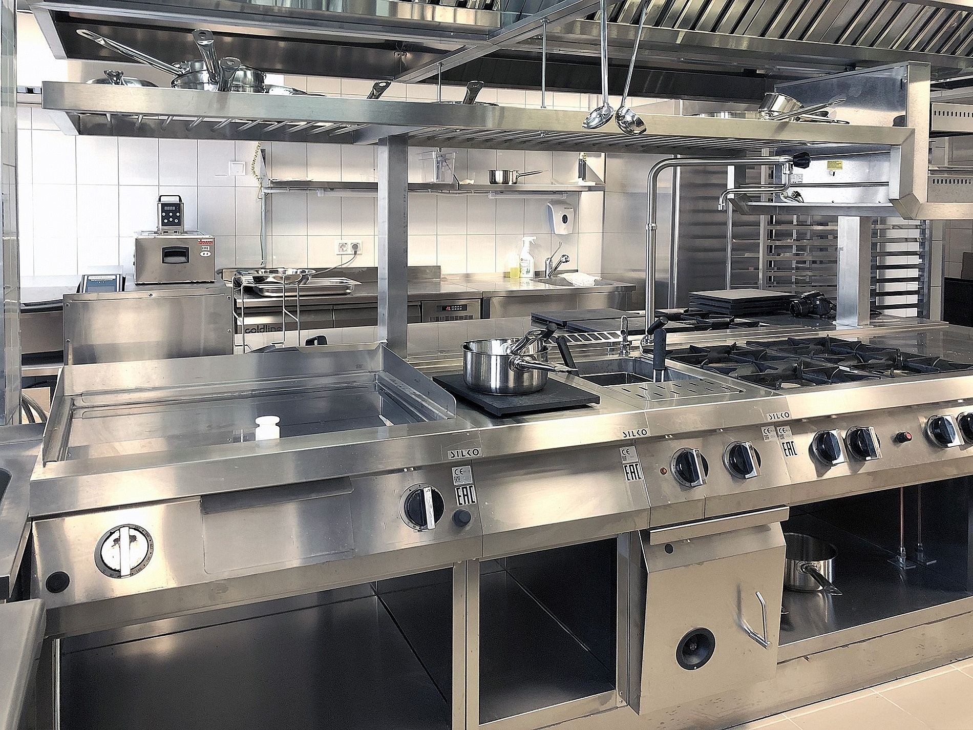 «Сердце» кухни — тепловой остров SILKO. Его изготавливали по индивидуальному заказу специально для клиента и учли все пожелания поваров гостиницы. Вот только несколько нюансов, которые являются показателями высокого класса техники: толстая нержавеющая сталь в основе конструкции, газовые горелки, безупречные стыковочные швы между рабочими поверхностями, округлая кромка бортиков столешницы (скошенные углы играют решающую роль для удобства, гигиены и безопасности персонала), второй уровень полок для гриля и инвентаря. Эти детали повышают стоимость и уровень профессионального кухонного оборудования.