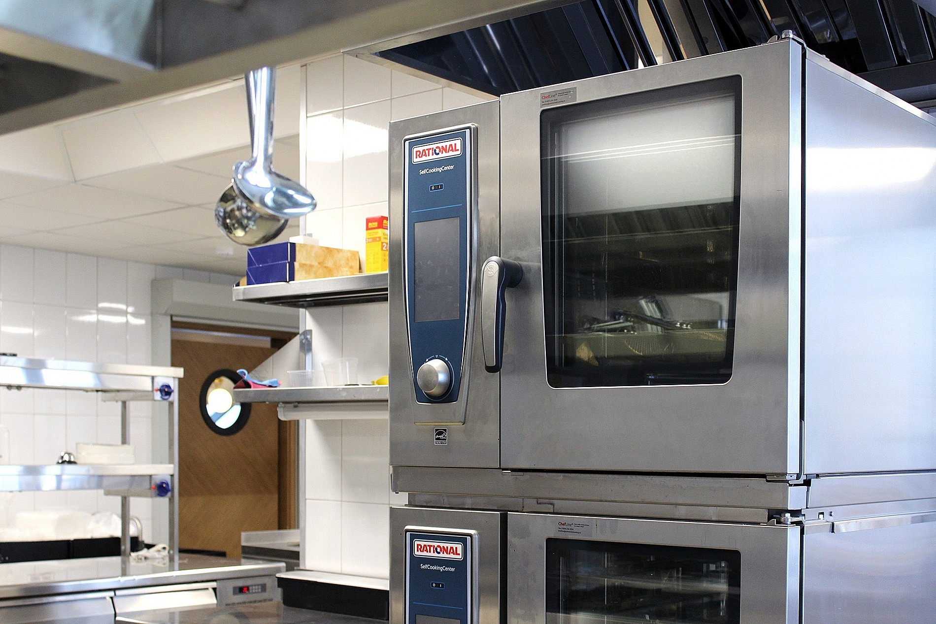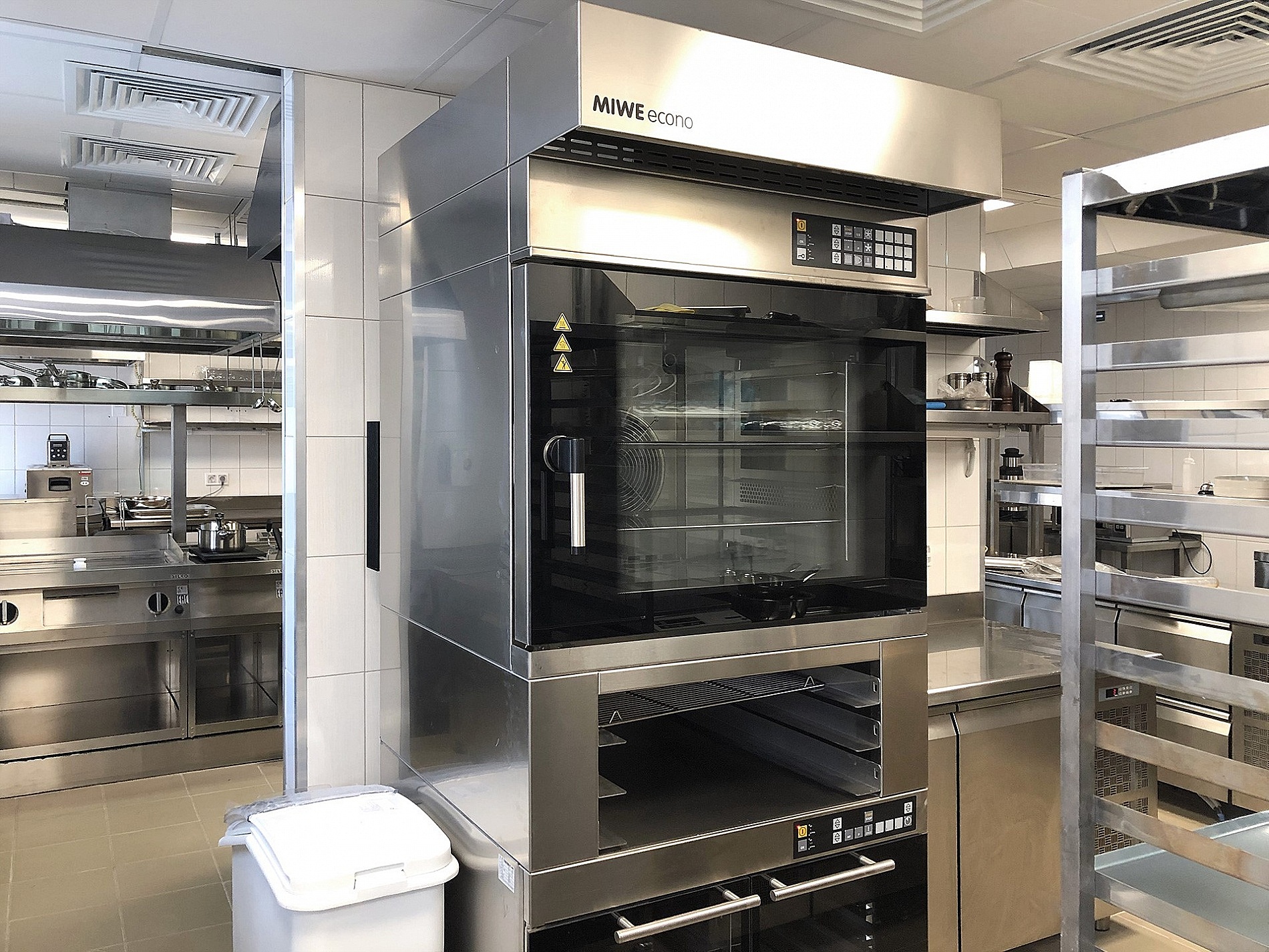 В дополнение к тепловому кухонному острову установлена «башня» из двух пароконвектоматов RATIONAL на 6 и 10 уровней. Для полного комплекта был приобретен многоцелевой центр RATIONAL VarioCookingCenter. С таким набором кухня свободно и без запары справится с банкетом на 100-150 человек.