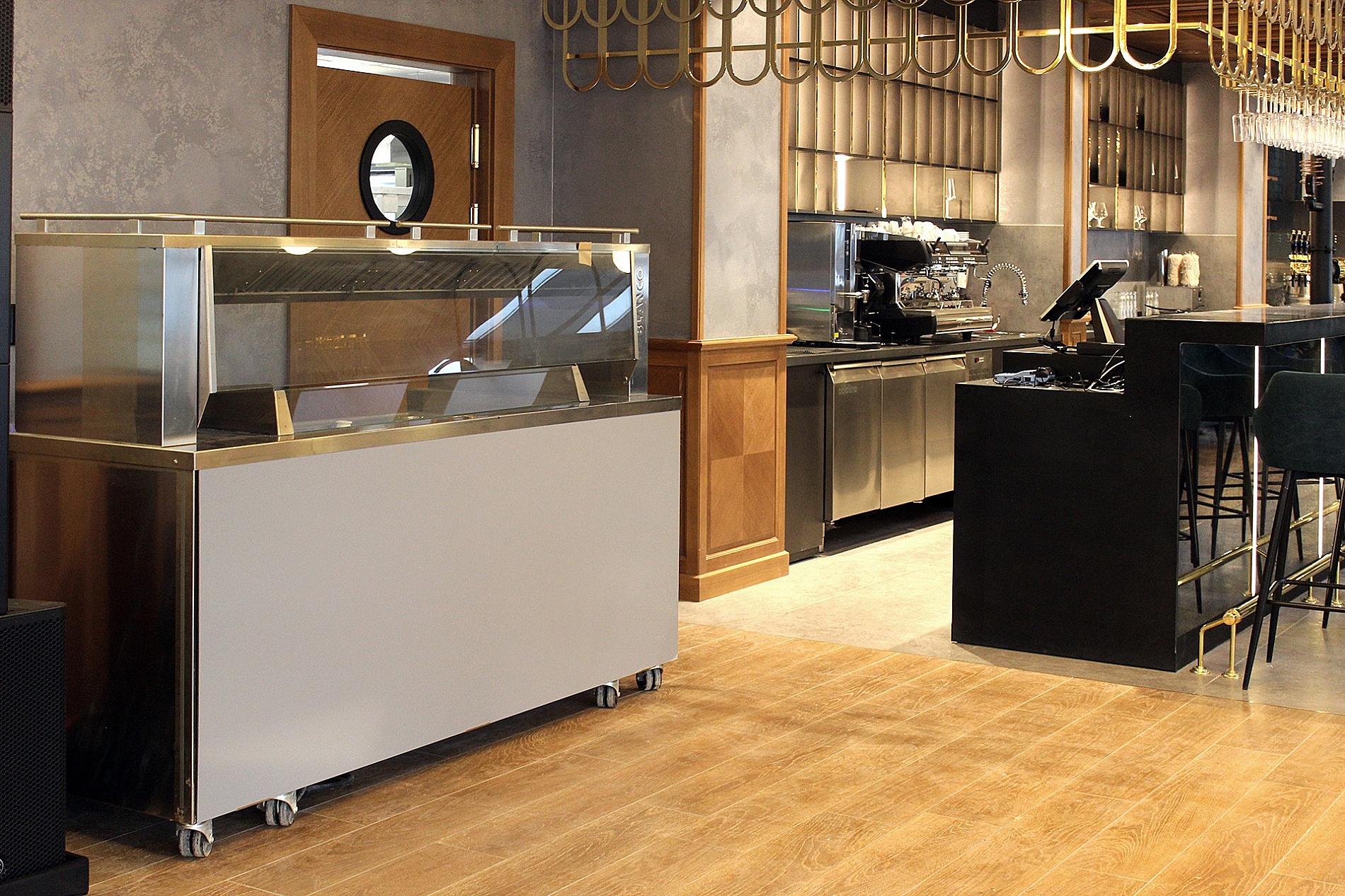 Для удобной сервировки и отдачи большого количества блюд напротив горячего цехи и двери в кухню выстроена стойка отдачи. Она состоит преимущественно из холодильных столов HICOLD и нейтральных металлических столов АЛТЭК из нержавейки с надстройкой второго уровня полок.