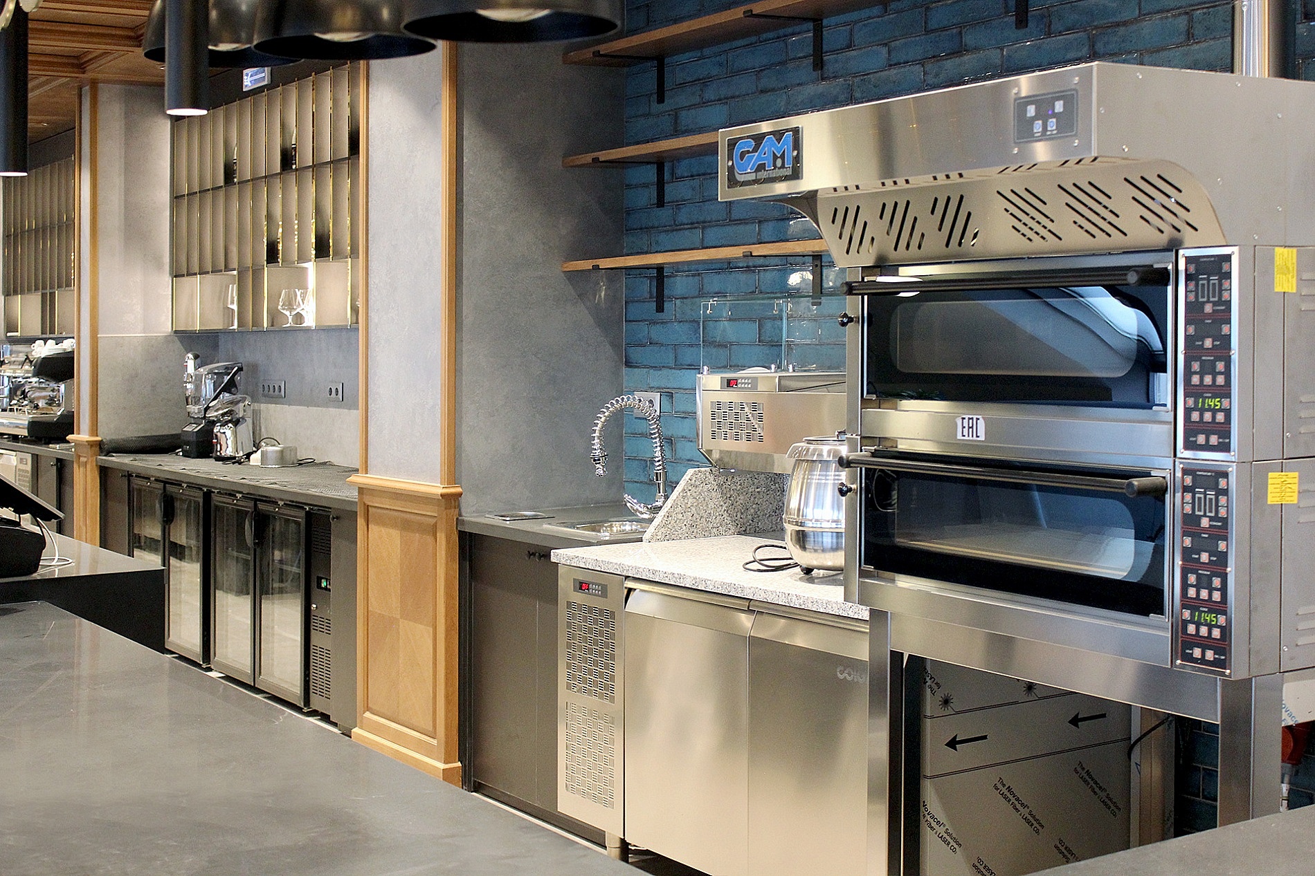 Отдельная зона посвящена пицце. Неожиданное для гостиницы решение (в ресторанах такое часто практикуется) — вынести пицца-печь GAMM за барную стойку. Благо, мощная вытяжная система позволяет такие планировочные экзерсисы. Гости могут видеть процесс приготовления пиццы, что создает элемент шоу и вызывает максимальное доверие к качеству блюд.