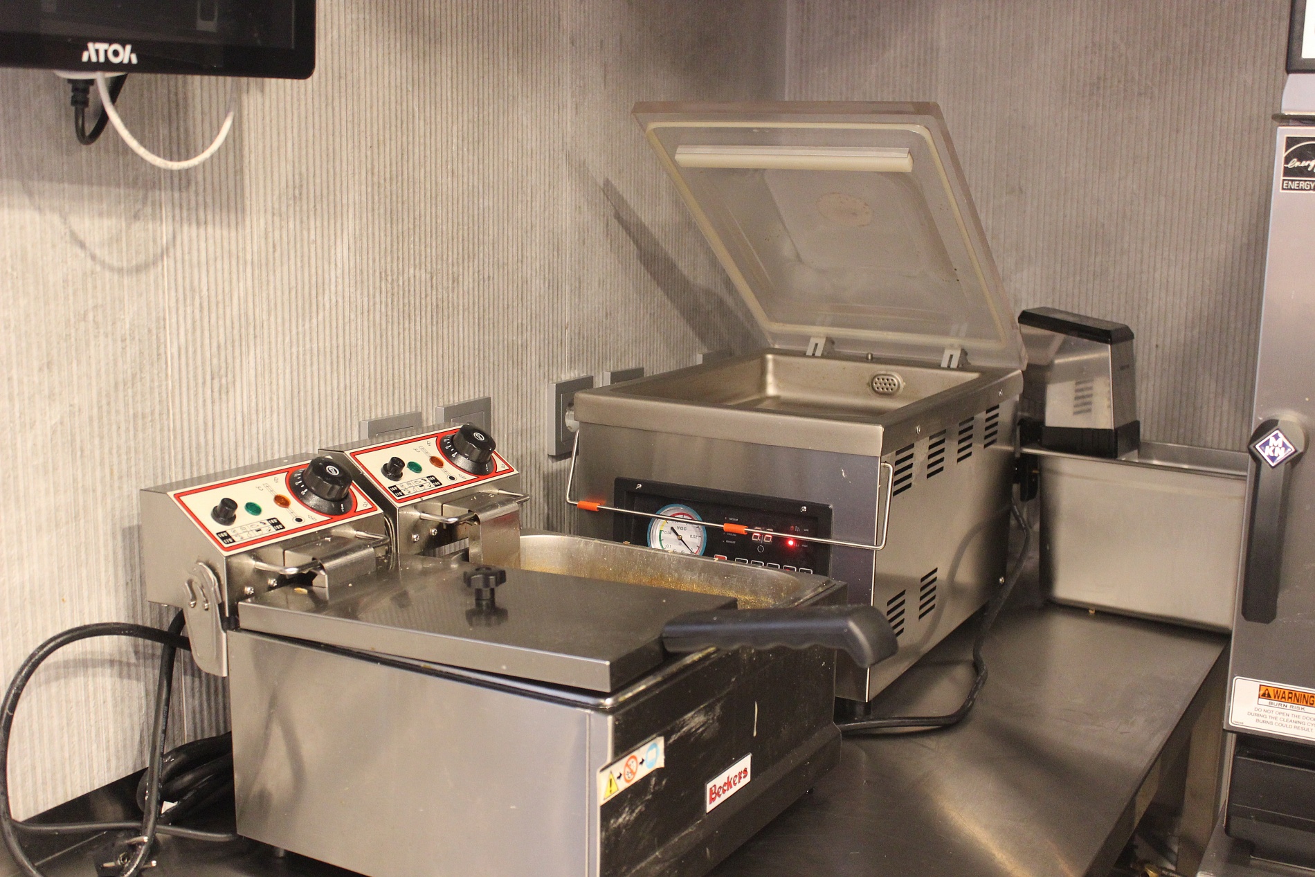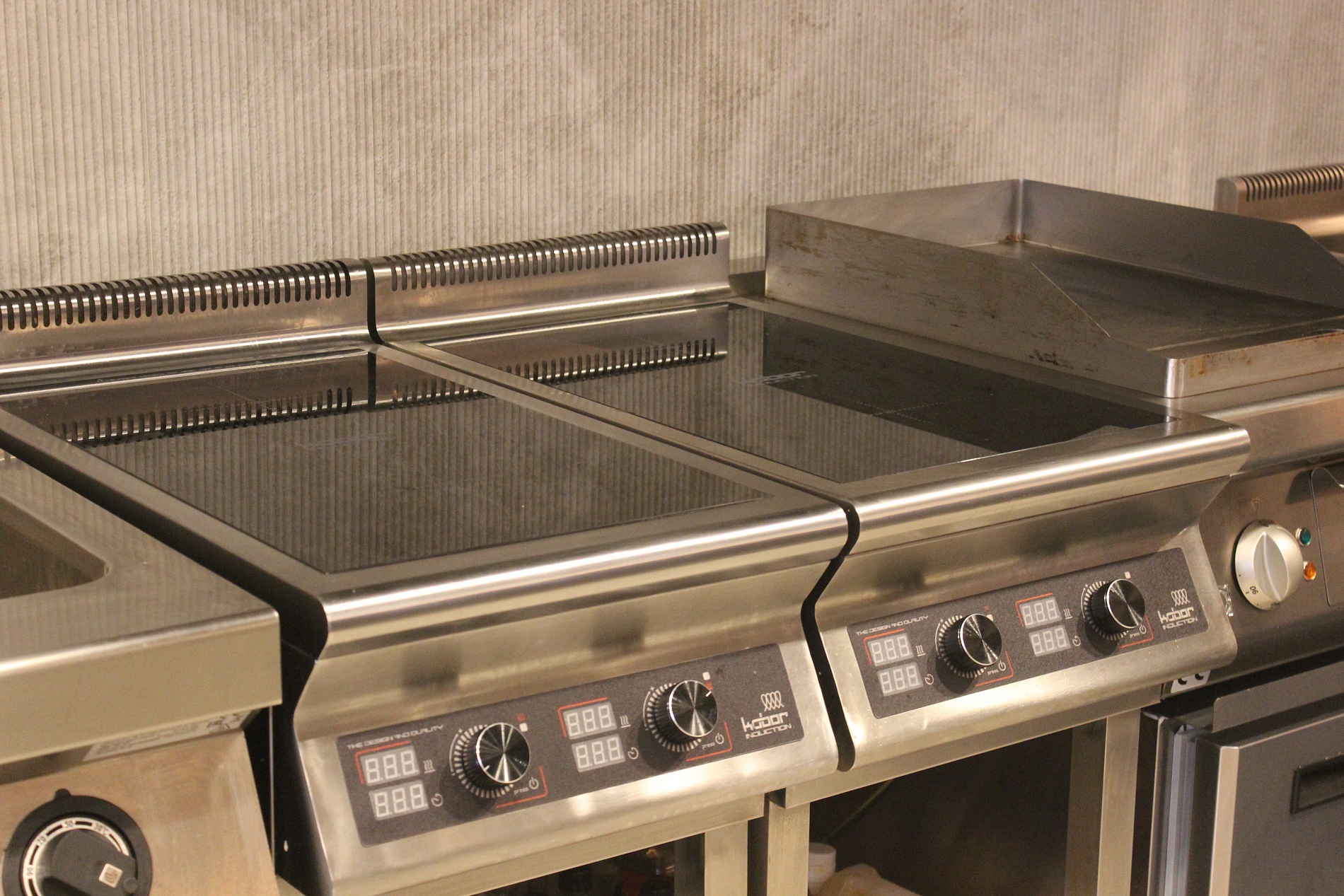 В горячем цехе установлены функциональные модули: макароноварка, электрическая фритюрница, индукционная WOK-плита и компактный пароконвектомат с системой автоматической мойки. Это даёт команде гибкость — от точной обработки морепродуктов до обжарки, варки и су-вид приготовления.