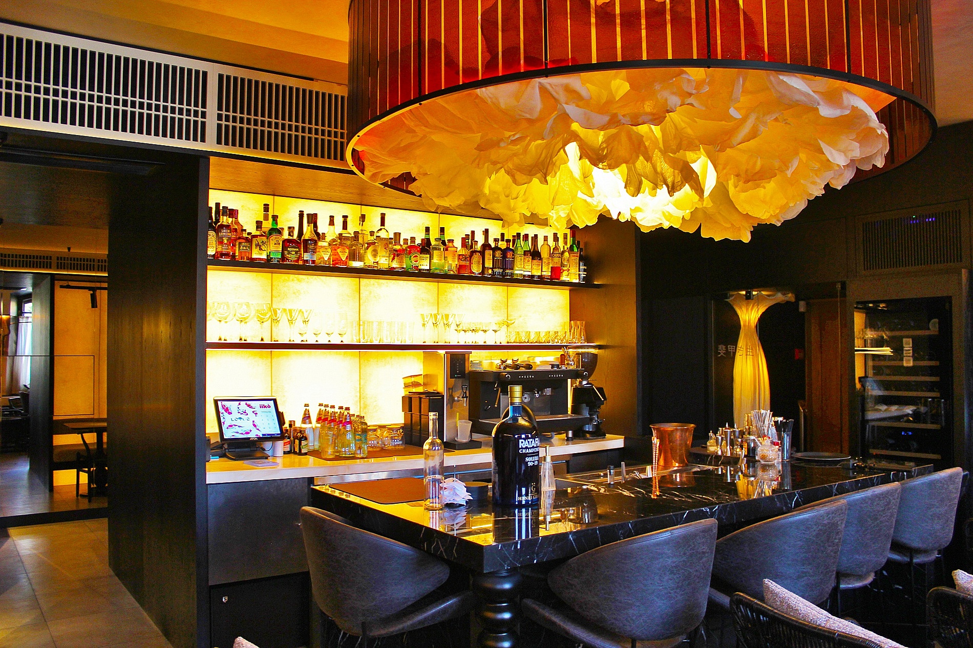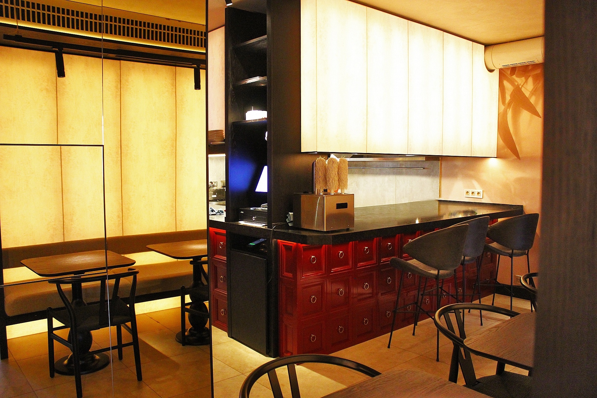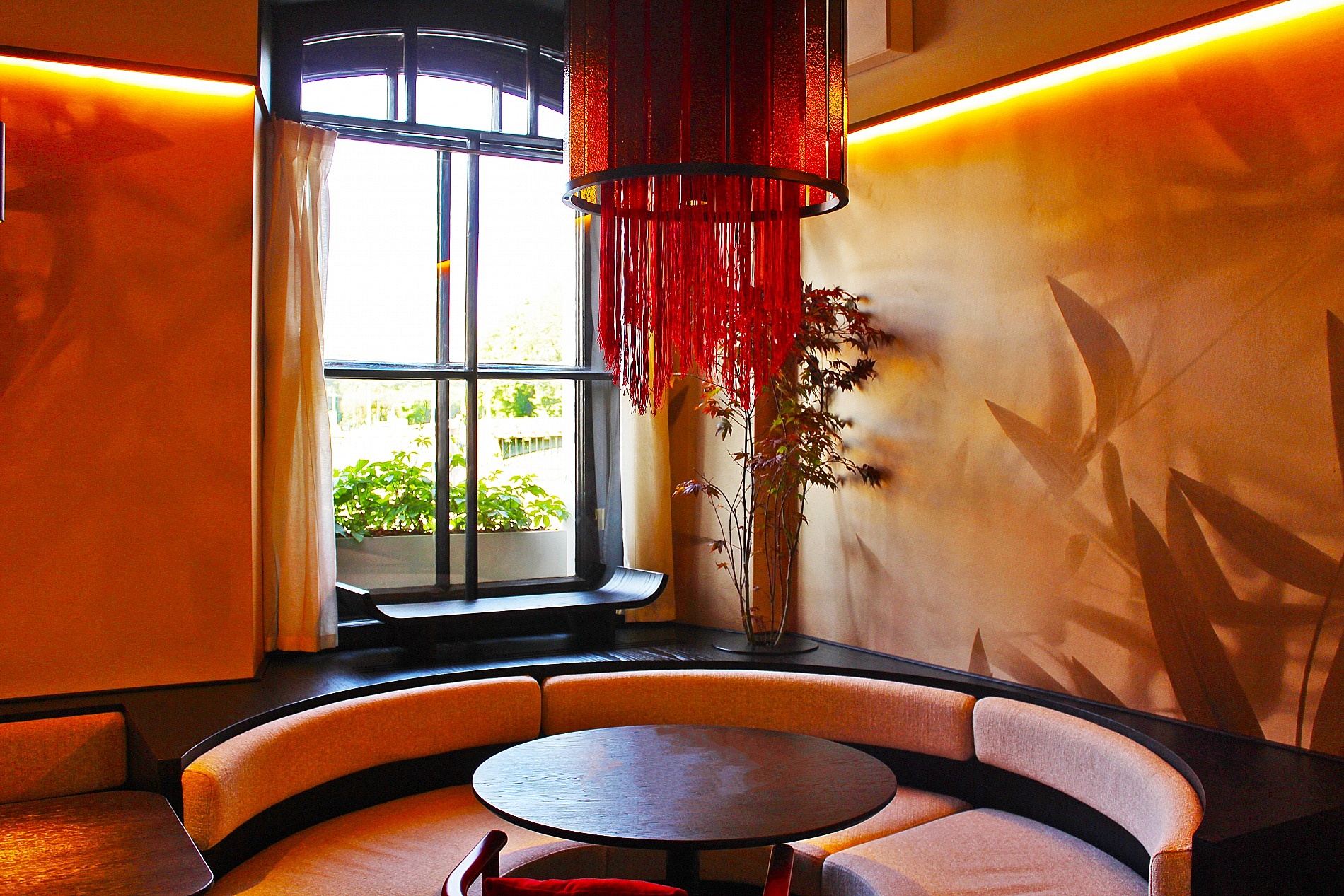 Пространство с богатой историей превратилось в изысканную «азиатскую шкатулку» благодаря дизайну студии UpToYou: глубокие чёрный, красный и золотой, изящество шинуазри и белоснежный лотос над барной стойкой.
