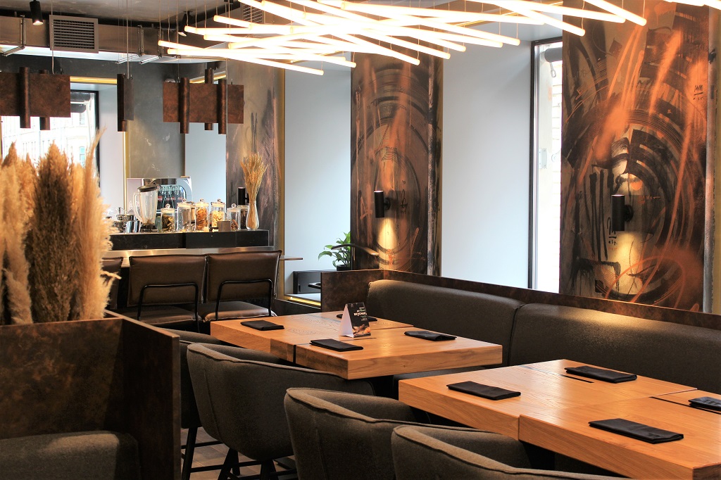 MUST – двухэтажный мясной ресторан на Большом проспекте Петроградской стороны, создателями которого выступила команда сети Bona Capona. Дизайном зала занималось архитектурное бюро DA Architects (Birch, «Сырник», Port, Gastroli, Made in China) и художник-каллиграфист Покрас Лампас. Интерьер получился суровый и минималистичный, но весьма стильный – под стать характеру кухни: серые стены с граффити, простые деревянные столешницы и стулья, обитые кожей. На второй этаж ведет лестница с противоречивой геометрией. Окна открывают вид на панораму Большого проспекта.