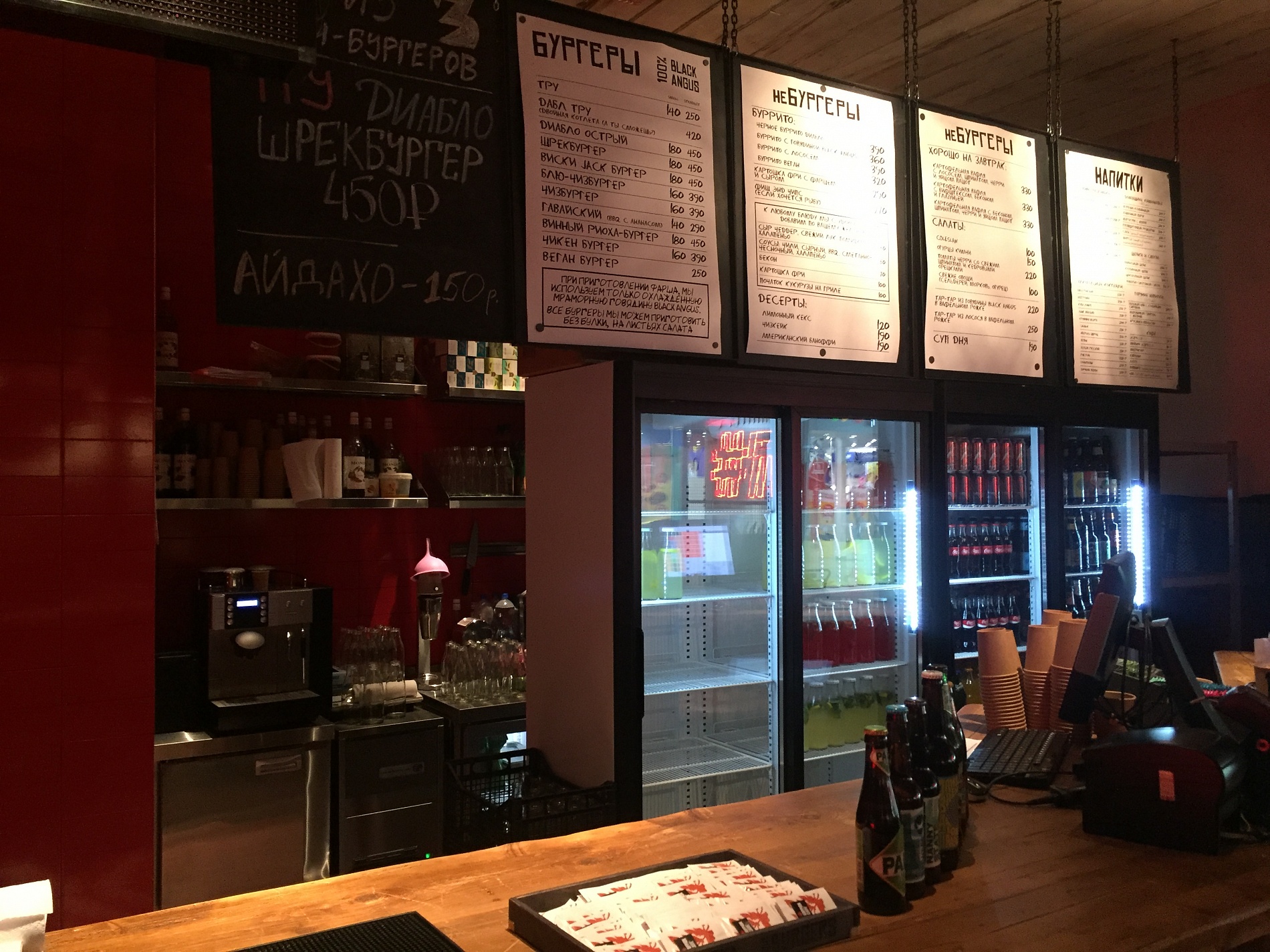 В дополнение к трапезе (к слову, кроме бургеров, в «Мясорубке» можно попробовать сытные вафли с тартаром и сэндвичи с пастрами) можно заказать пиво и сидр (их в меню порядка 25 вариантов), а также кофе, соки и молочные коктейли. Соответственно в барной зоне установлены: кофемашина FRANKE, кипятильник ANIMO, миксер для молочных коктейлей SIRMAN, соковыжималки VEMA и ROBOT COUPE, кубиковый льдогенератор NTF.