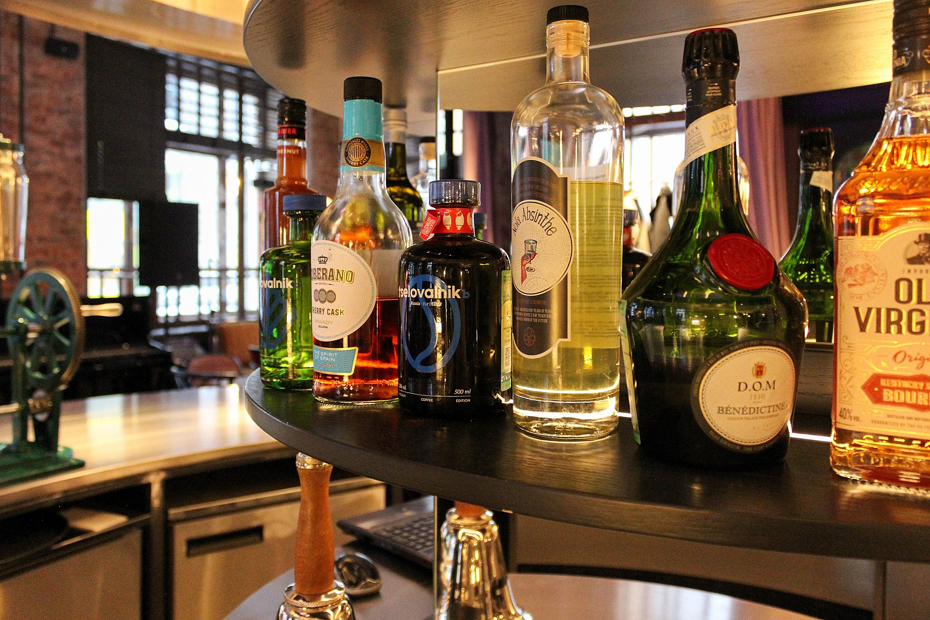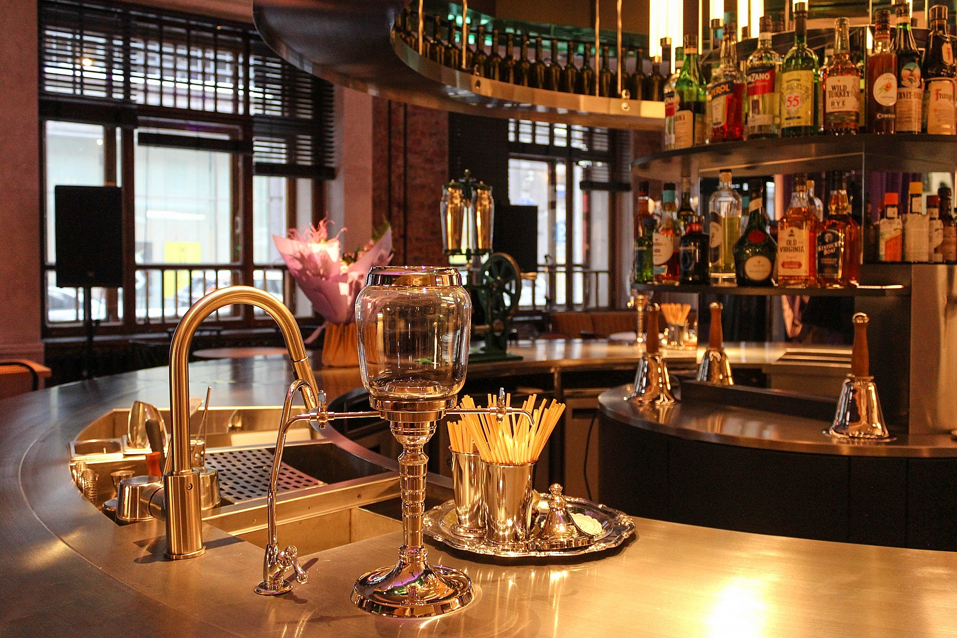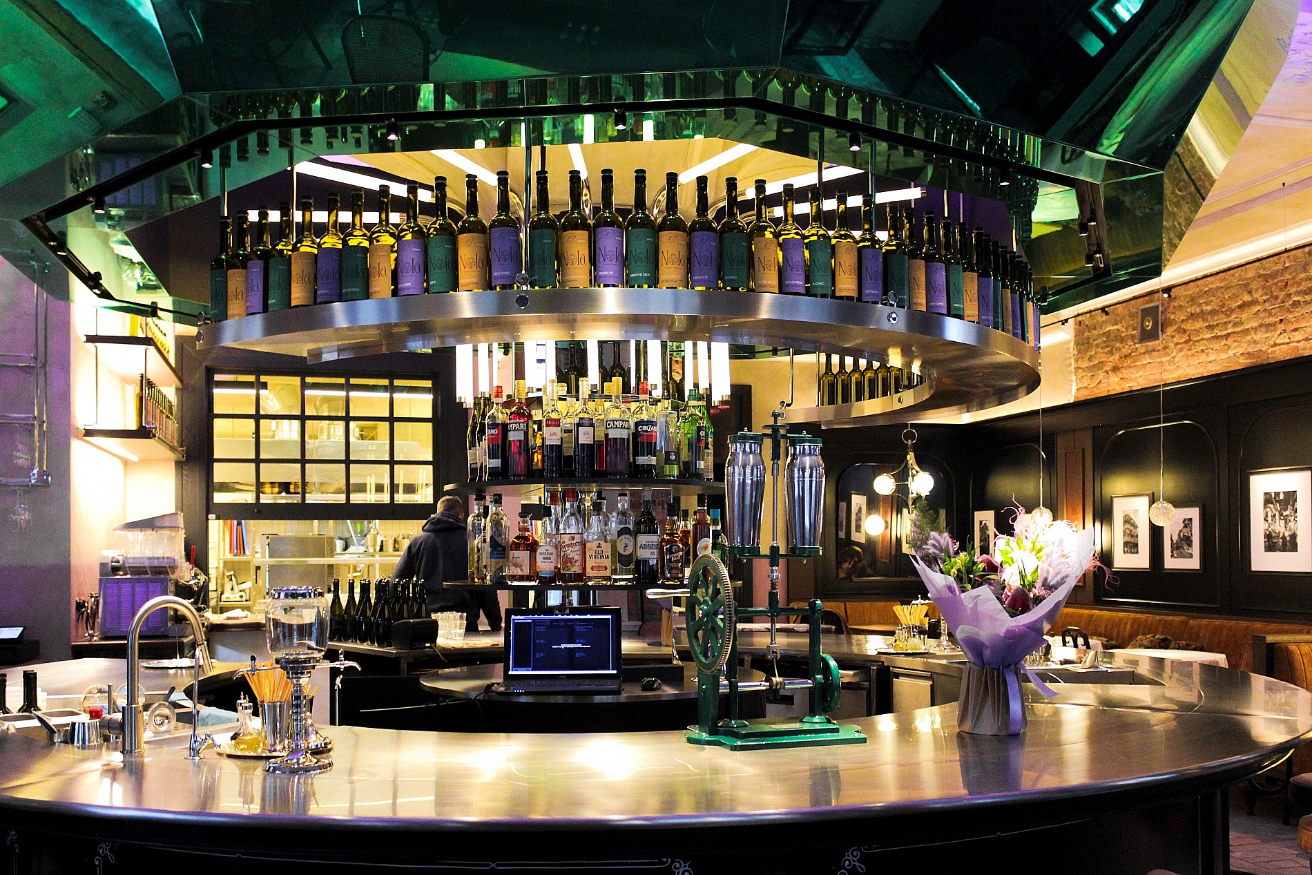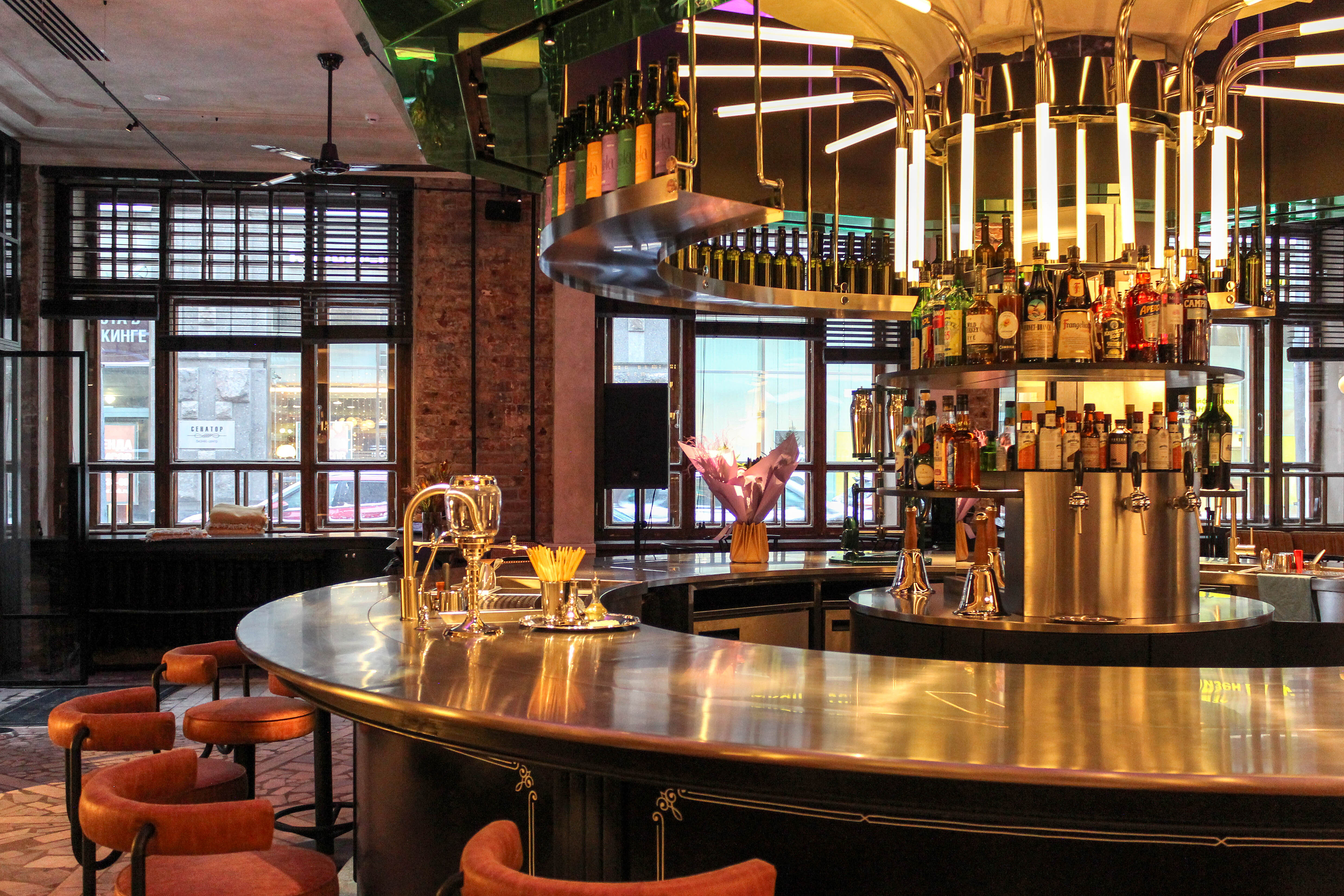 В центре зала идеальным по форме кругом вписан контактный бар, напоминающий классическую карусель, с вращающейся световой инсталляцией.
