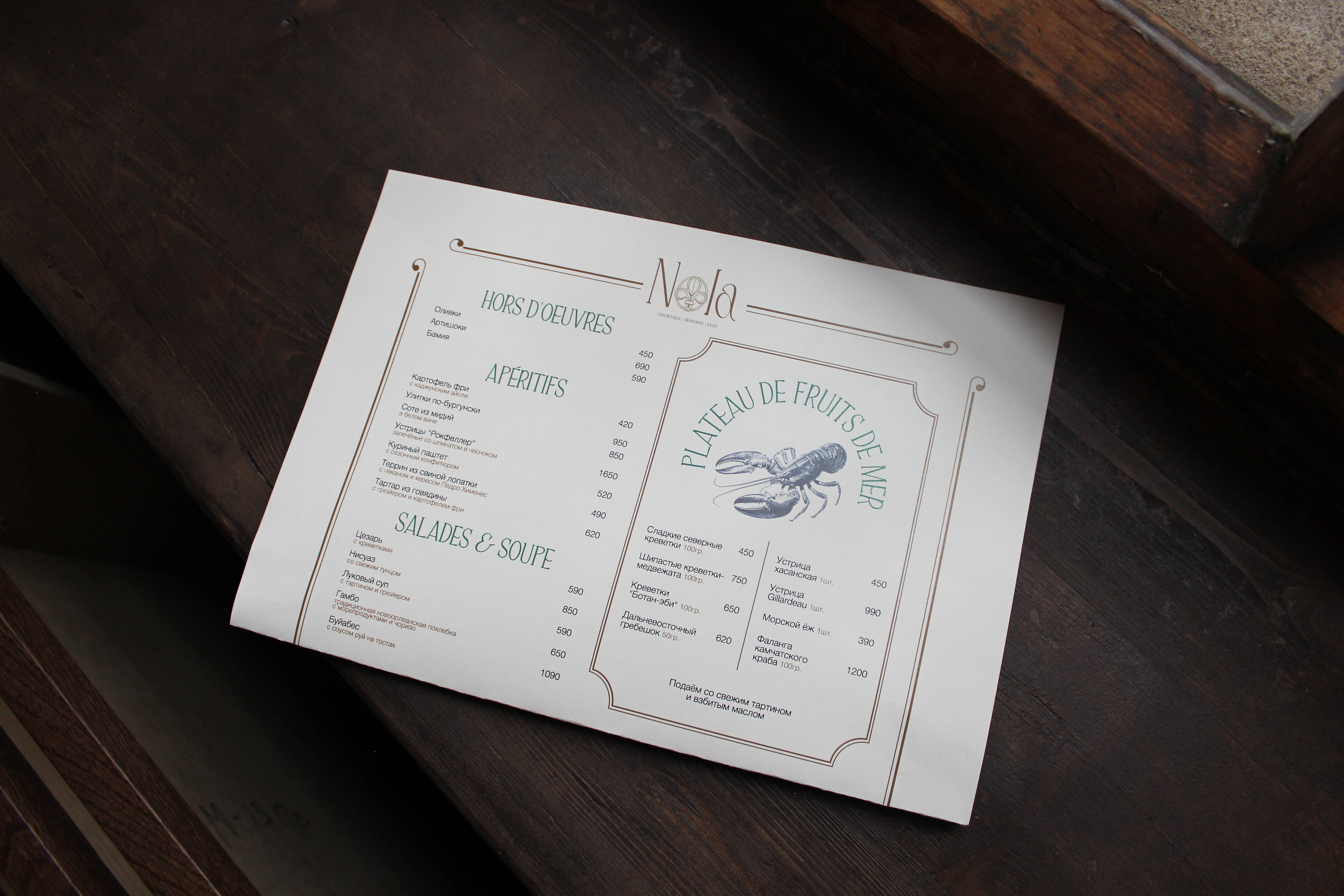 Кухню возглавил Алексей Ермаков (бренд-шеф El Copitas Bar, Tagliatella Caffe, Paloma Cantina). В меню на старте представлен луковый суп, новоорлеанская похлебка с морепродуктами и чоризо, устричный сэндвич по-бой, родственница испанской паэльи — джамбалайя, запеченные устрицы и французские булочки бенье.